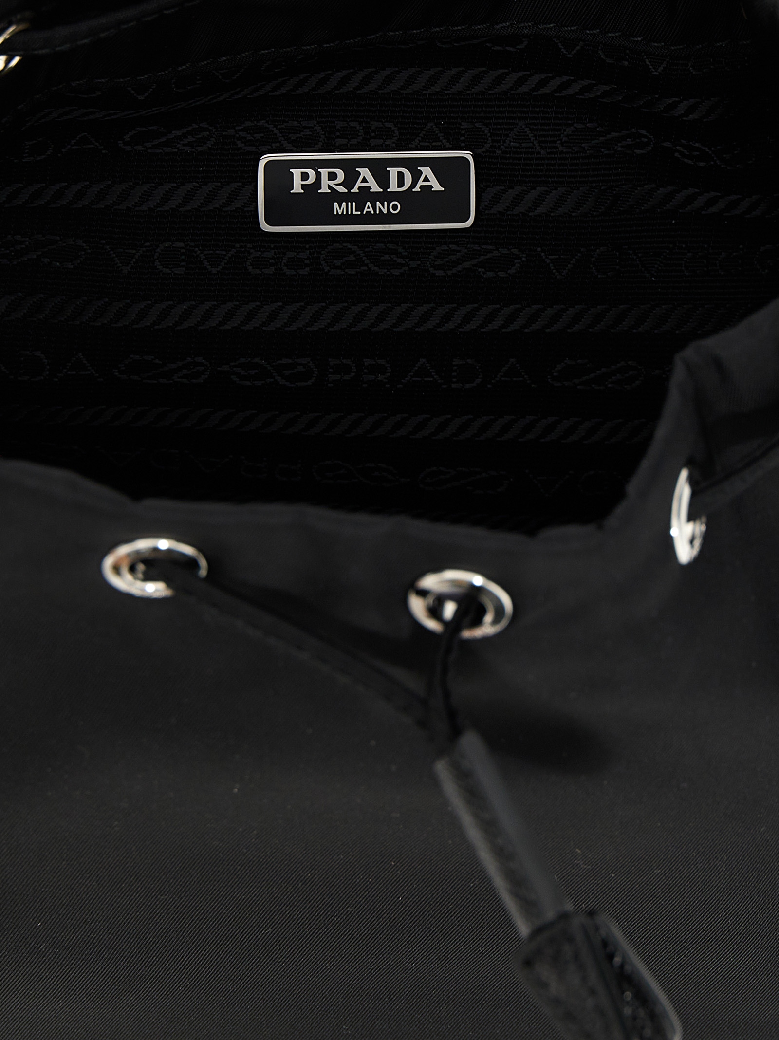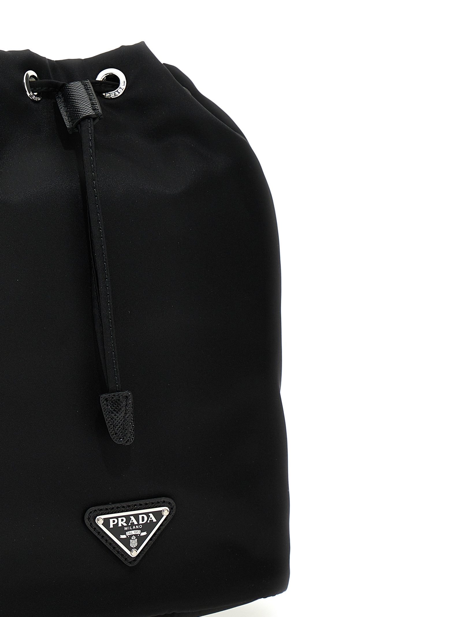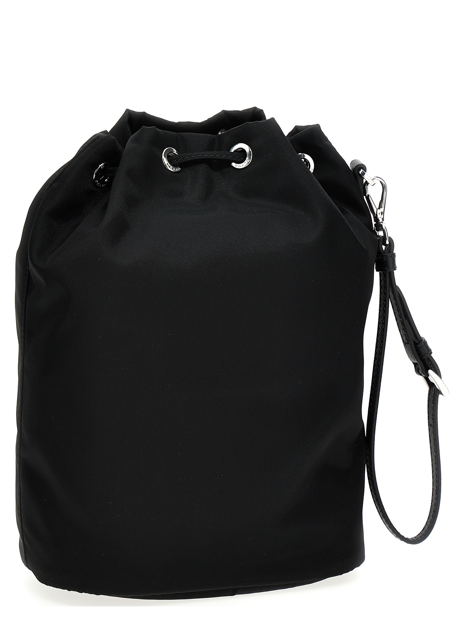 Re-nylon bucket bag with drawstring closure, removable wristlet and a triangle metal logo. JULIAN SUSTAINABLE