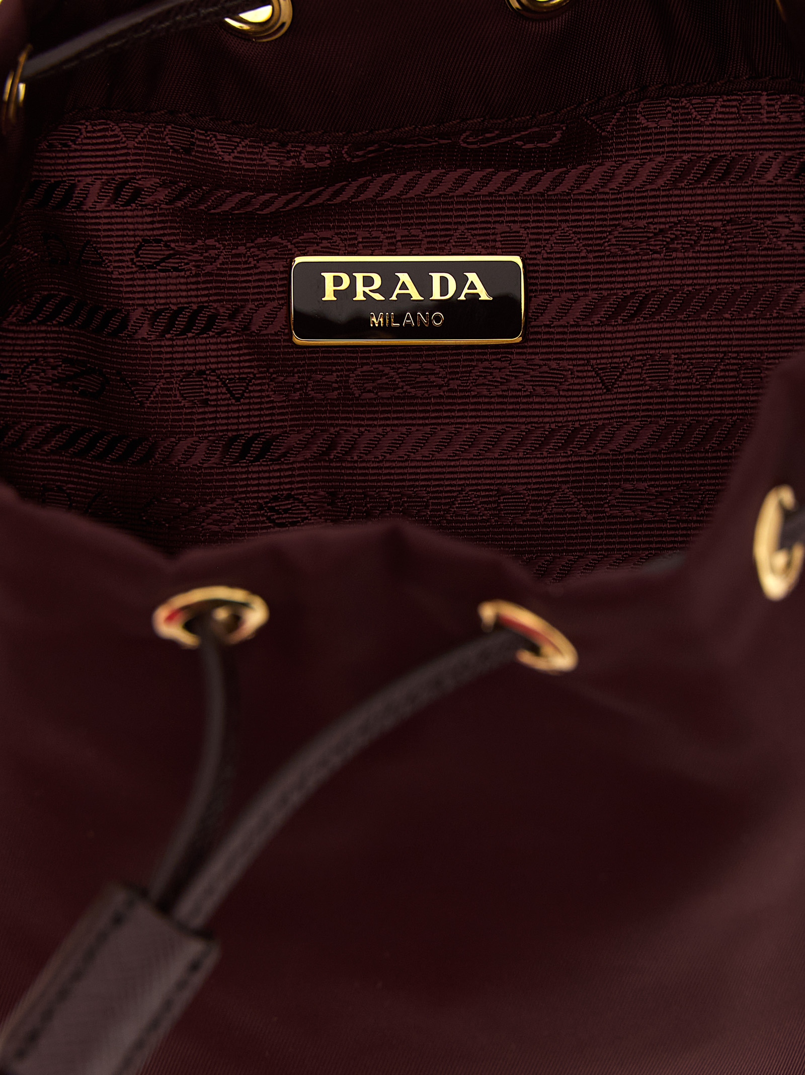 Re-Nylon bucket bag with Saffiano leather details, front enameled metal triangle logo, drawstring closure, removable wristlet.