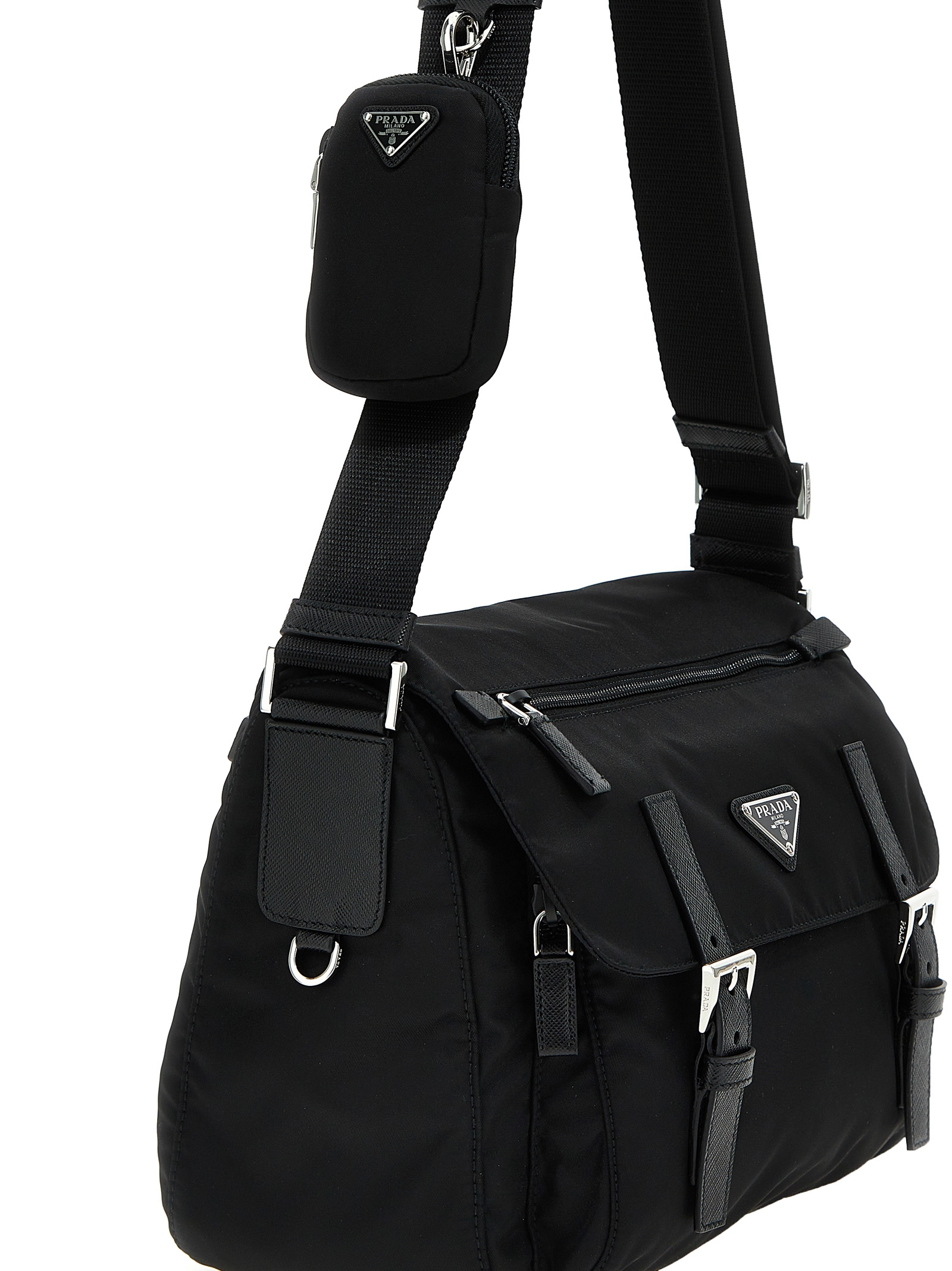 Re-nylon crossbody bag with flap closure with buckles, triangle logo detail, top pocket zip closure and awith adjustable shoulder strap with trick. JULIAN SUSTAINABLE