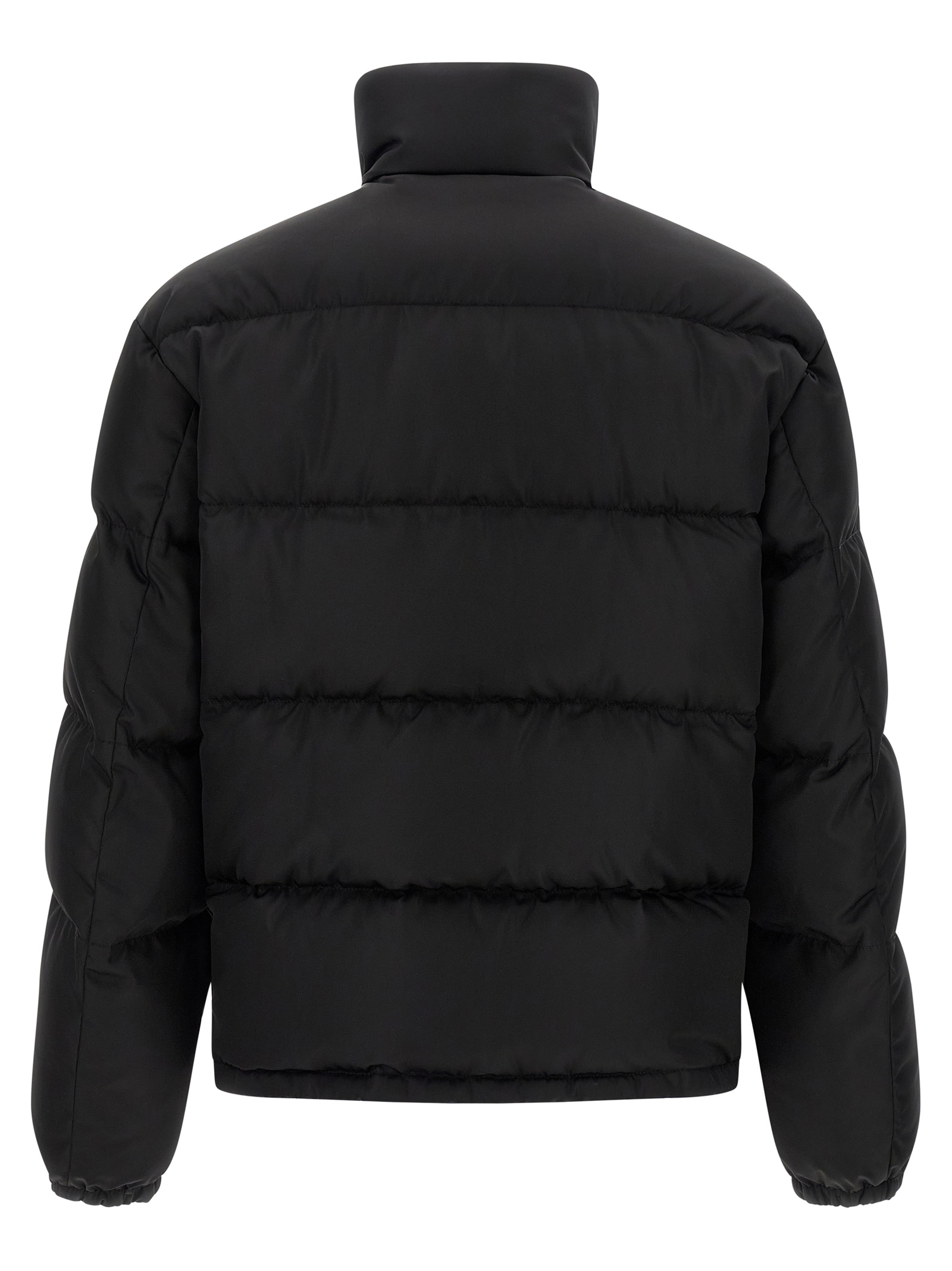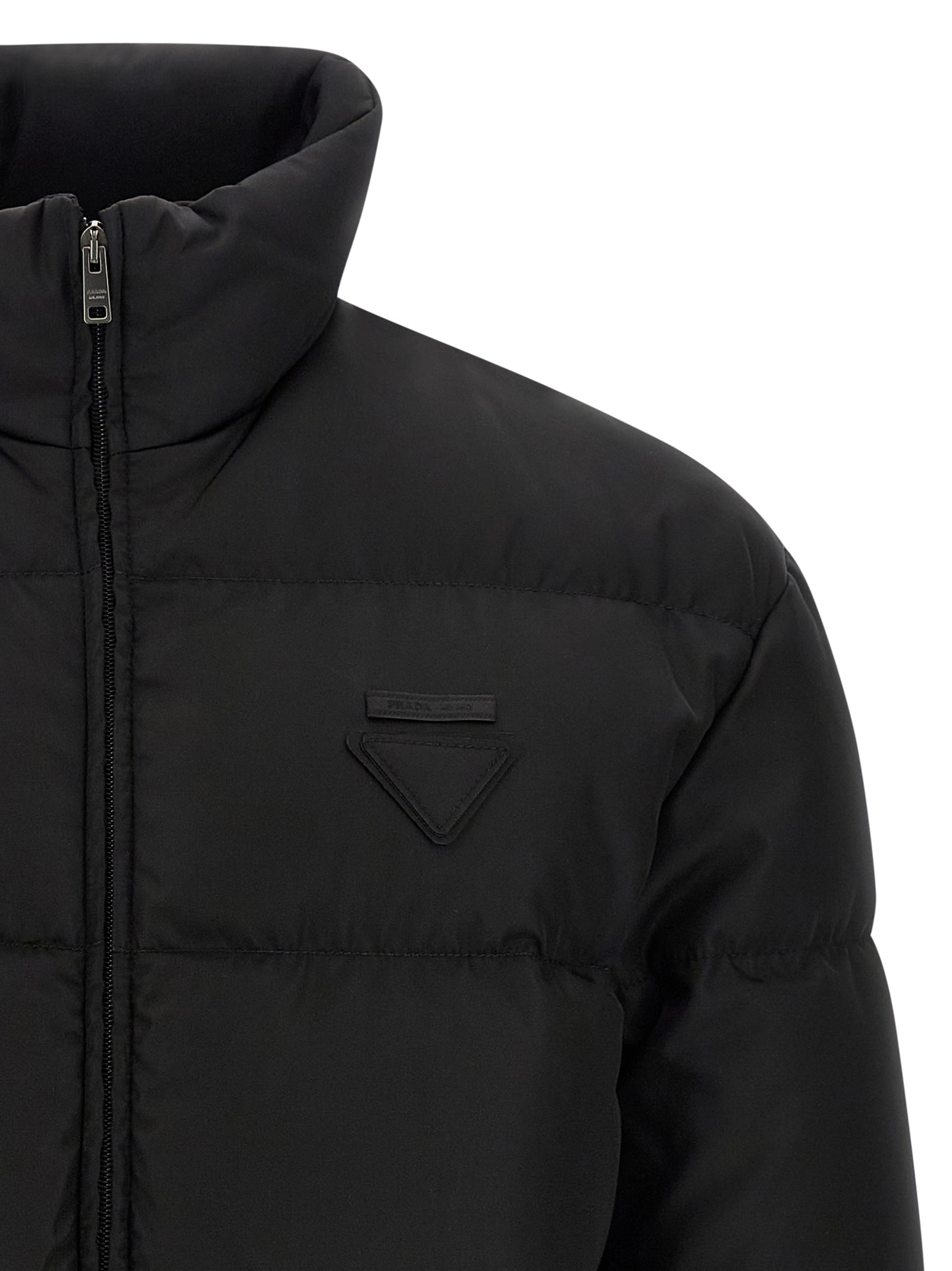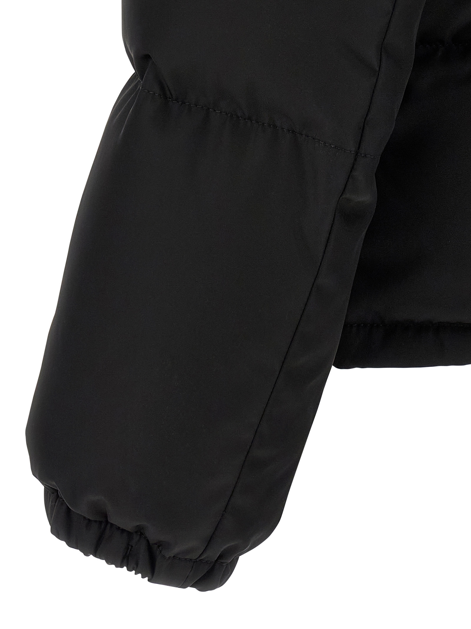 Quilted Re-Nylon down jacket with goose feather padding, triangle logo in tone-on-tone fabric and front zip closure, high neck, pockets, long sleeves with elastic cuffs, drawstring on the hem.