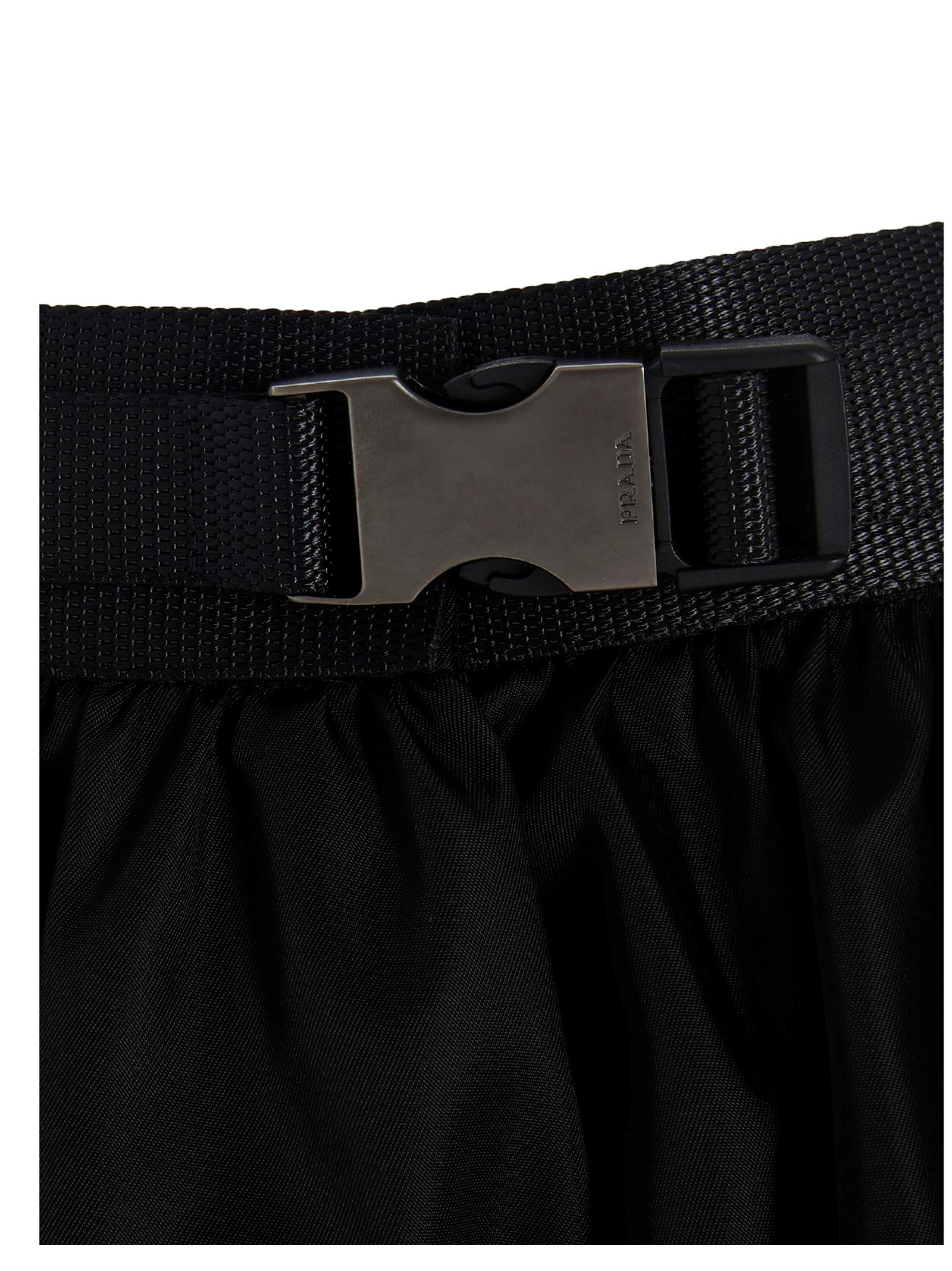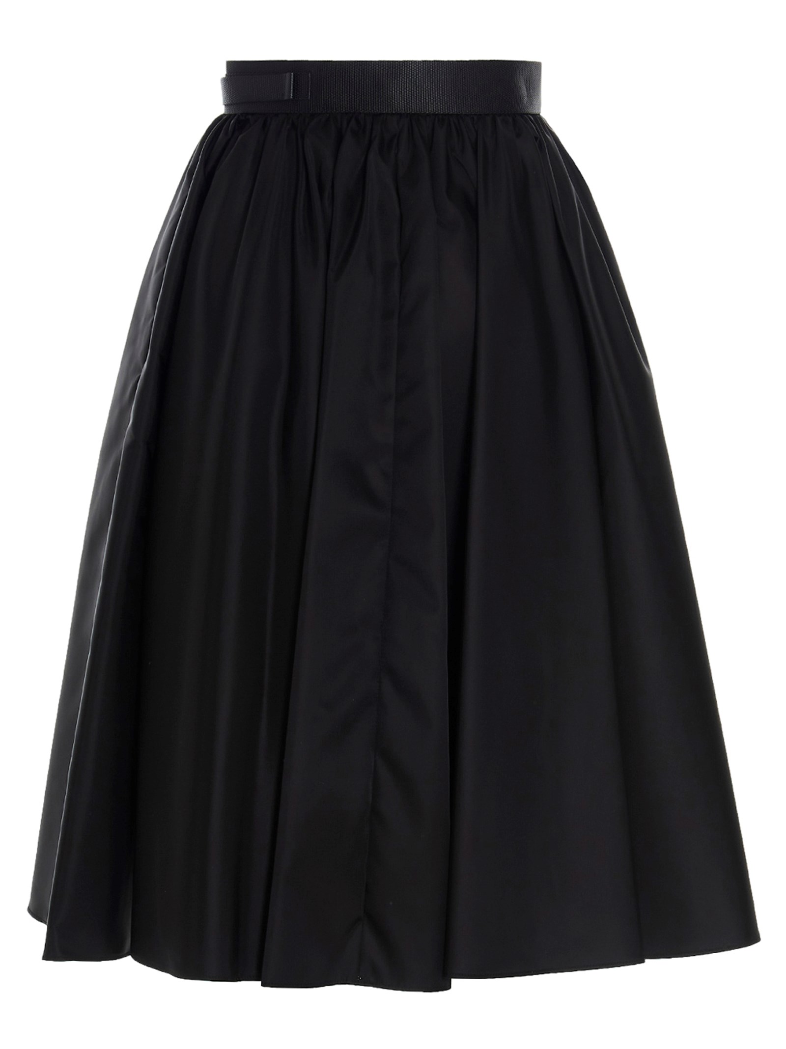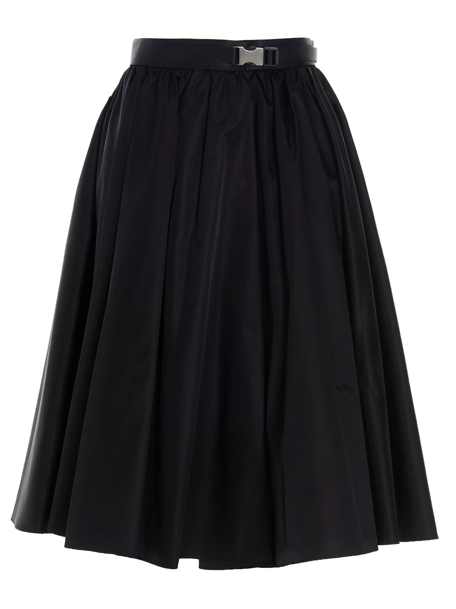 Prada full skirt in iconic re-nylon fabric, regular waist, ribbon belt with logo buckle. No lining. JULIAN SUSTAINABLE: This article is partially made in ‘Re-Nylon’, a recycled nylon fabric made from plastic waste collected from oceans.