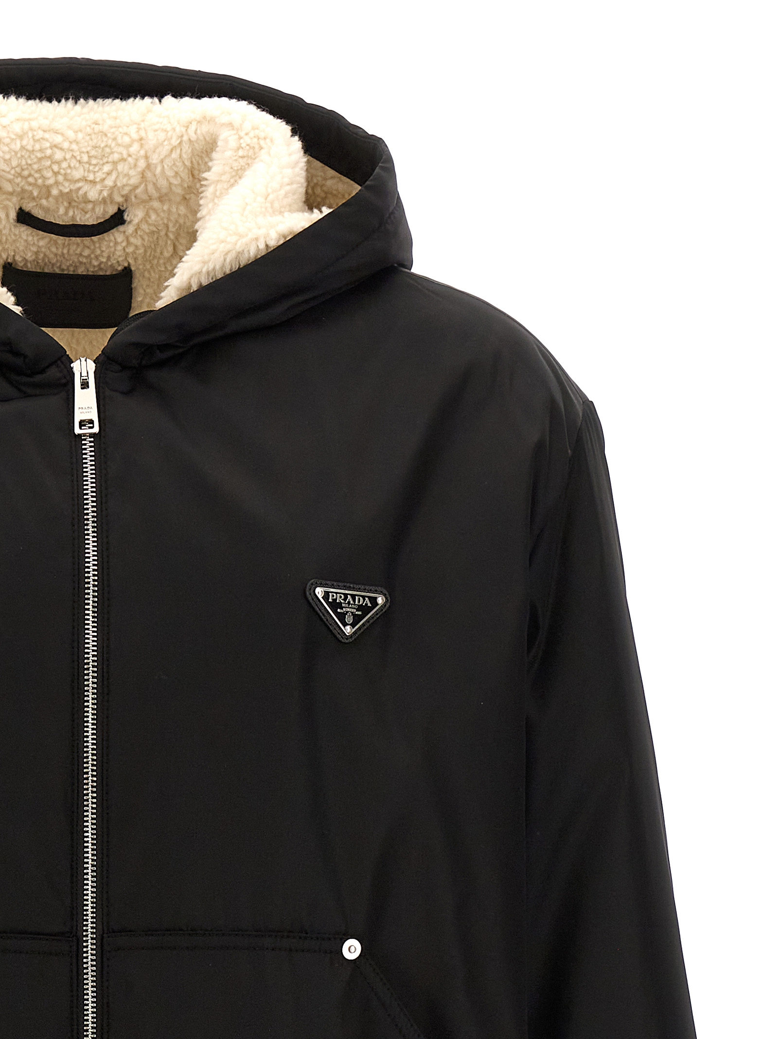 ‘Re-Nylon’ hooded jacket with fur lining, front zip closure, pockets, elastic waistband and cuffs.