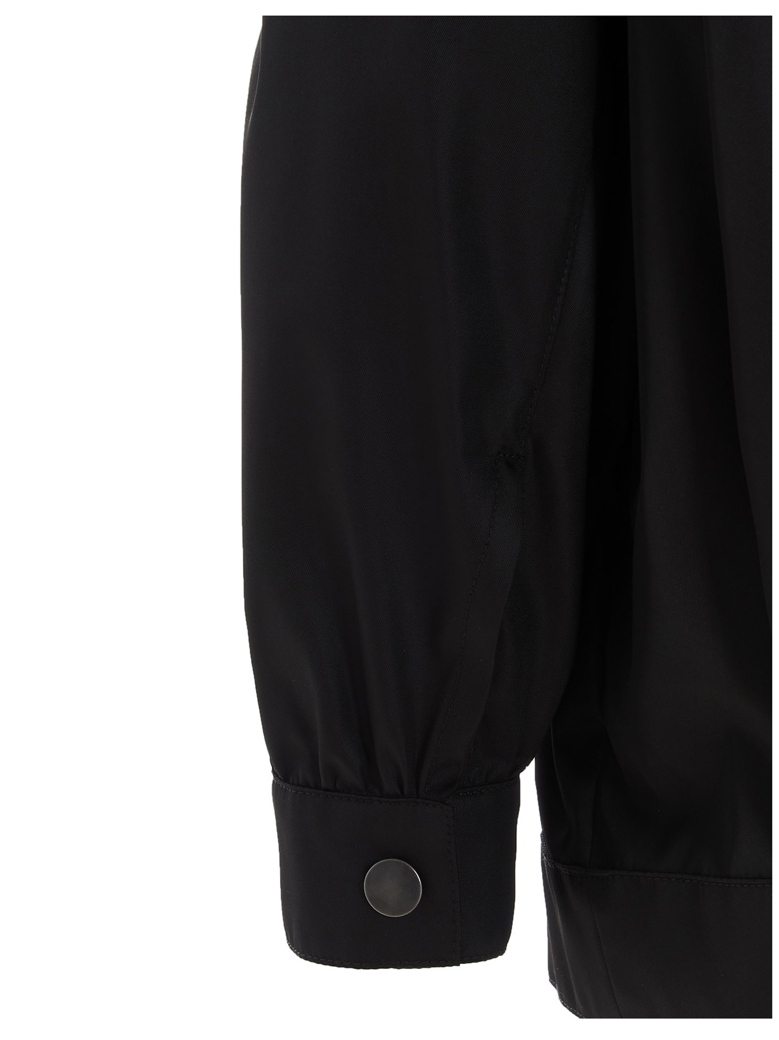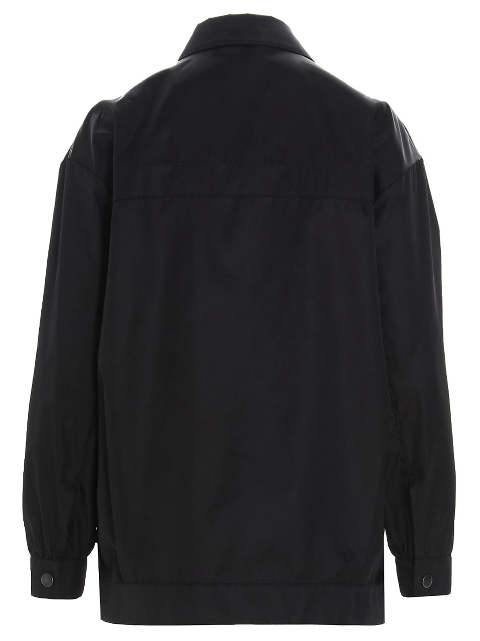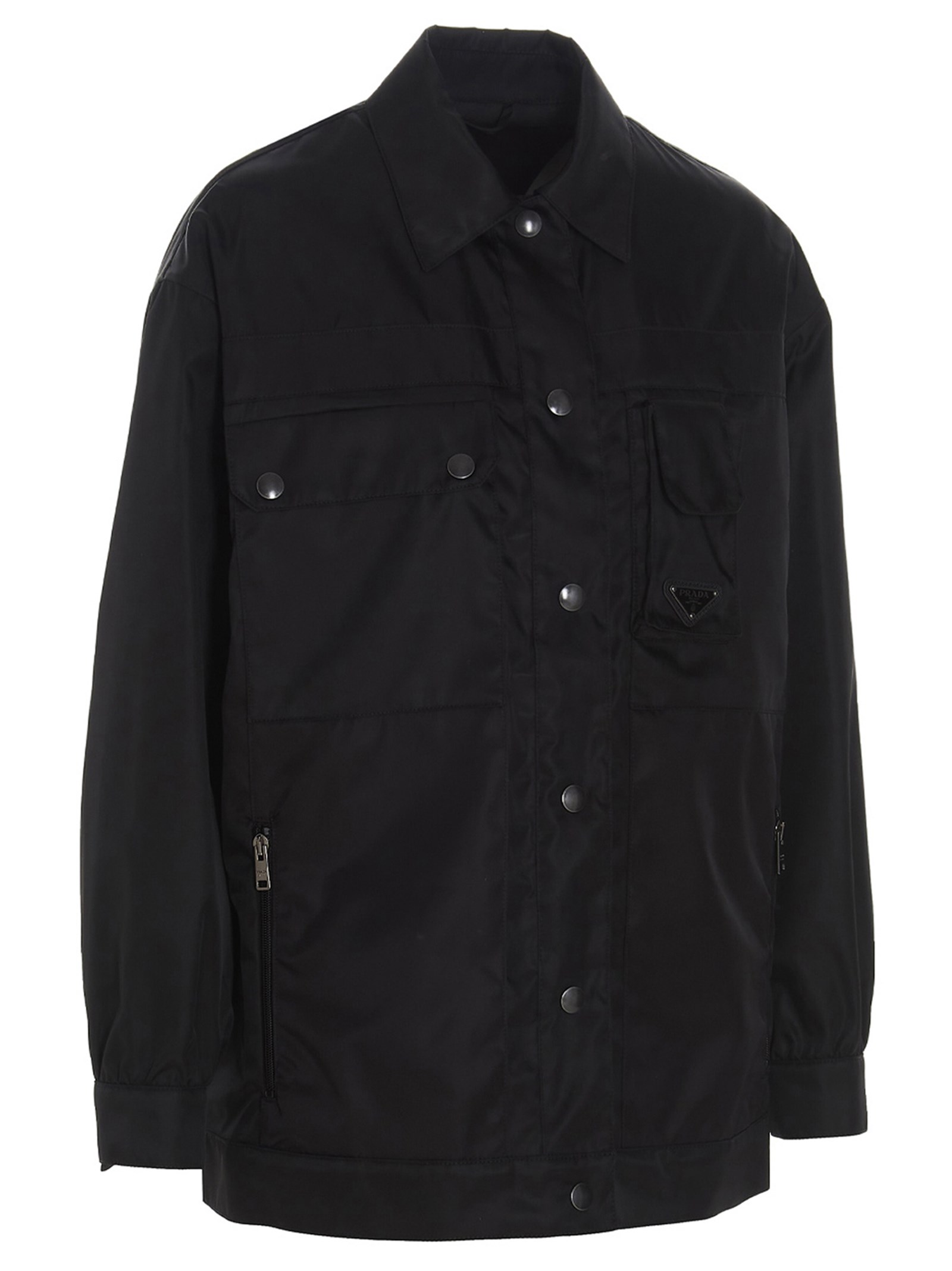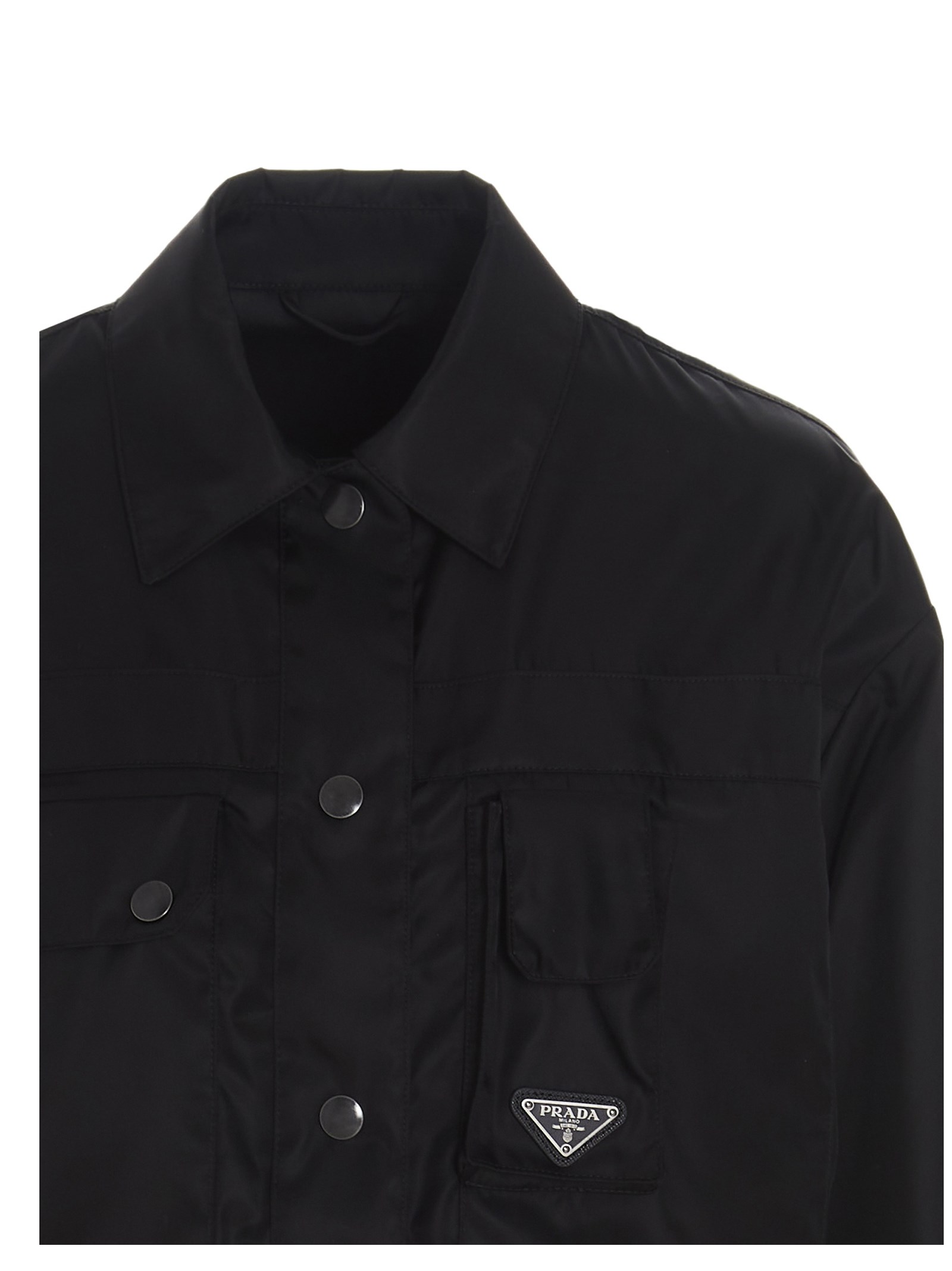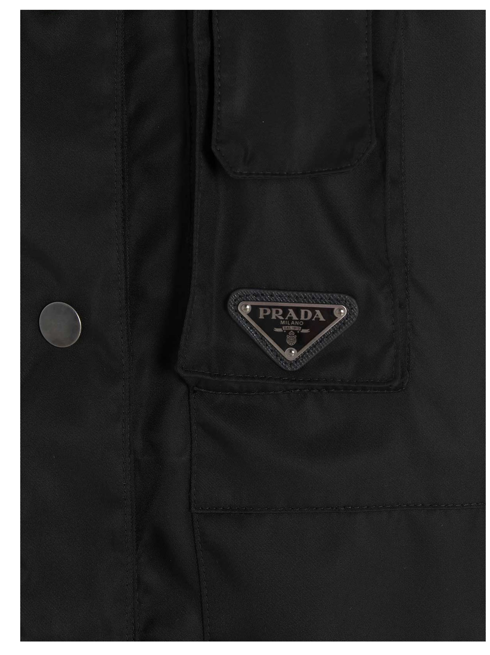 Prada re-nylon jacket with snap buttons, collar and chest mobile phone chest pocket with a triangle metal logo. JULIAN SUSTAINABLE: This article is partially made in ‘Re-Nylon’, a recycled nylon fabric made from plastic waste collected from oceans.