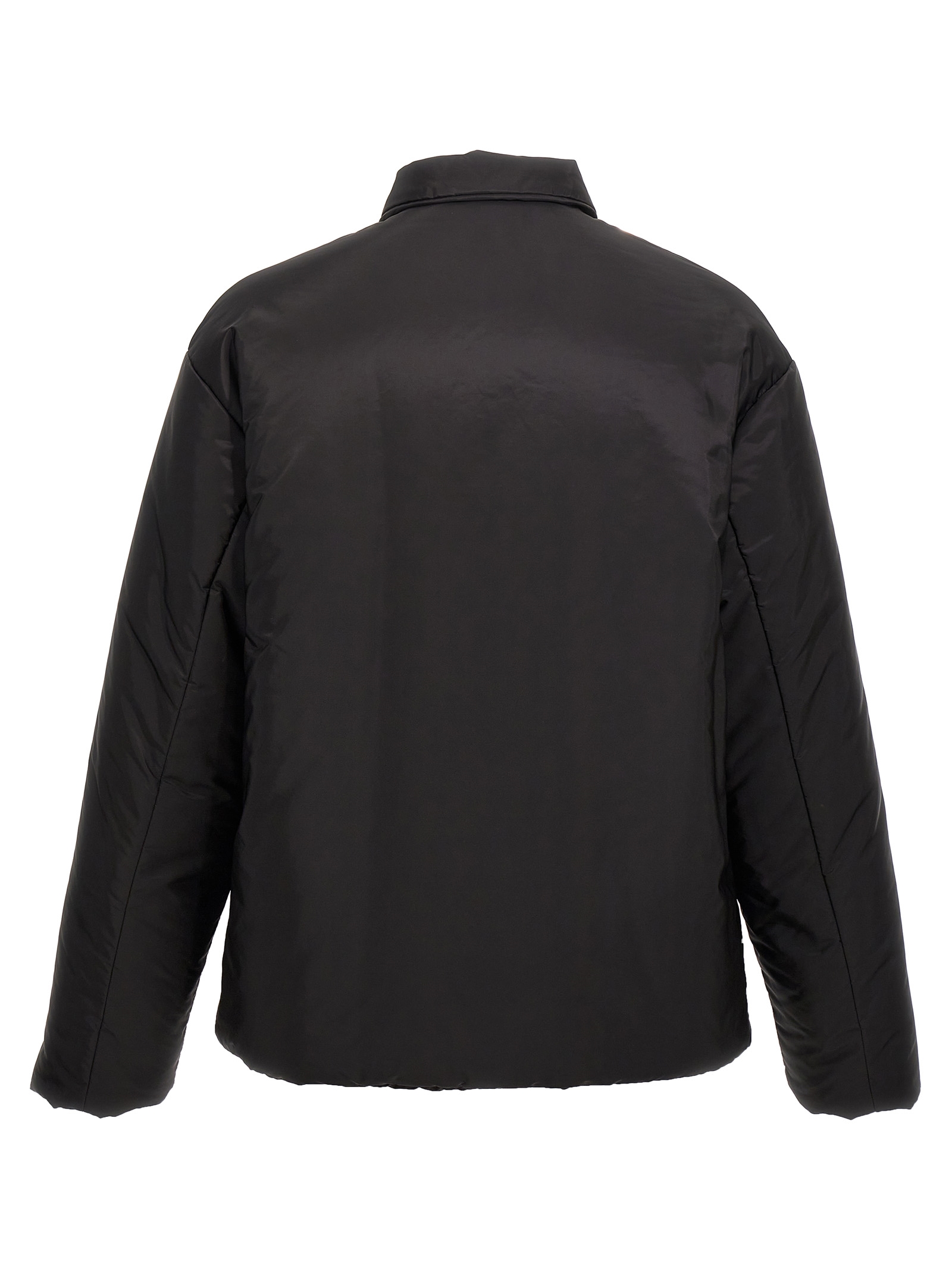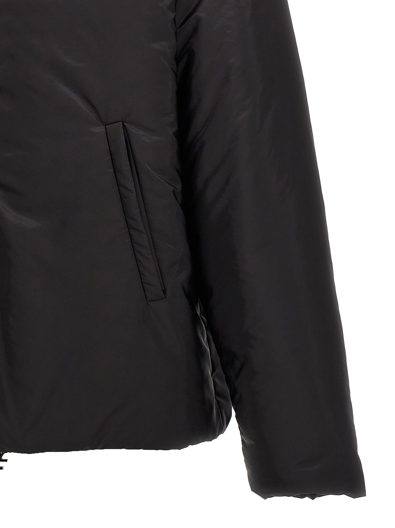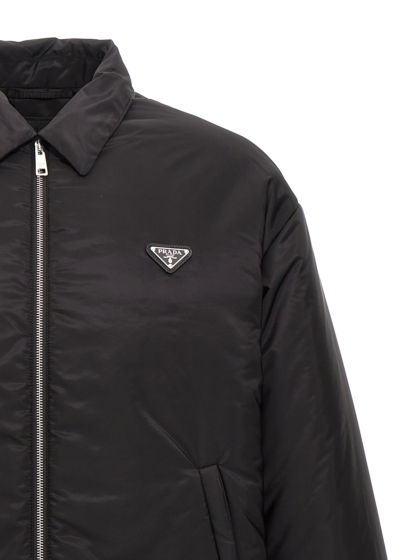 Re-Nylon down jacket with enameled metal triangle logo, zip closure, pockets, long sleeves.