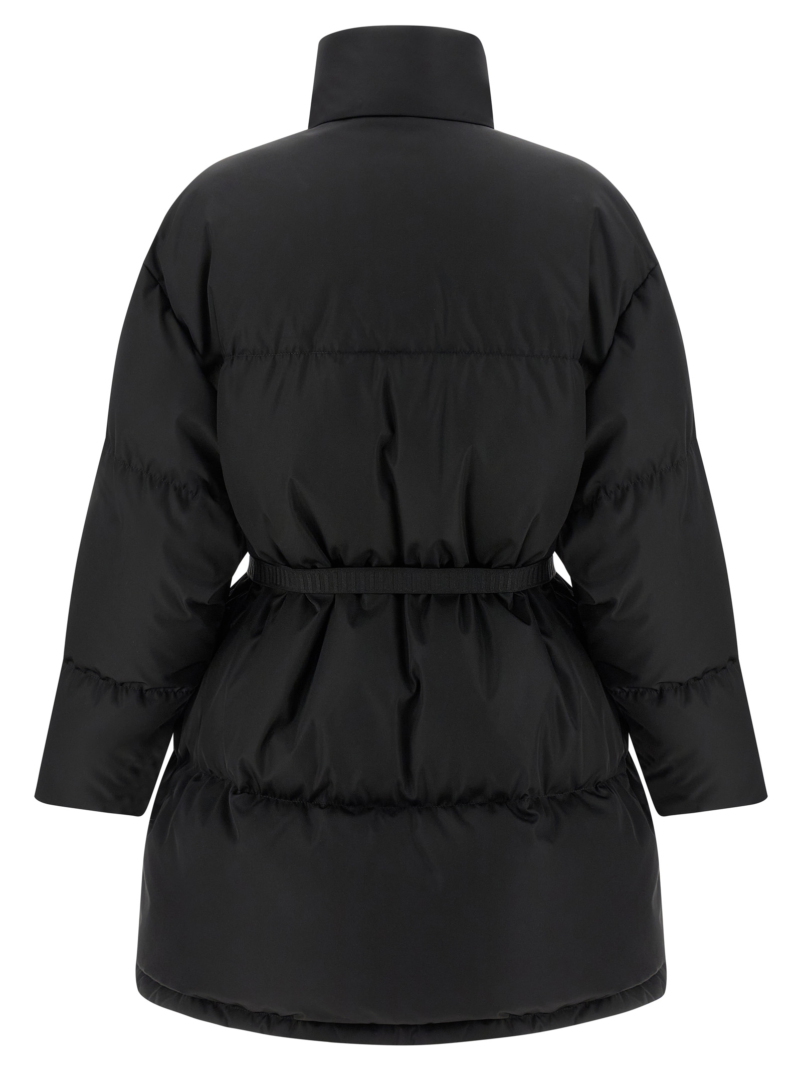 Maxi quilted Re-Nylon down jacket with goose down padding with contrast lining, triangle logo in enamelled metal and front zip closure, standing collar, pockets, long sleeves, drawstring on the hem.