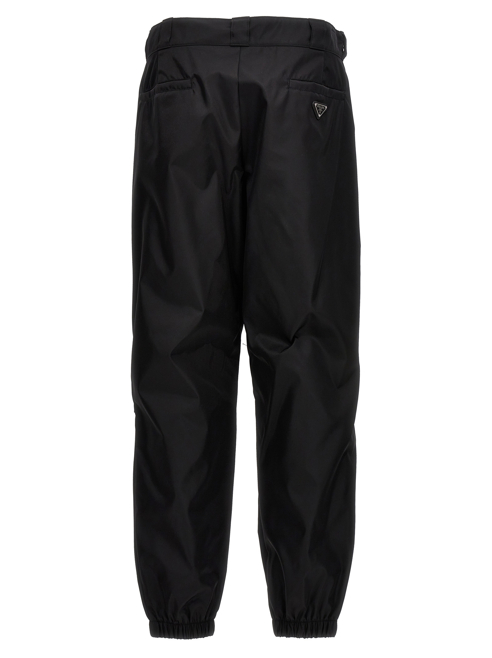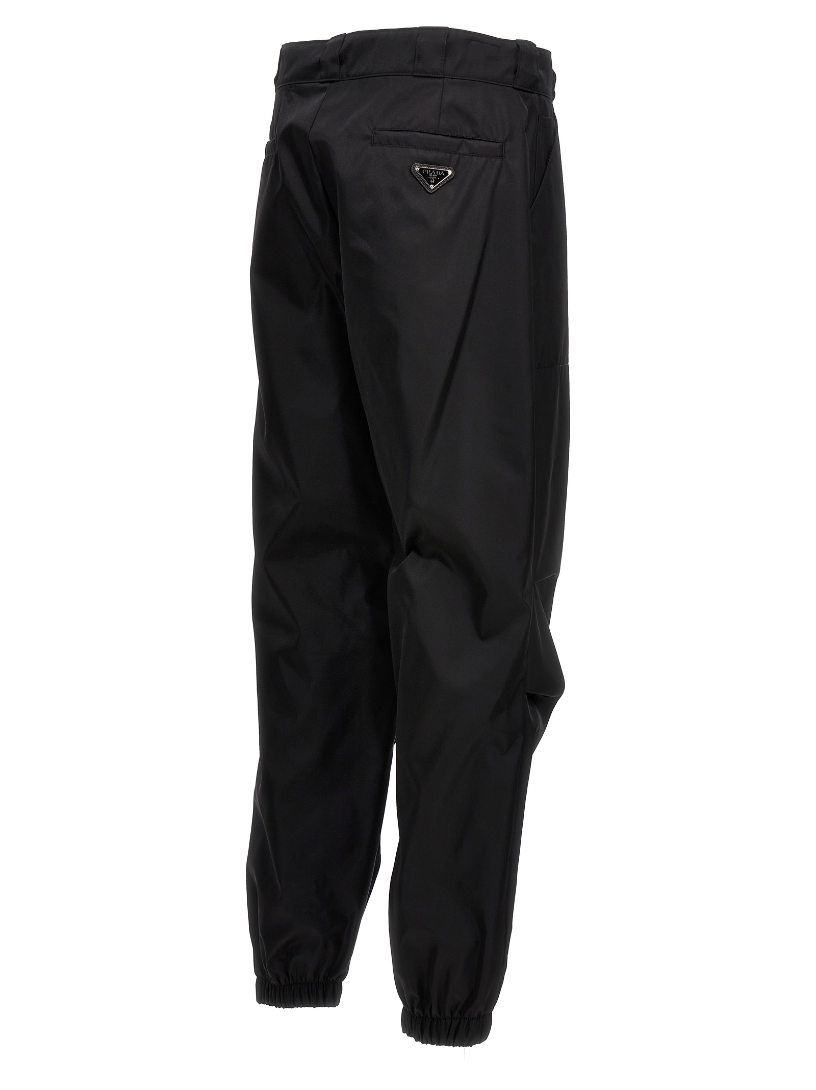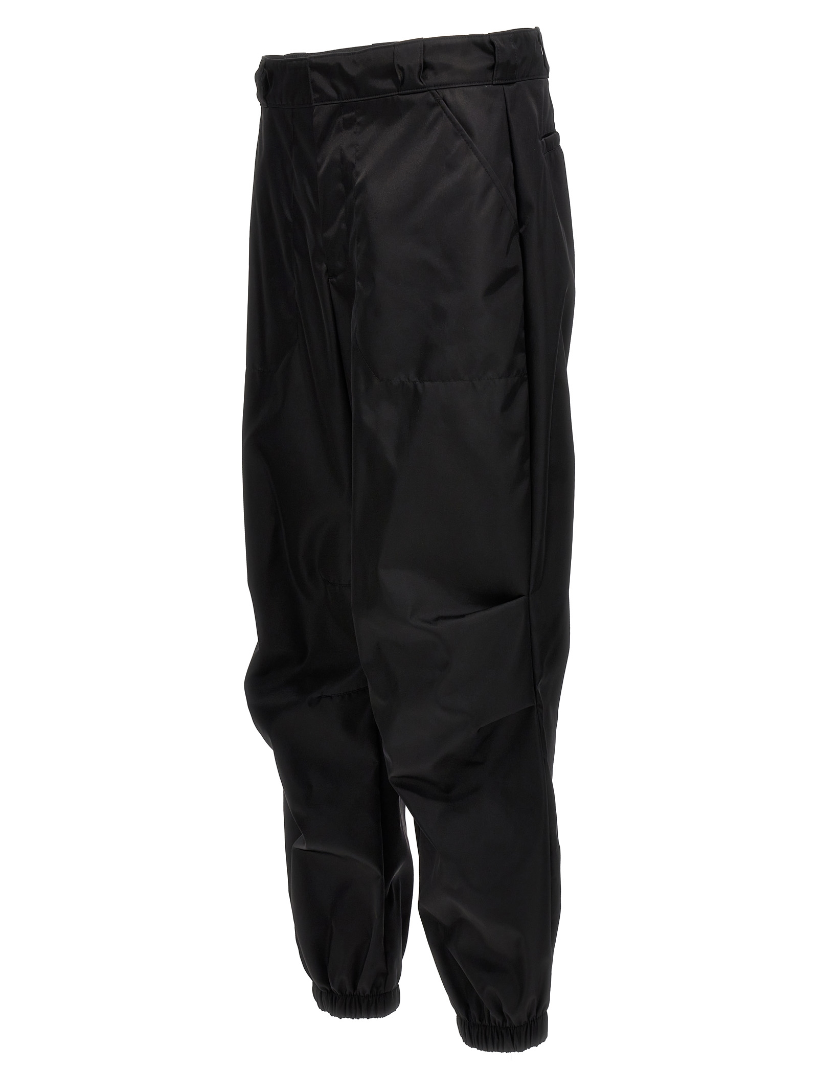 Re-Nylon pants with triangle metal enameled logo application at the back, hook-and-eye and button zip closure, pockets and elastic cuffs on the leg bottoms.