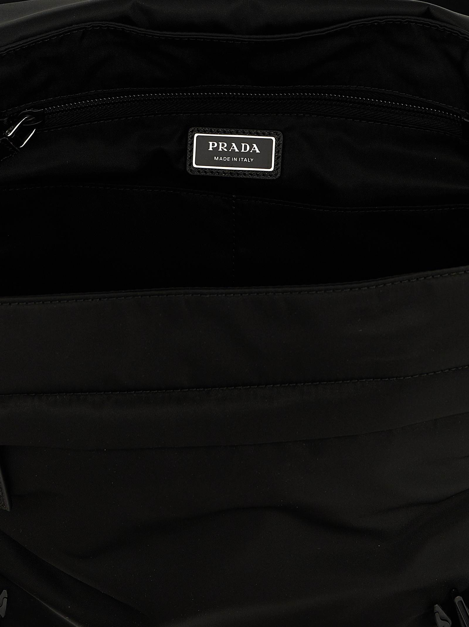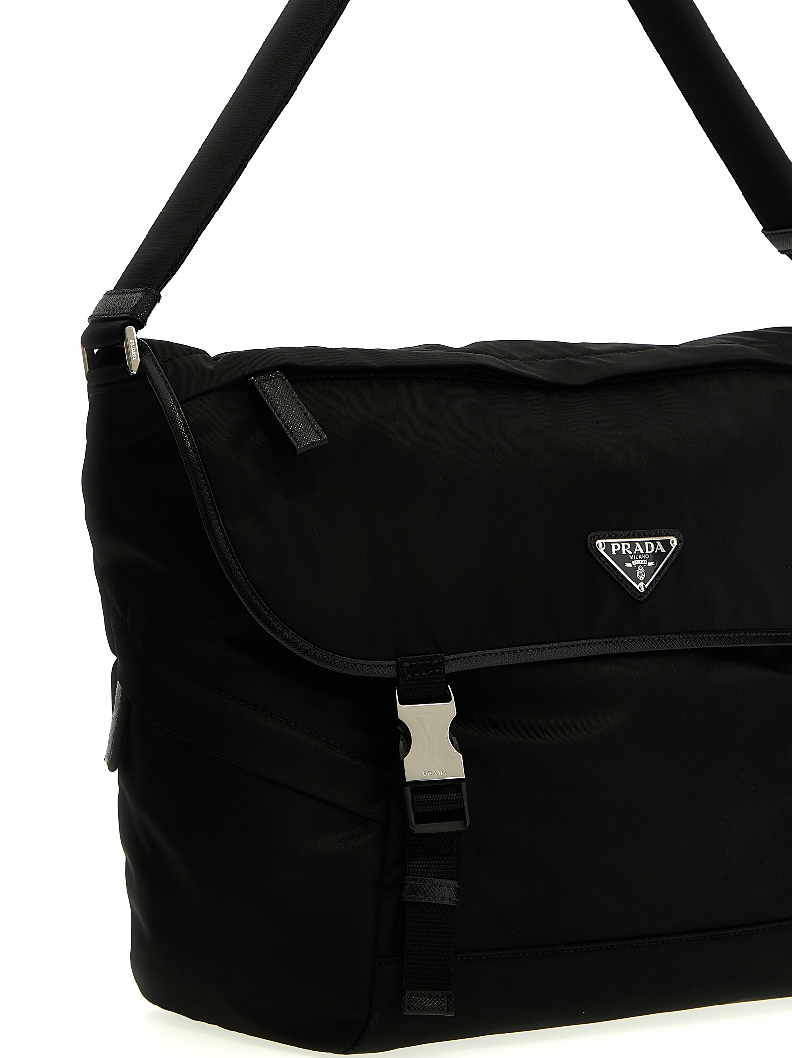 Re-Nylon shoulder strap with Saffiano leather details, flap and buckle closure, triangle logo in enamelled metal and adjustable shoulder strap.