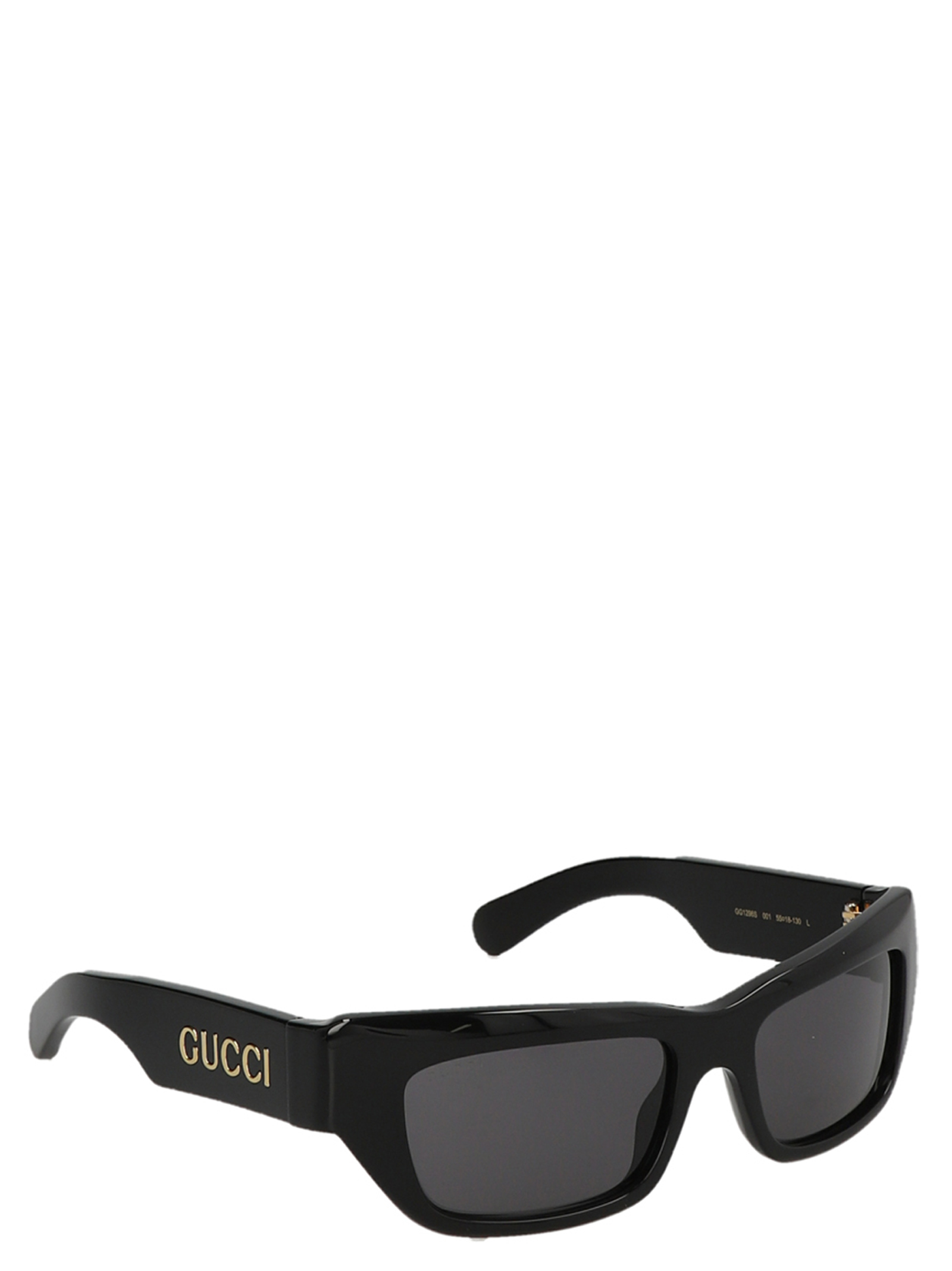 Rectangular sunglasses with shiny black acetate frame, shiny black acetate temples with Gucci logo detailing and gray solid color lenses. TOTAL UVA/UVB protection