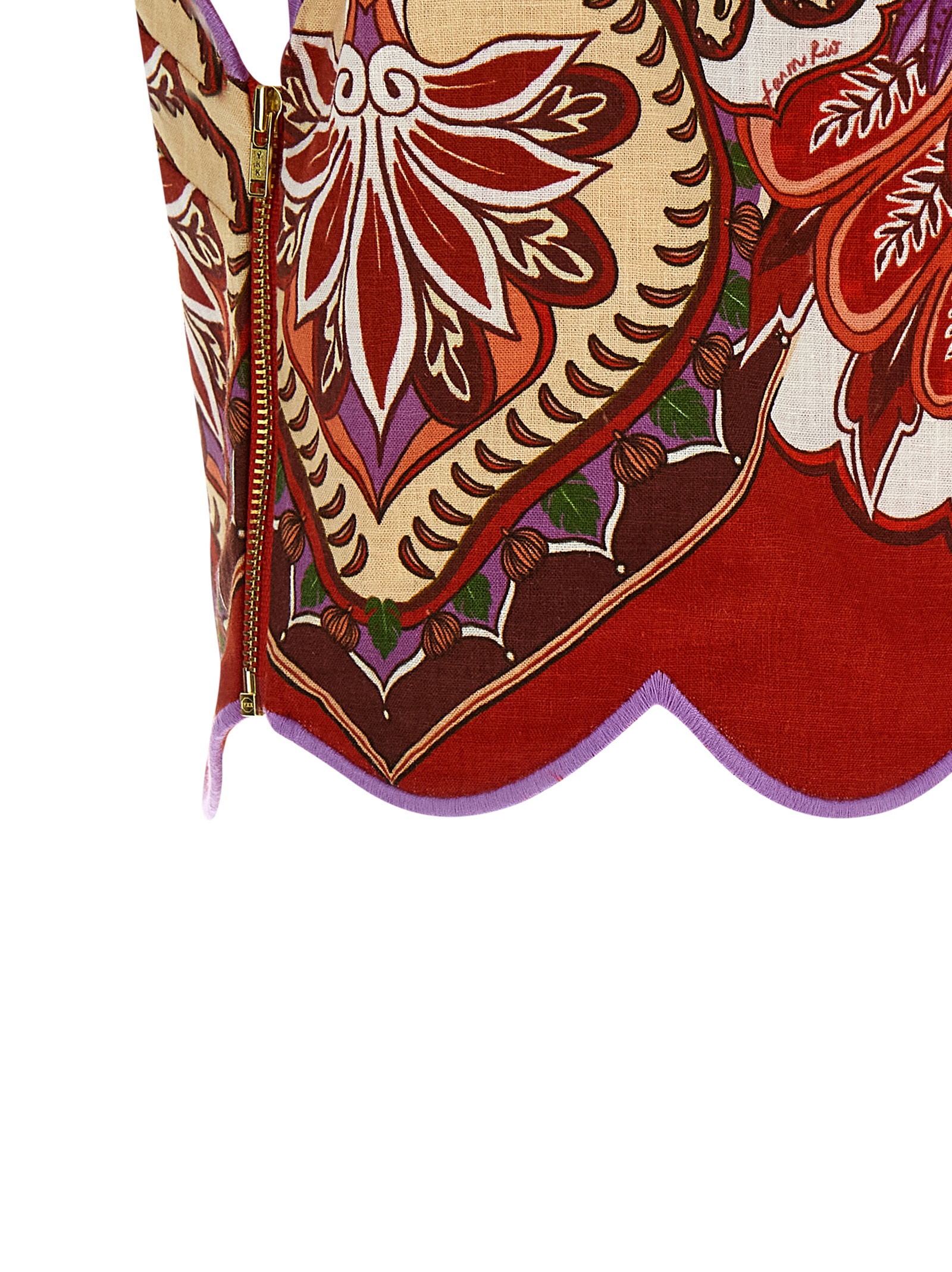 ‘Red Odara Scallops’ linen blend top with all-over print, one-shoulder model with side zip closure, asymmetric neckline, scalloped hem with contrast stitching.