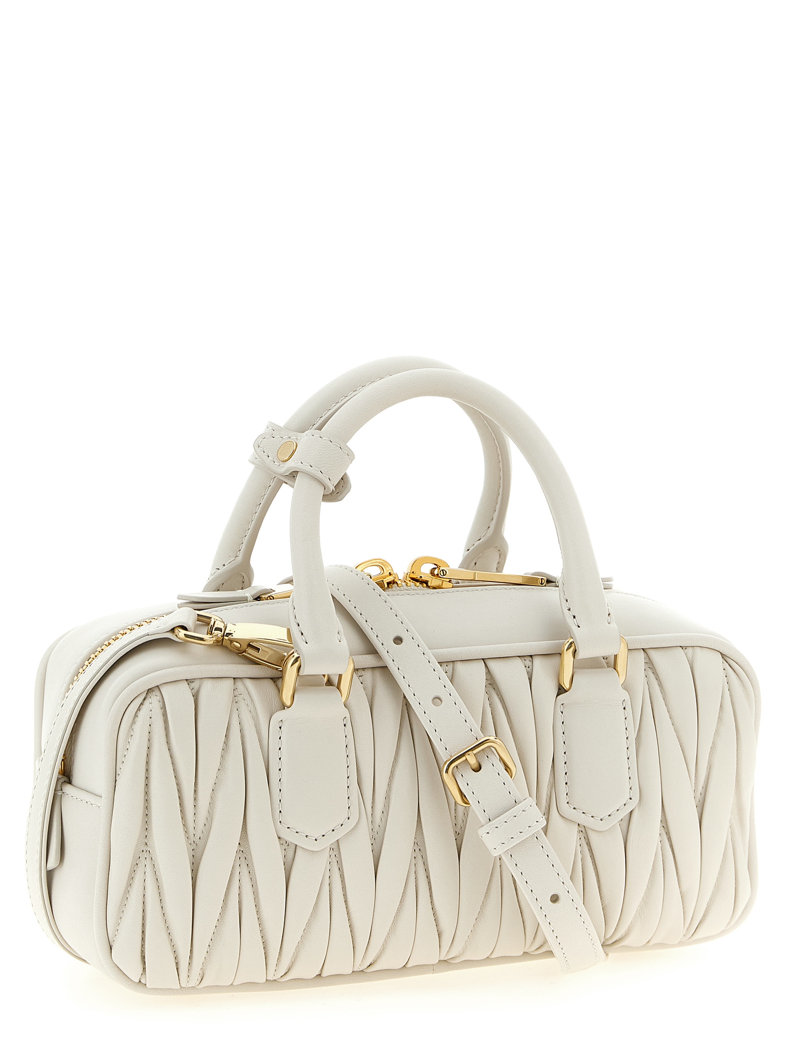 Regular ‘Arcadie’ matelassé nappa leather handbag with top case design, front metal lettering logo, top zip closure, double fixed tubular handle, rigid base with metal feet, cotton satin lining, one inside pocket, adjustable and removable shoulder strap, removable mirror holder.