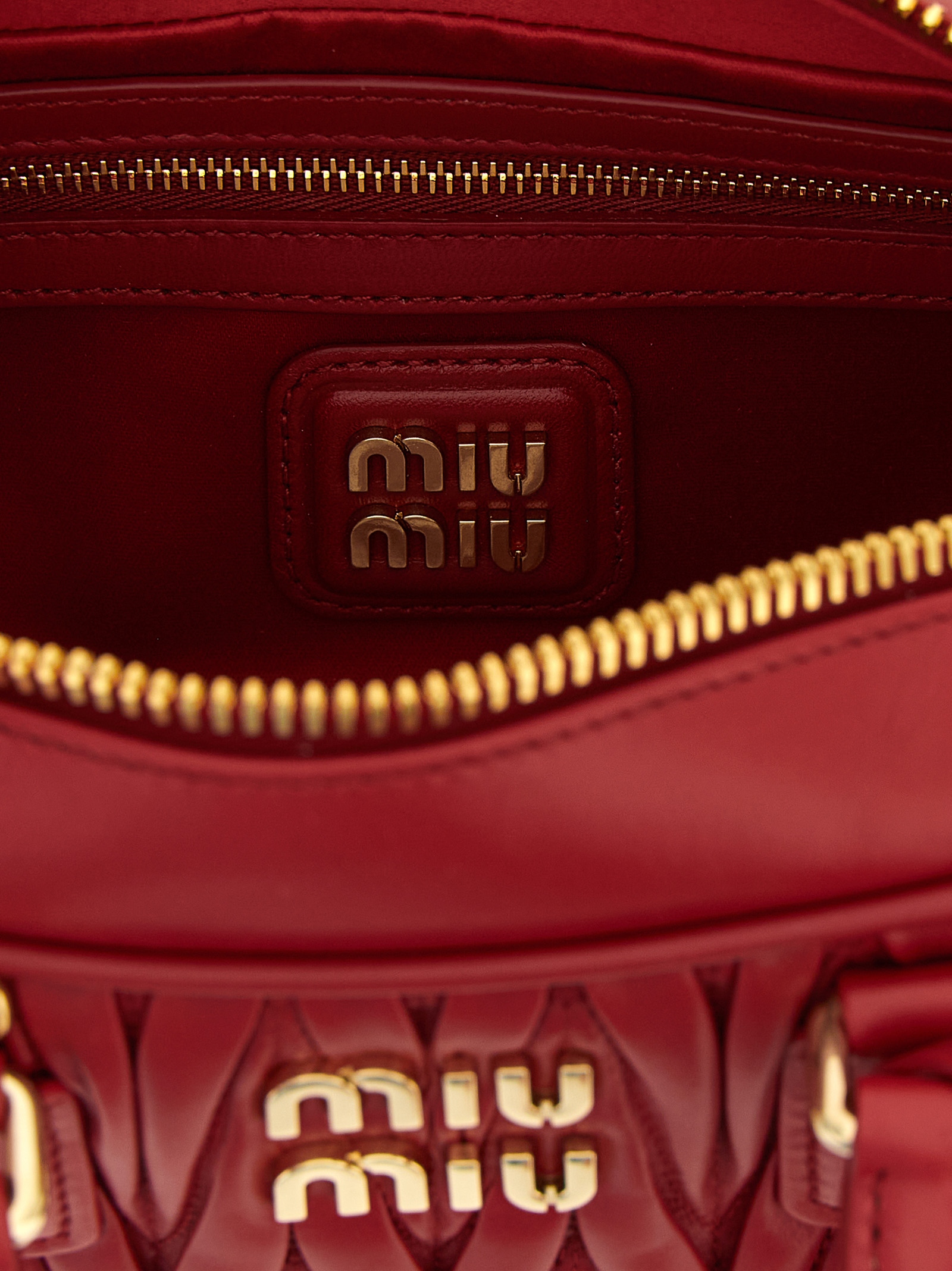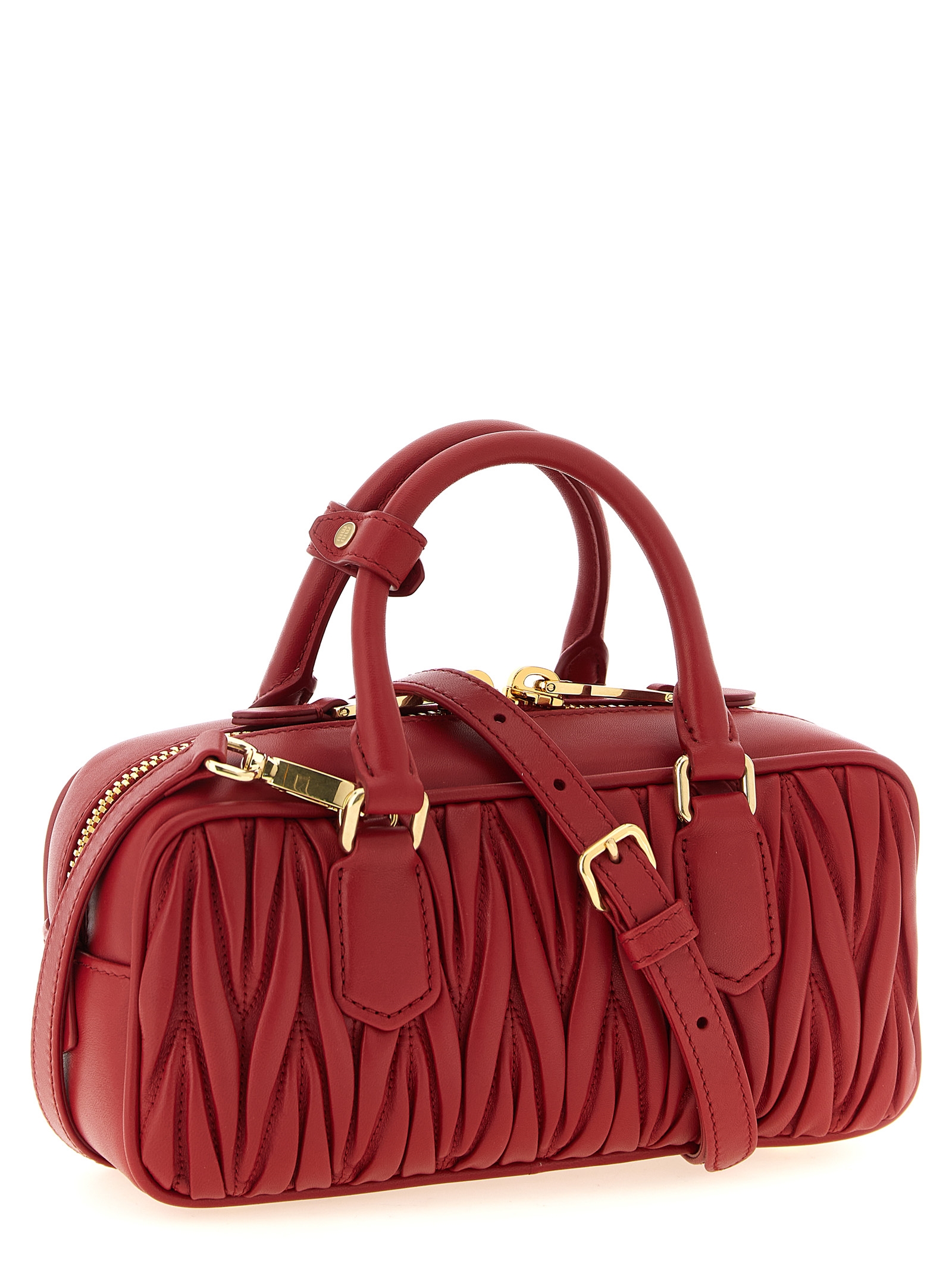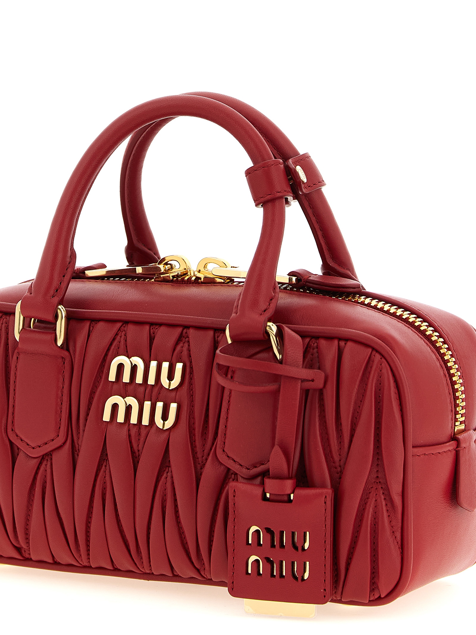 Regular ‘Arcadie’ matelassé nappa leather handbag with top case design, front metal lettering logo, top zip closure, double fixed tubular handle, rigid base with metal feet, cotton satin lining, one inside pocket, adjustable and removable shoulder strap, removable mirror holder.
