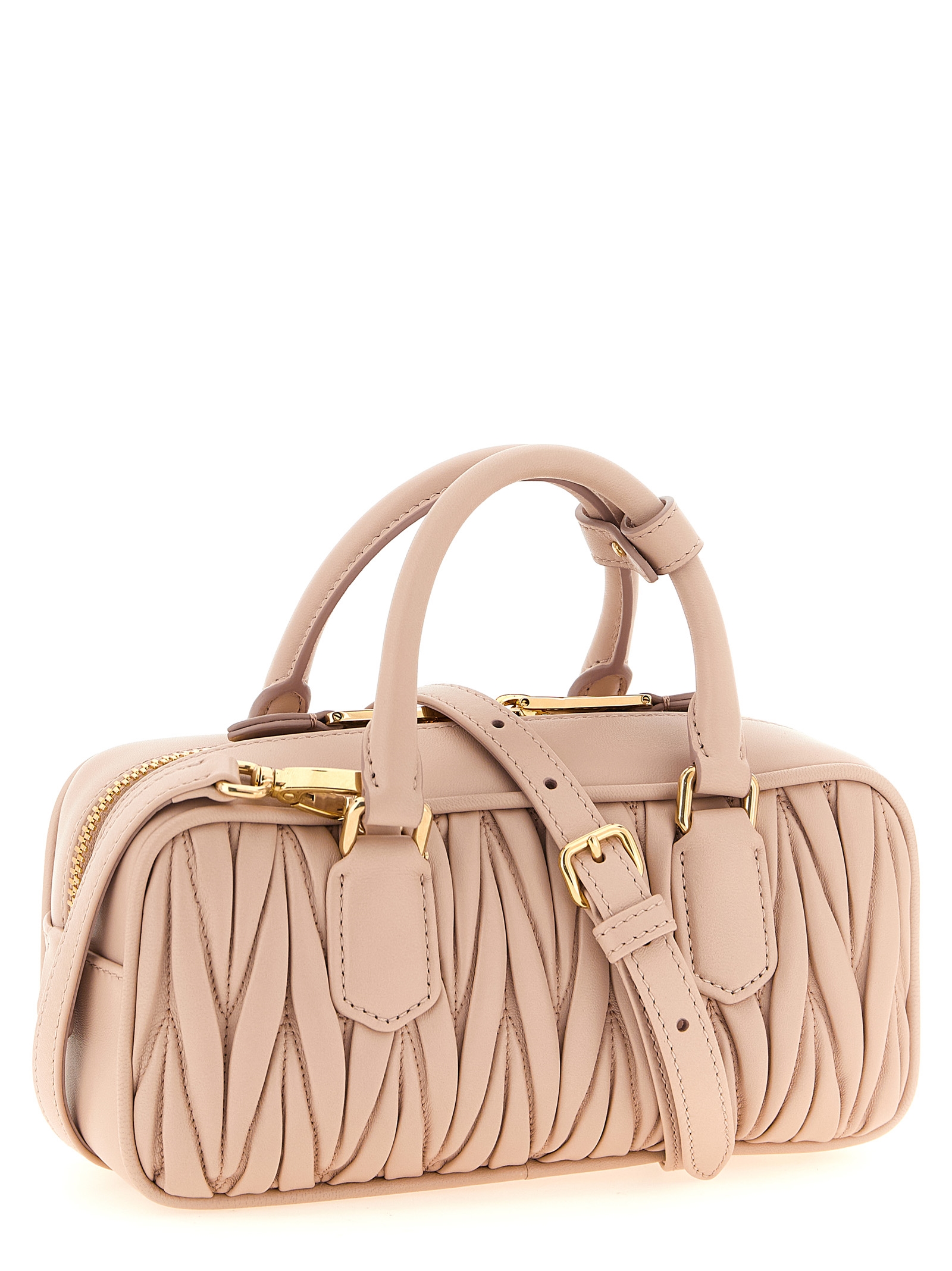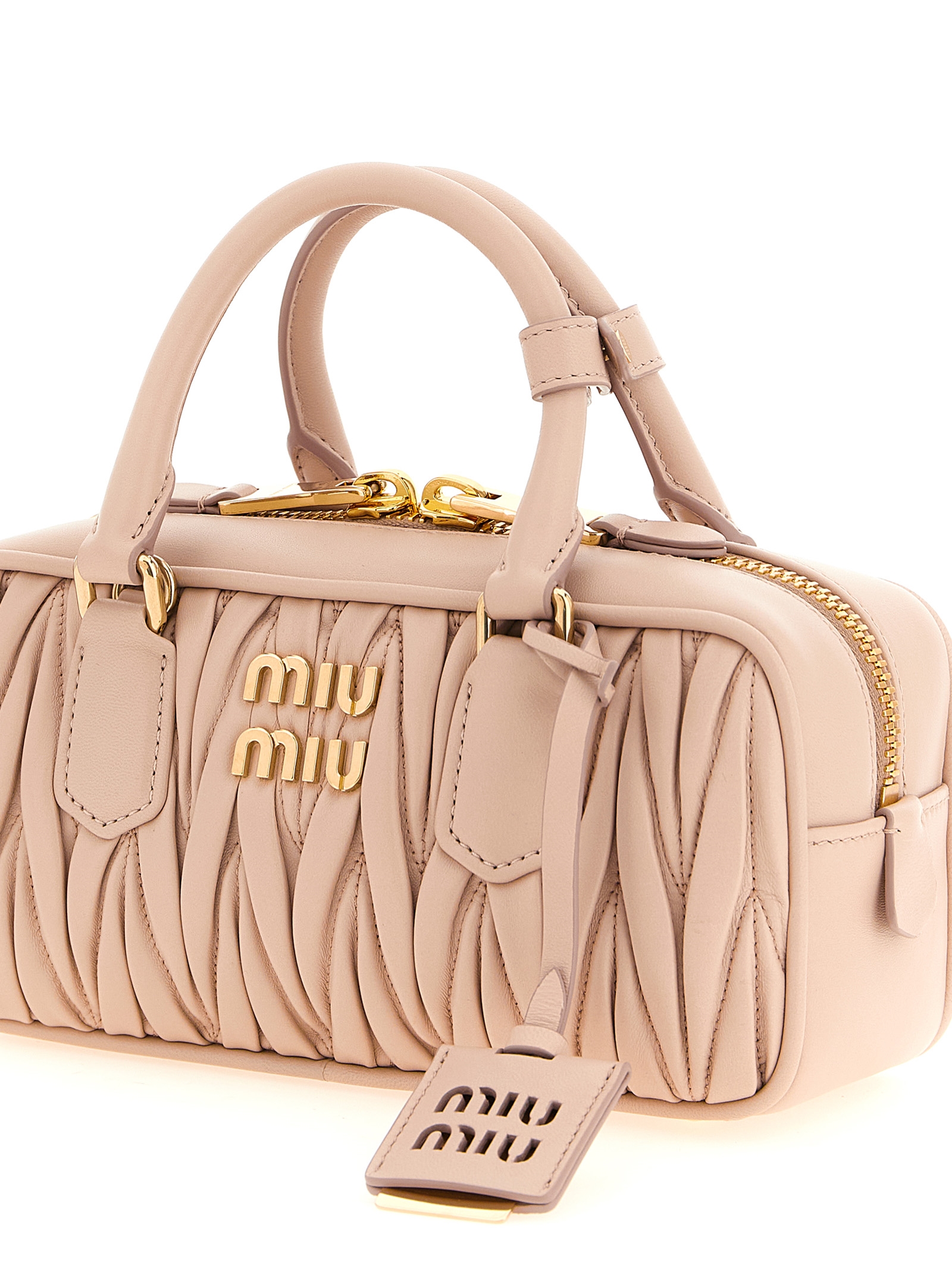 Regular ‘Arcadie’ matelassé nappa leather handbag with top case design, front metal lettering logo, top zip closure, double fixed tubular handle, rigid base with metal feet, cotton satin lining, one inside pocket, adjustable and removable shoulder strap, removable mirror holder.