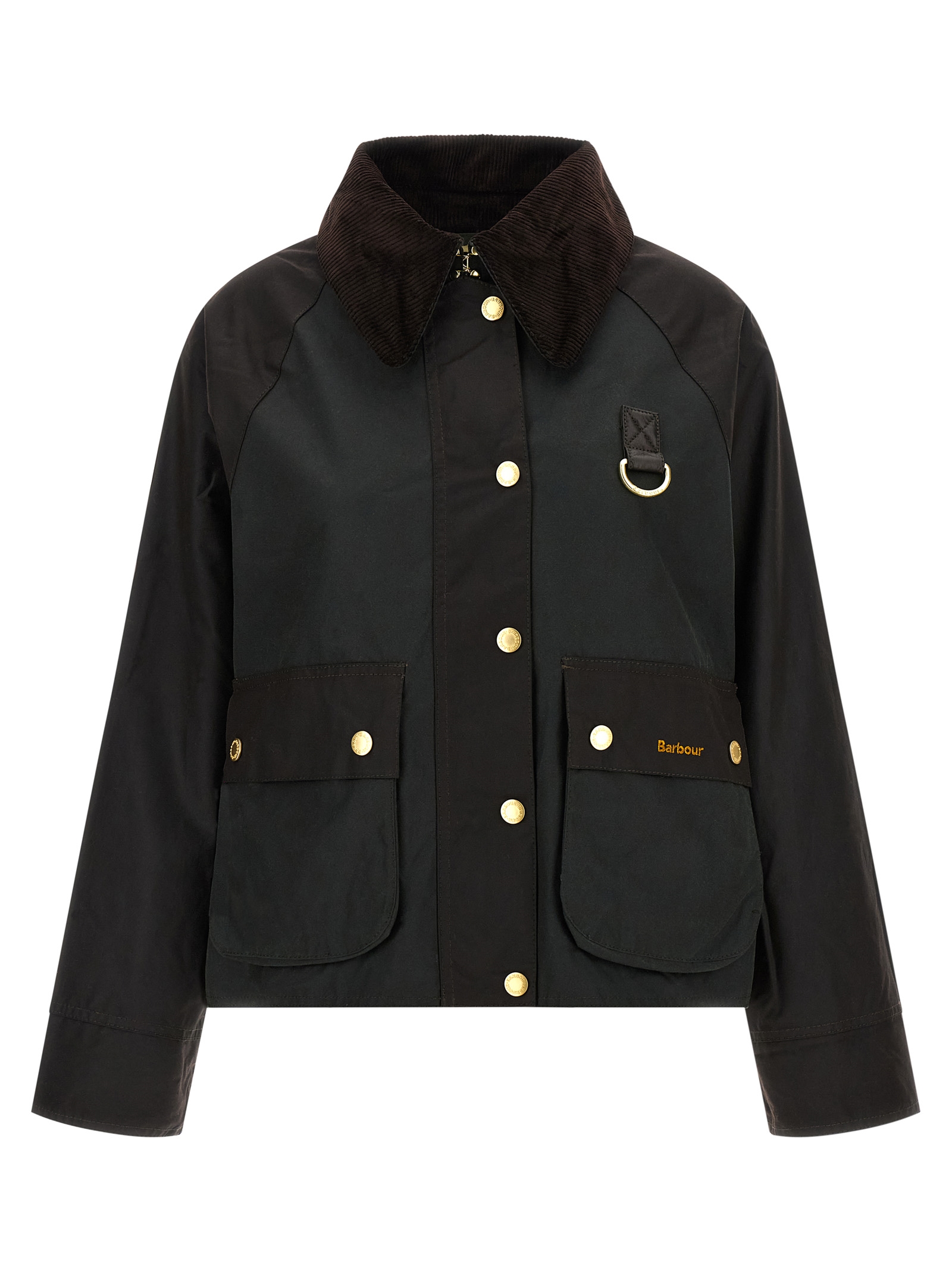 ‘Reighton’ two-tone waxed cotton jacket, corduroy collar, adjustable and removable hood, logo embroidery and front metal D-Ring, zip and snap button closure, pockets, long sleeves with foldable cuffs, check cotton lining.