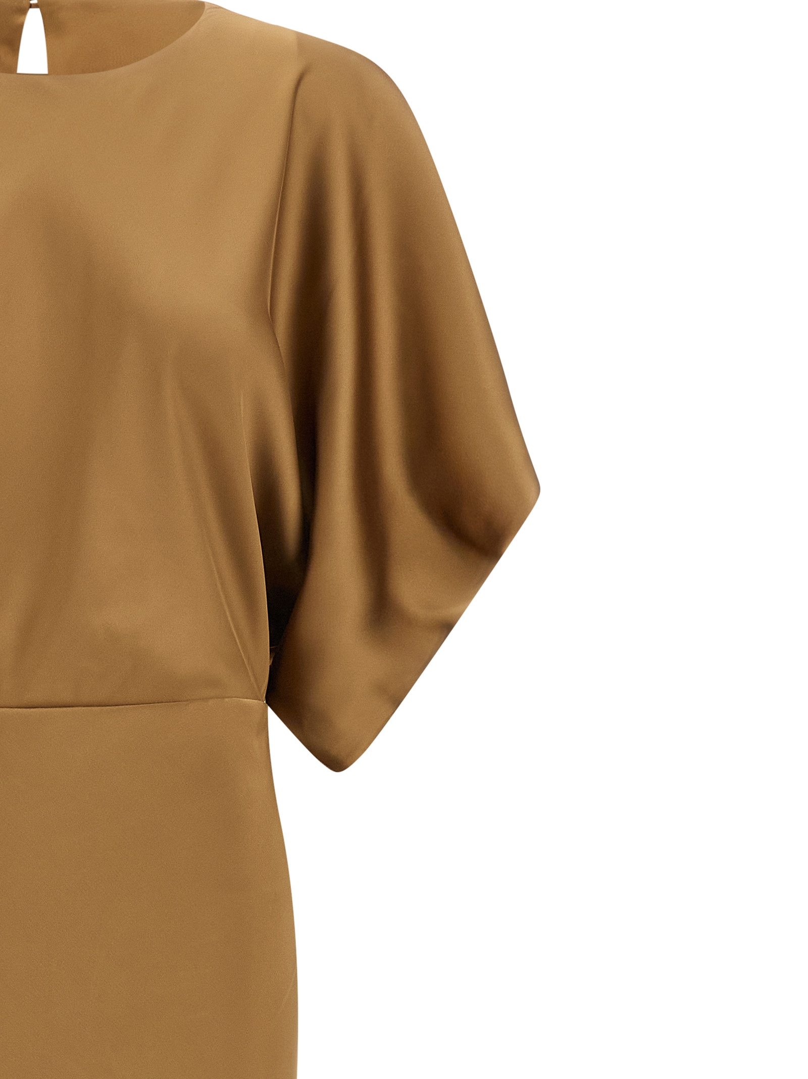 Long ‘Reverse Obie’ dress in fluid satin-effect fabric with flared mermaid silhouette, crew neck with back button closure and cut-out teardrop detail, wide short draped sleeves.