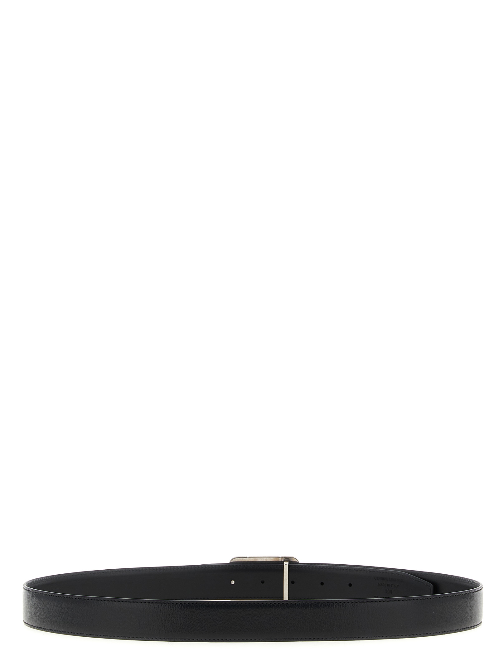 Reversible smooth leather belt with antiqued metal logo buckle.