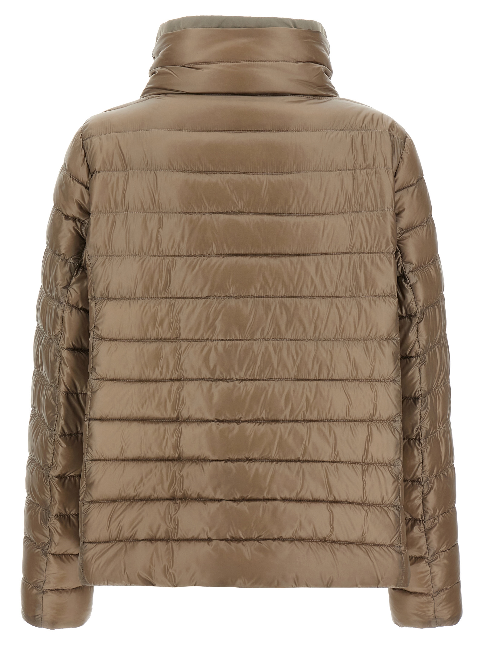 Reversible quilted nylon down jacket with goose down padding, high neck with adjustable drawstring, long sleeves, button closure, pockets.