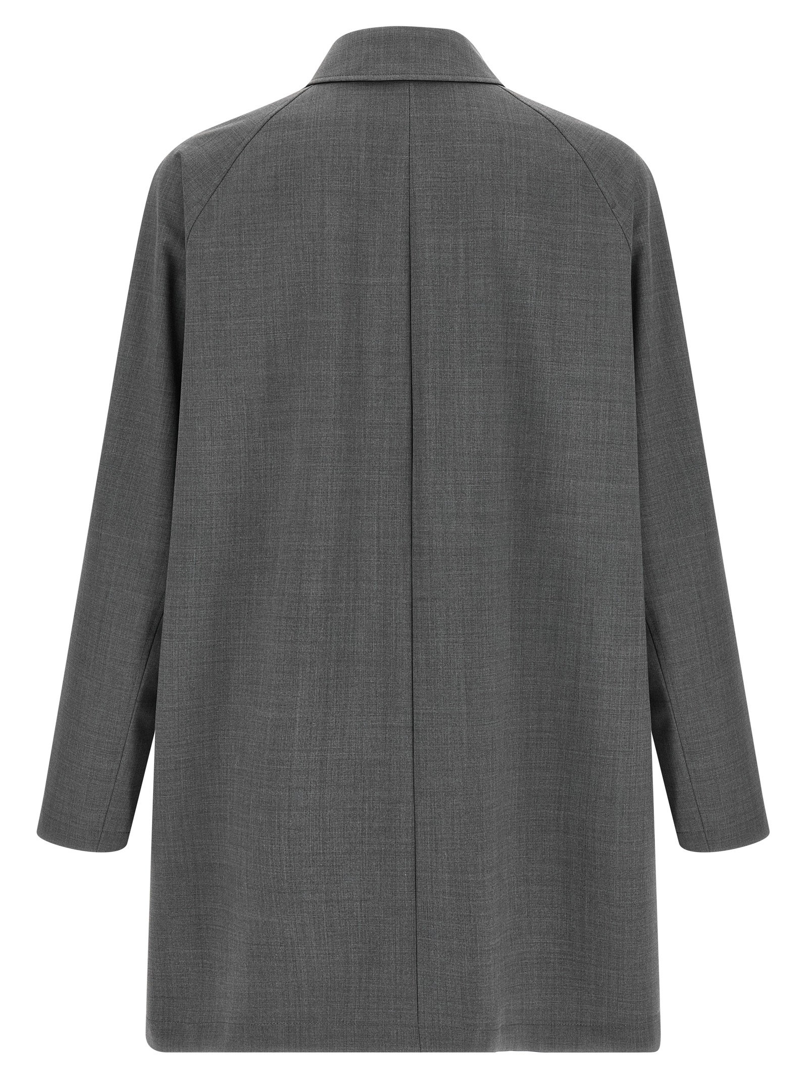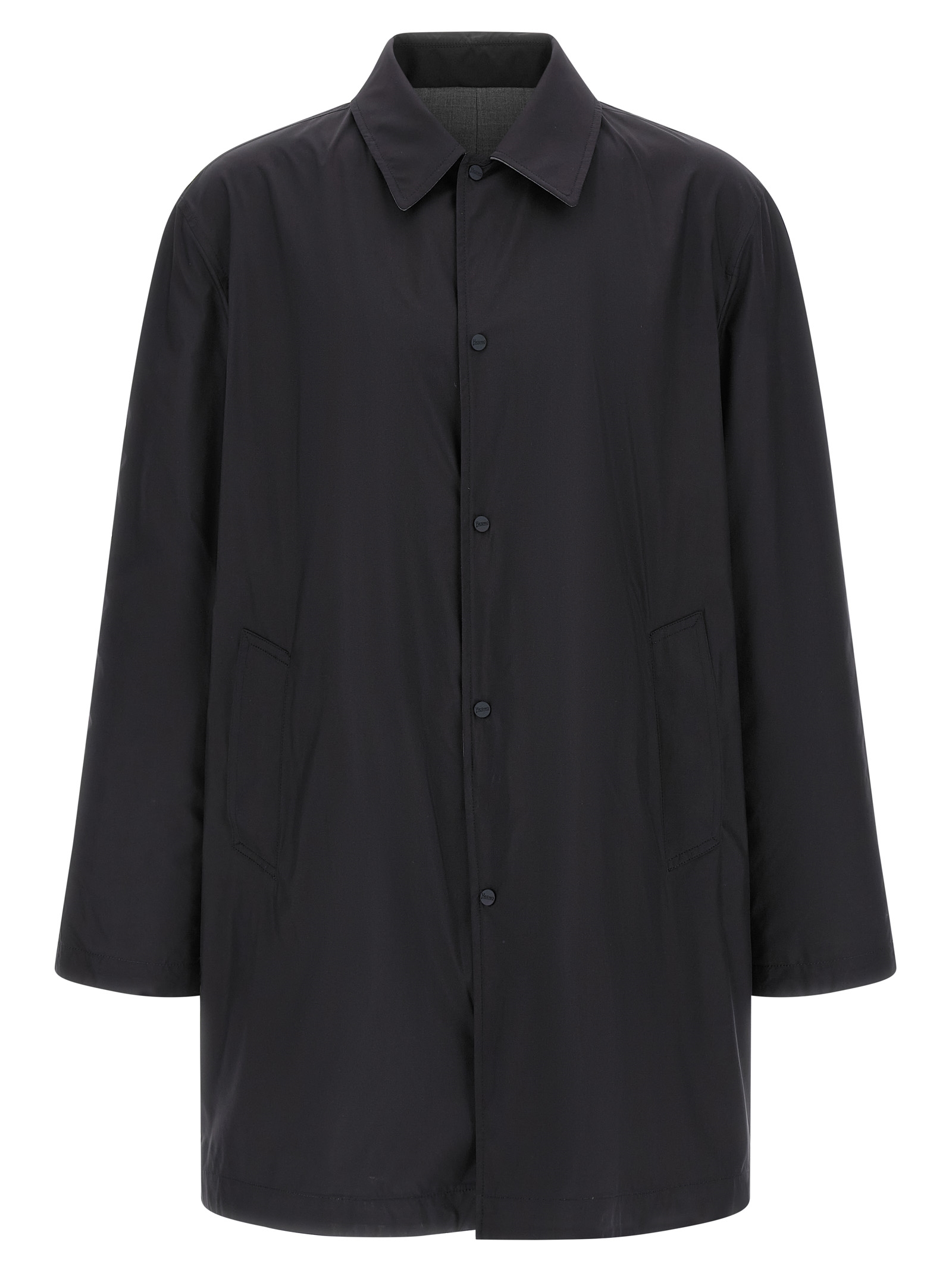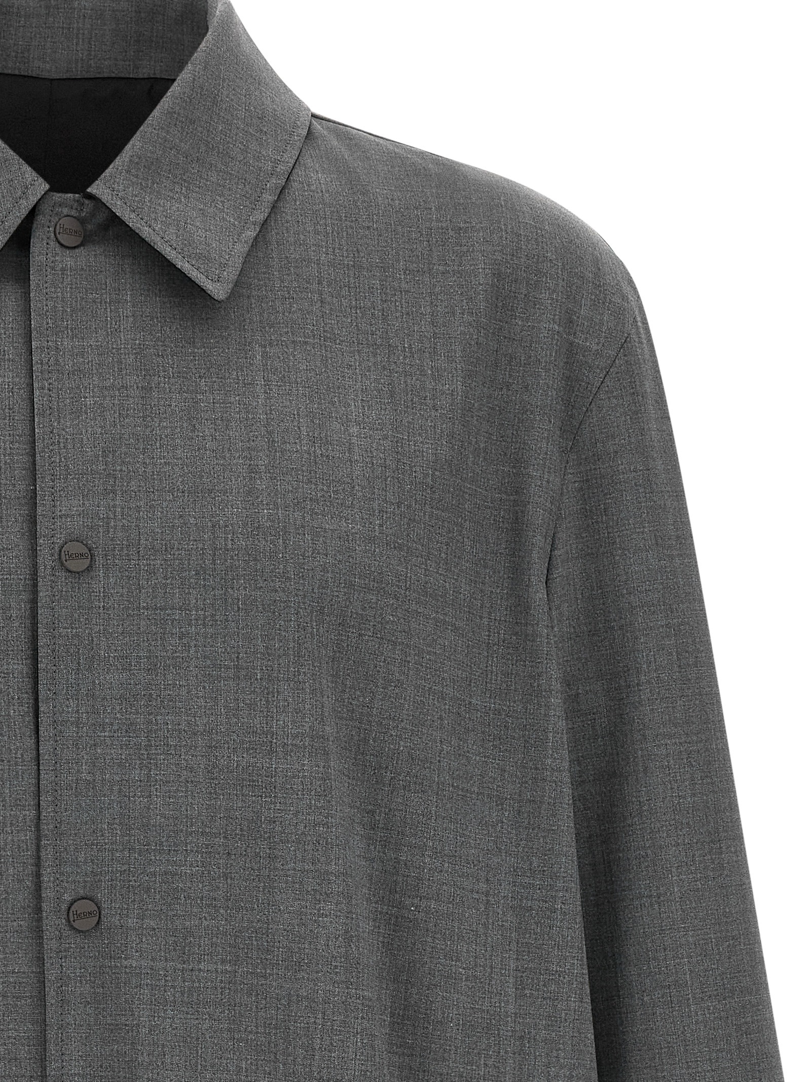 Reversible lightweight jacket – ‘Flight’ line in solid color waterproof fabric and waterproof wool blend mélange fabric, shirt collar, front snap button closure, pockets, long sleeves.