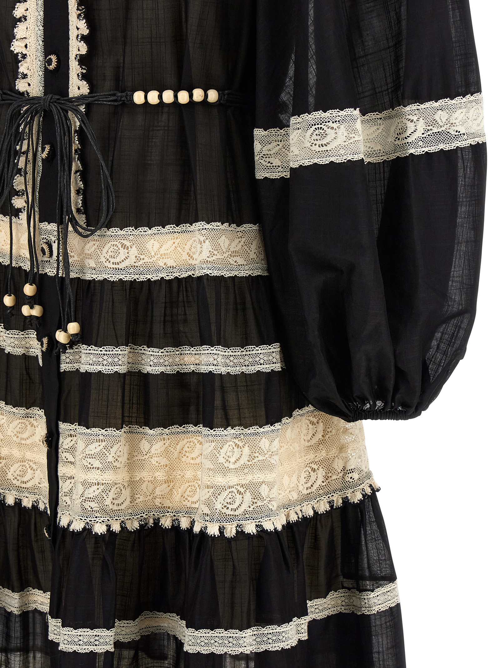 Rhiannon Lace Billow’ sectional cotton midi dress with crochet lace trim, high neck, front button closure, long puff sleeves with elastic cuffs, removable wooden beaded belt, and removable petticoat.