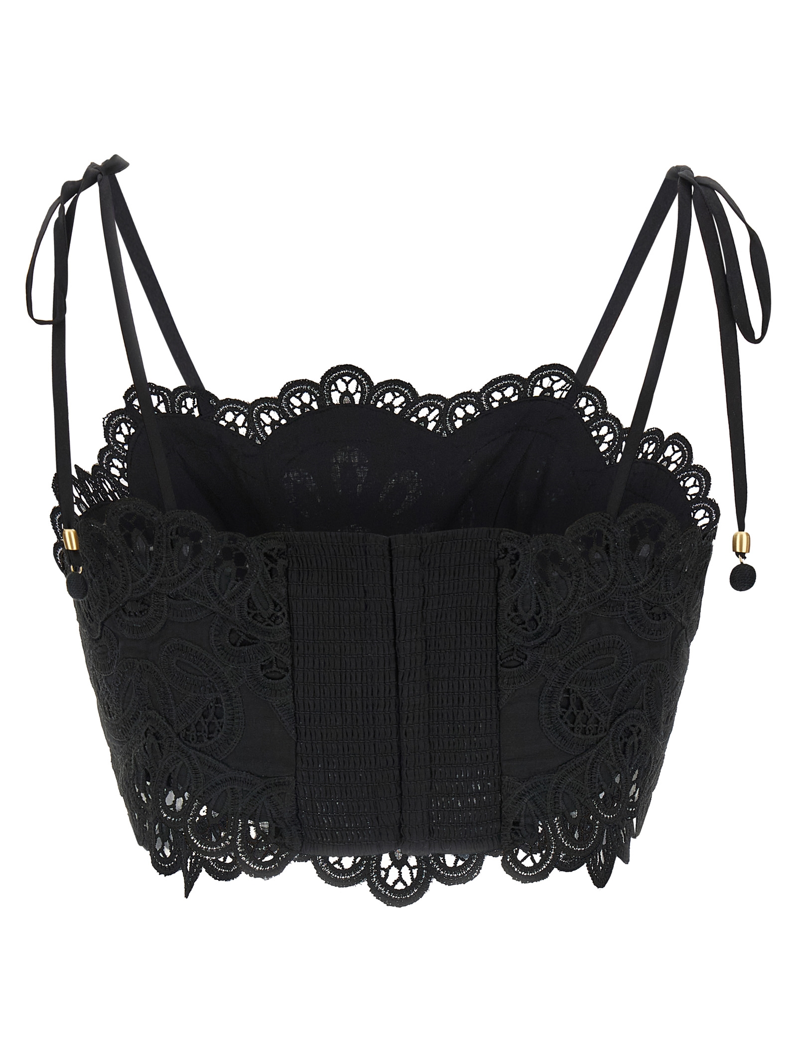 ‘Rhiannon’ top in embroidered and perforated cotton, back closure with hooks and smock stitch elastic, thin adjustable and knotted shoulder straps with bow.
