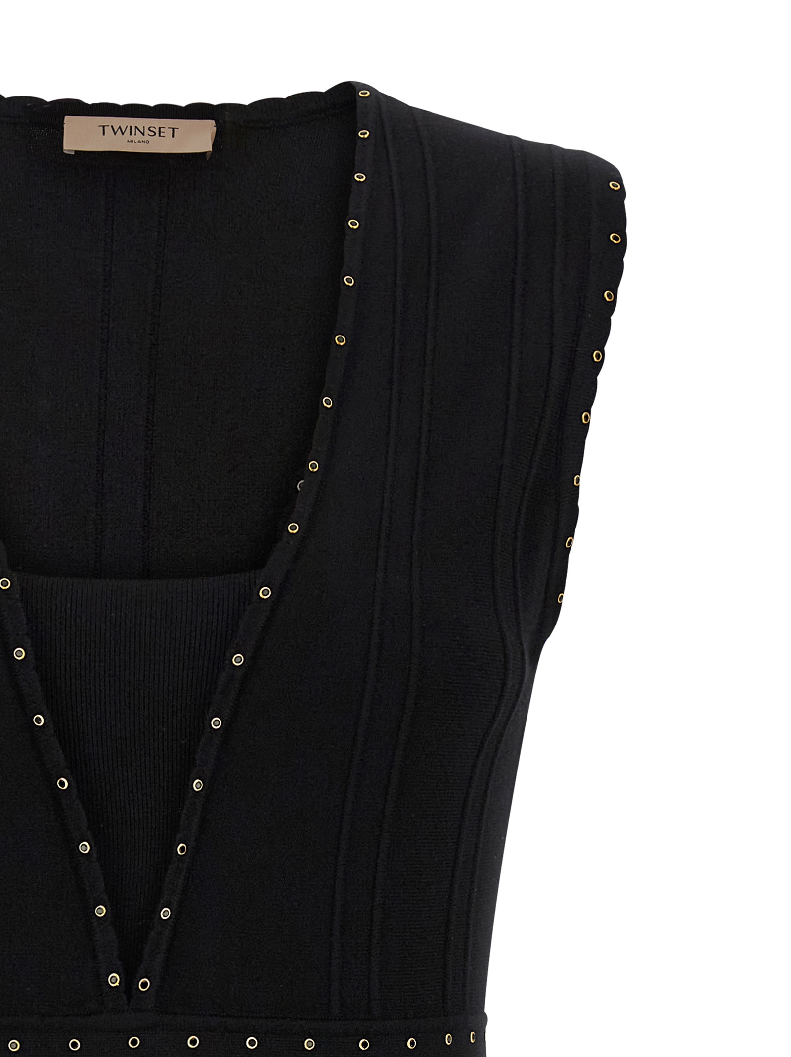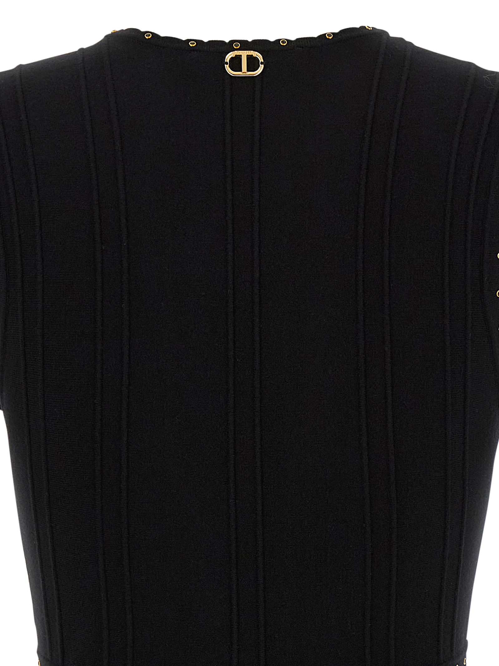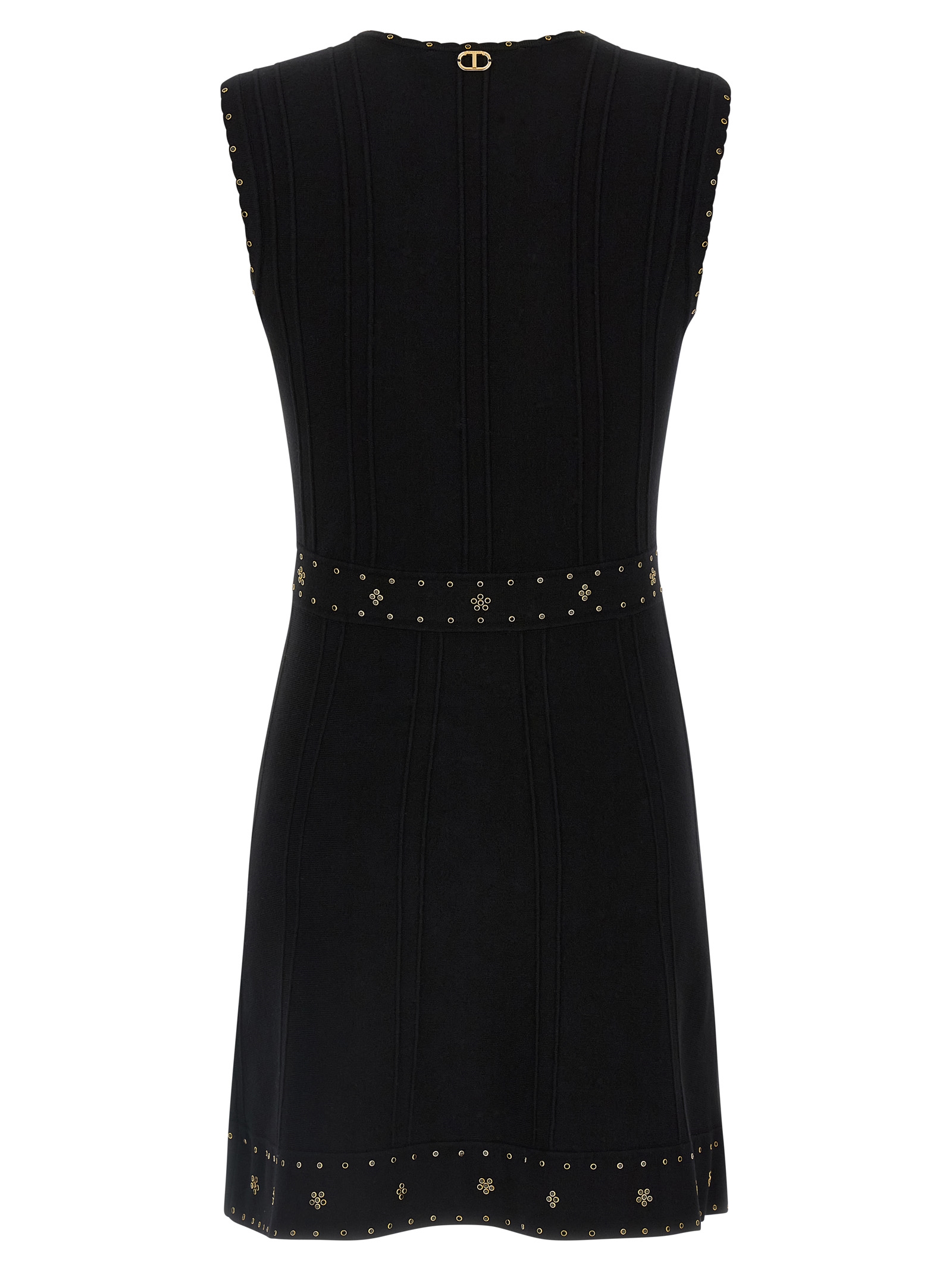 Mini dress in stretch viscose with shaved pattern alternating with ribbed details and rhinestone stud application, square neckline, sleeveless, flared silhouette, metal ‘Oval T’ logo plaque on the back, unlined.