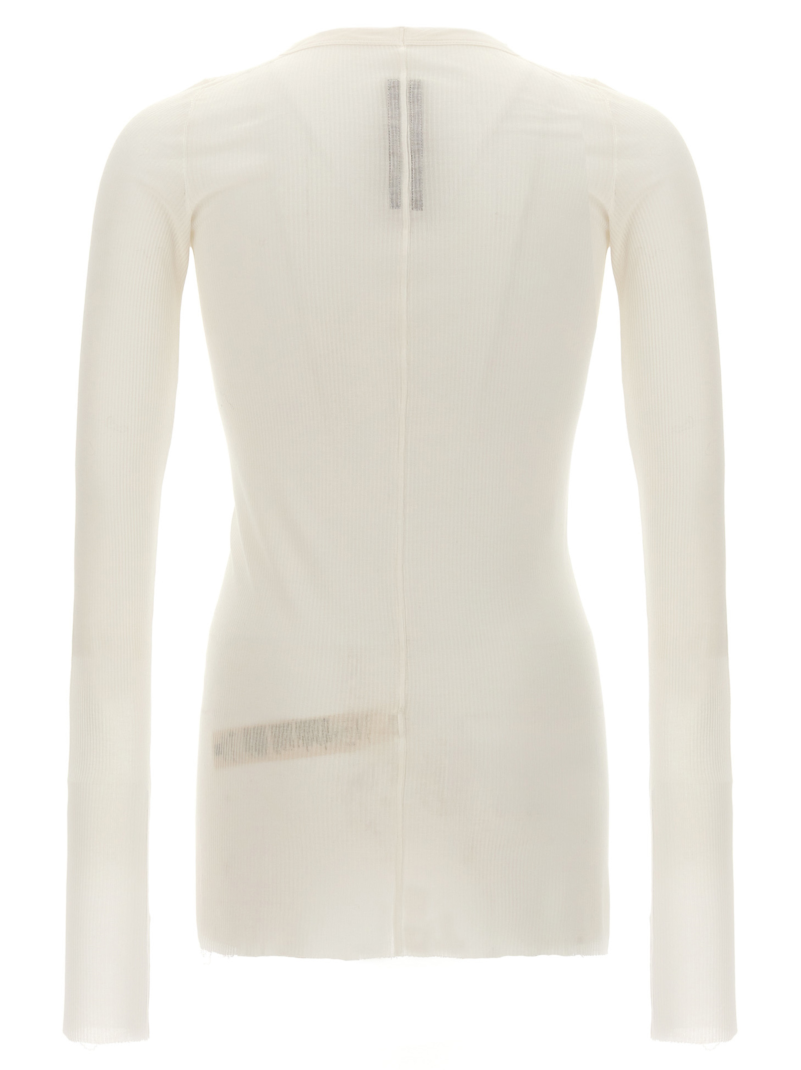 ‘Rib LS T’ ribbed viscose and stretch silk blend t-shirt, raw cut hem, crew neck, long sleeves.