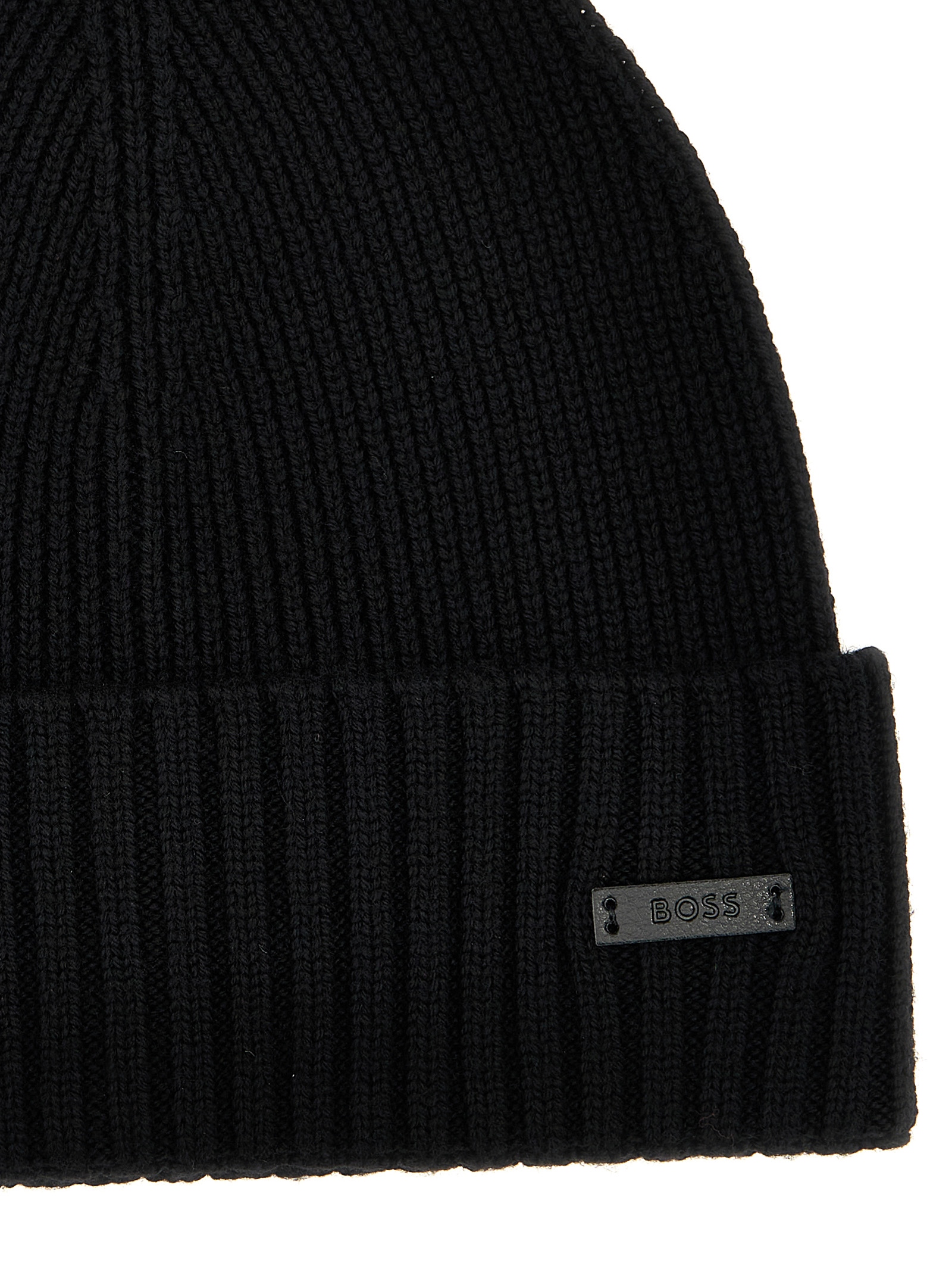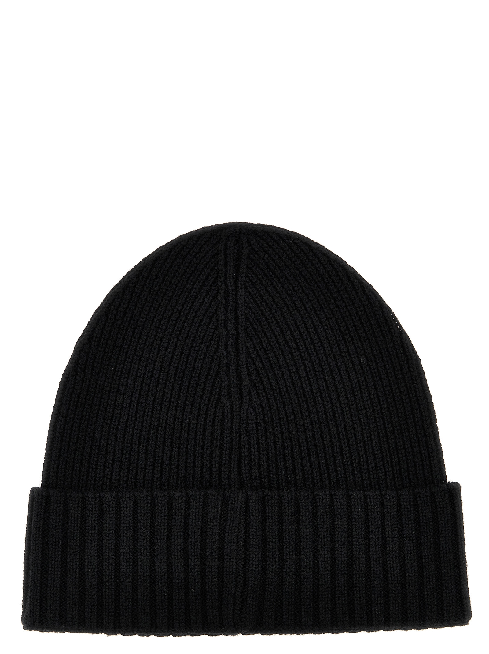 Ribbed wool beanie with side logo patch.