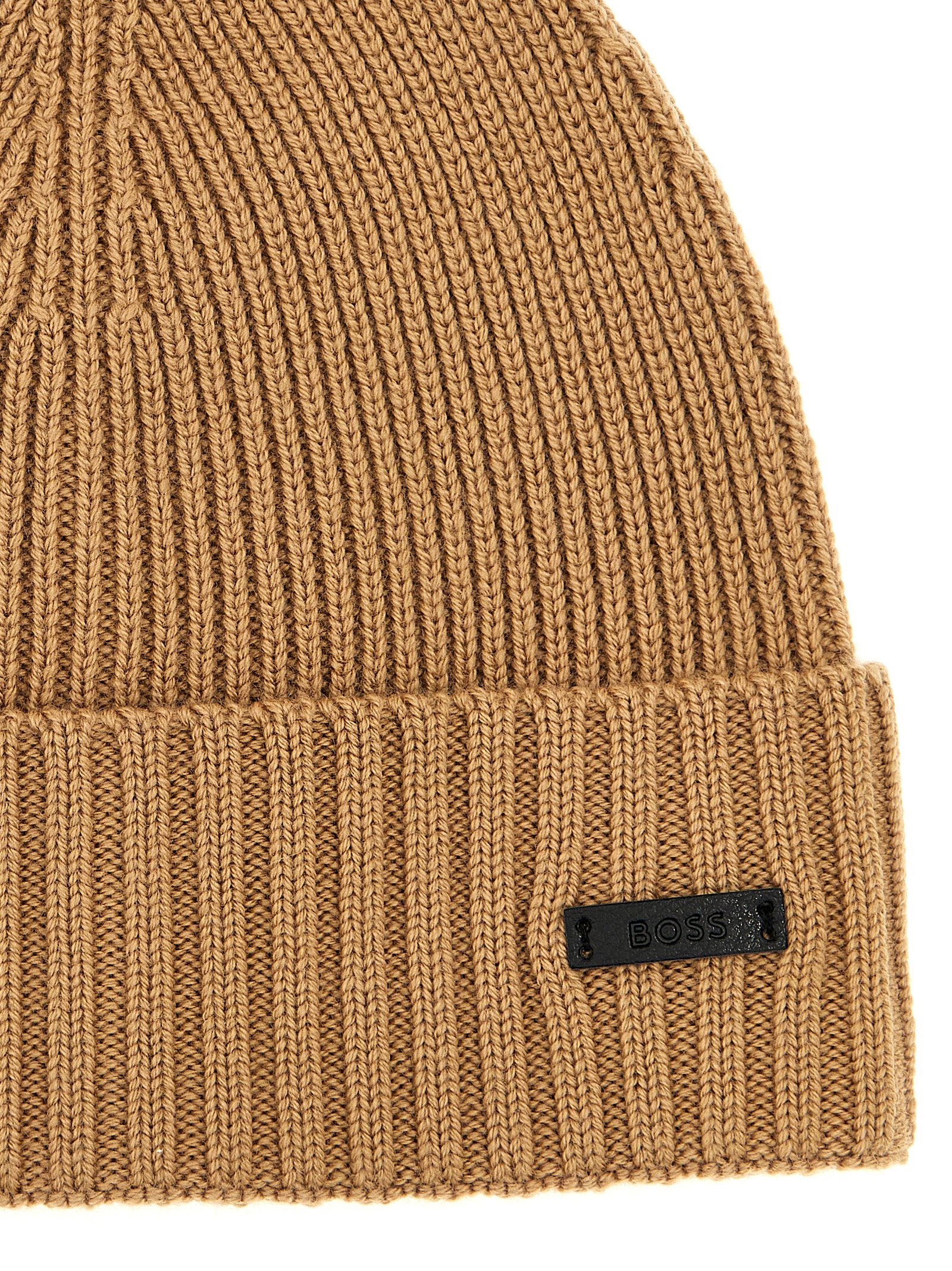 Ribbed wool beanie with side logo patch.