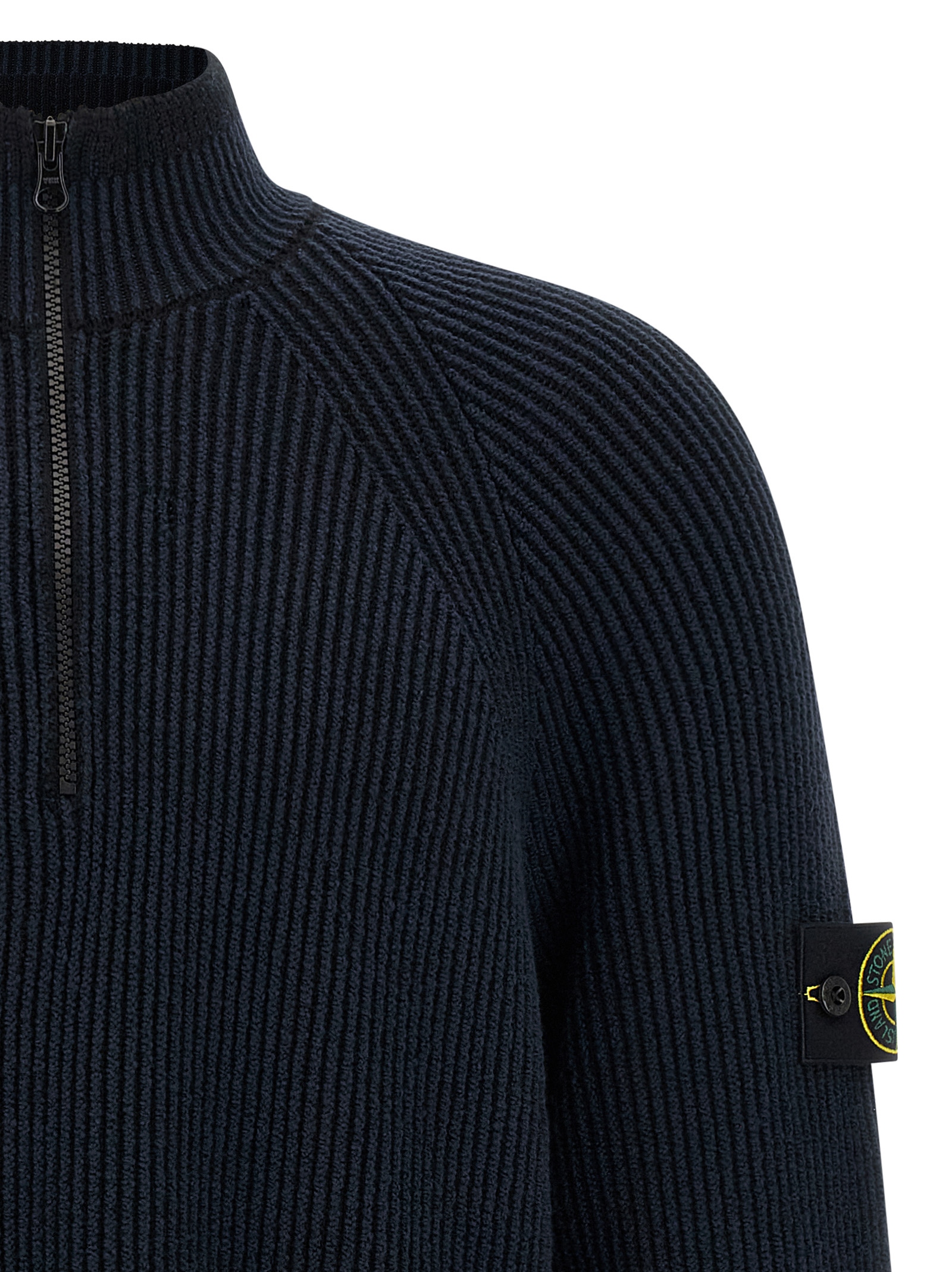 Ribbed virgin wool and stretch cotton blend cardigan, half zip, high neck, long sleeves with logo badge.