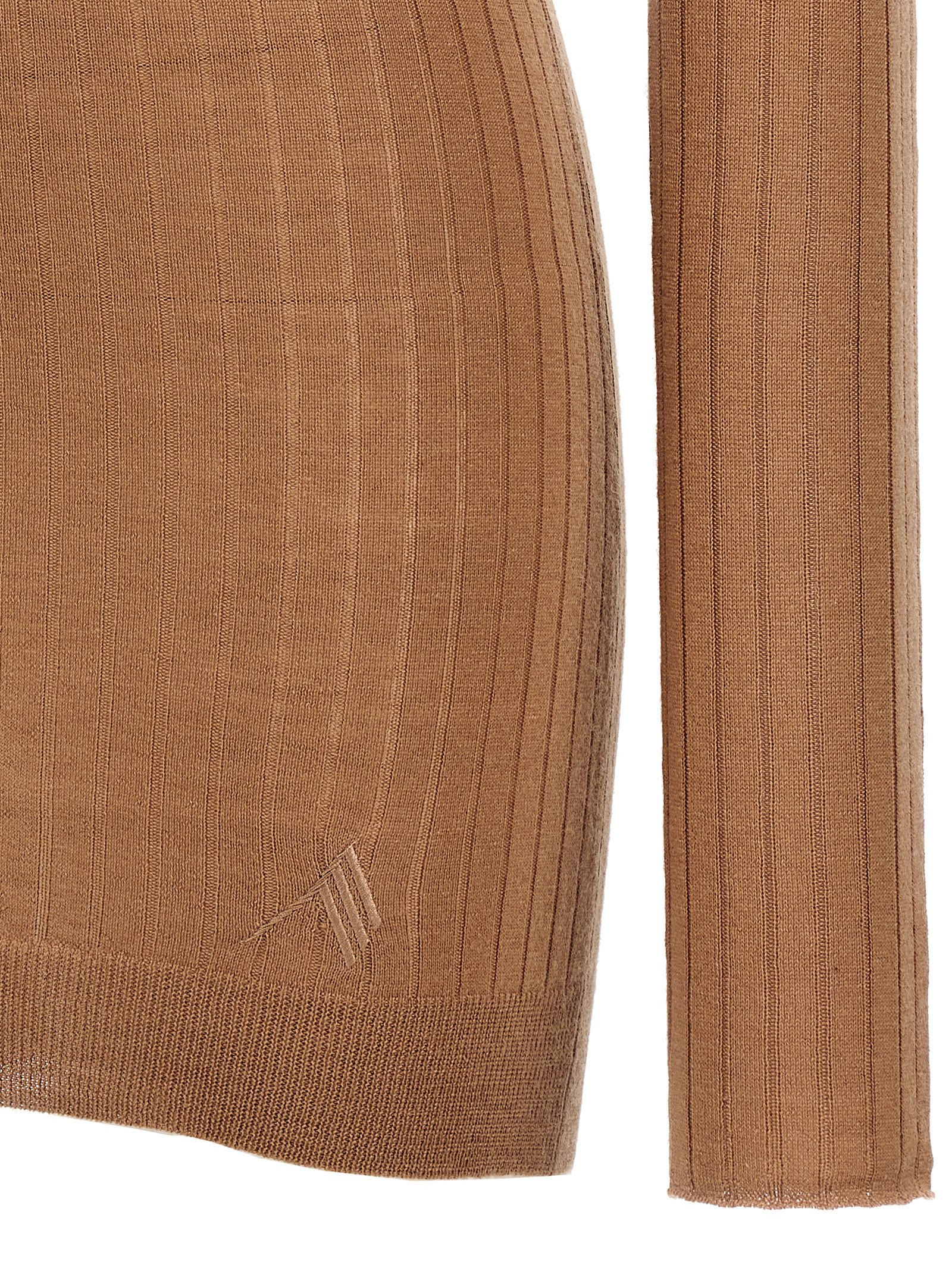 Cashmere and ribbed silk knit mini dress, tone-on-tone logo embroidery on the front, crew neck, front buttons, long sleeves.