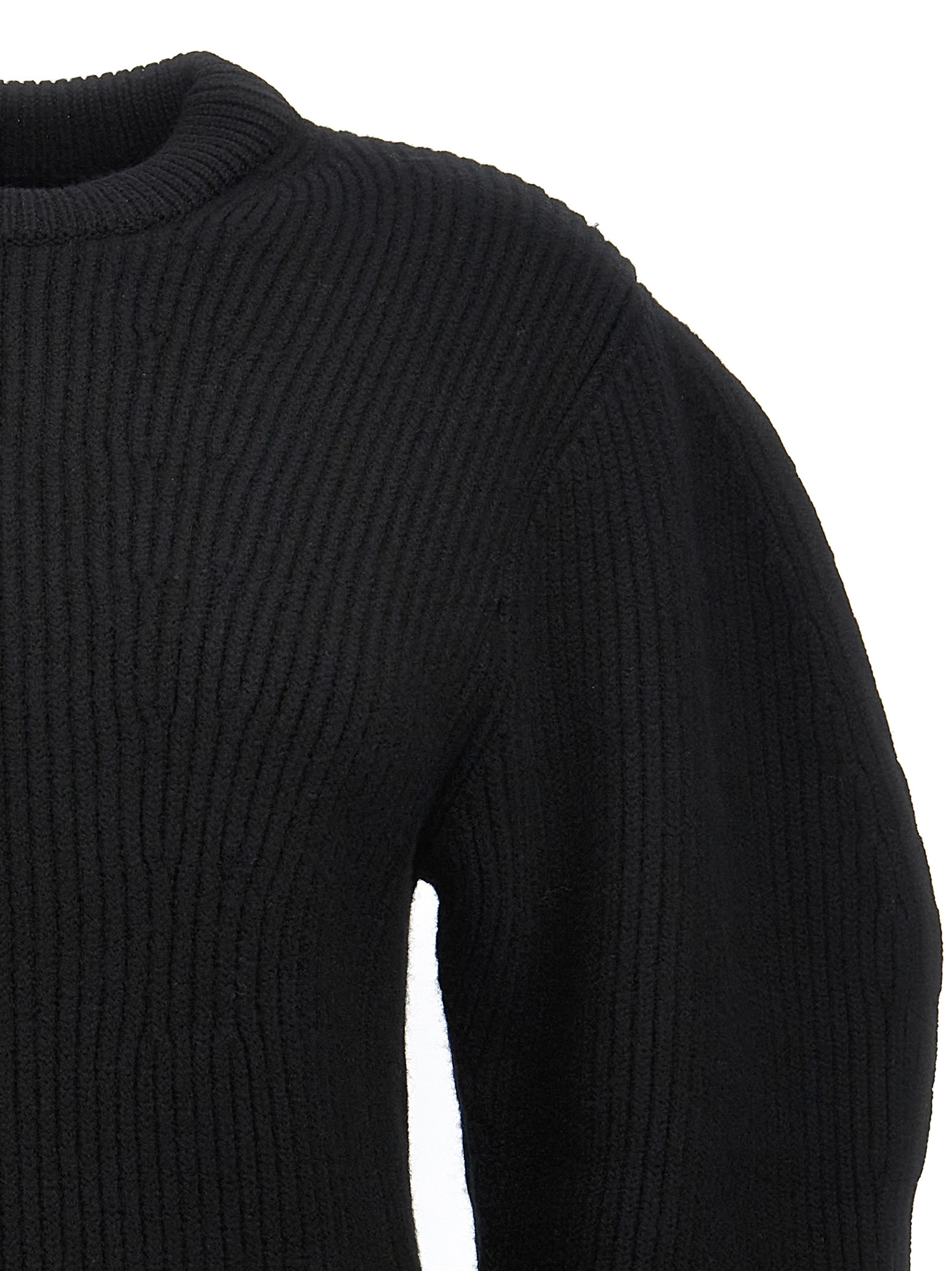 Ribbed wool sweater with crew neck and long cuffed sleeves.