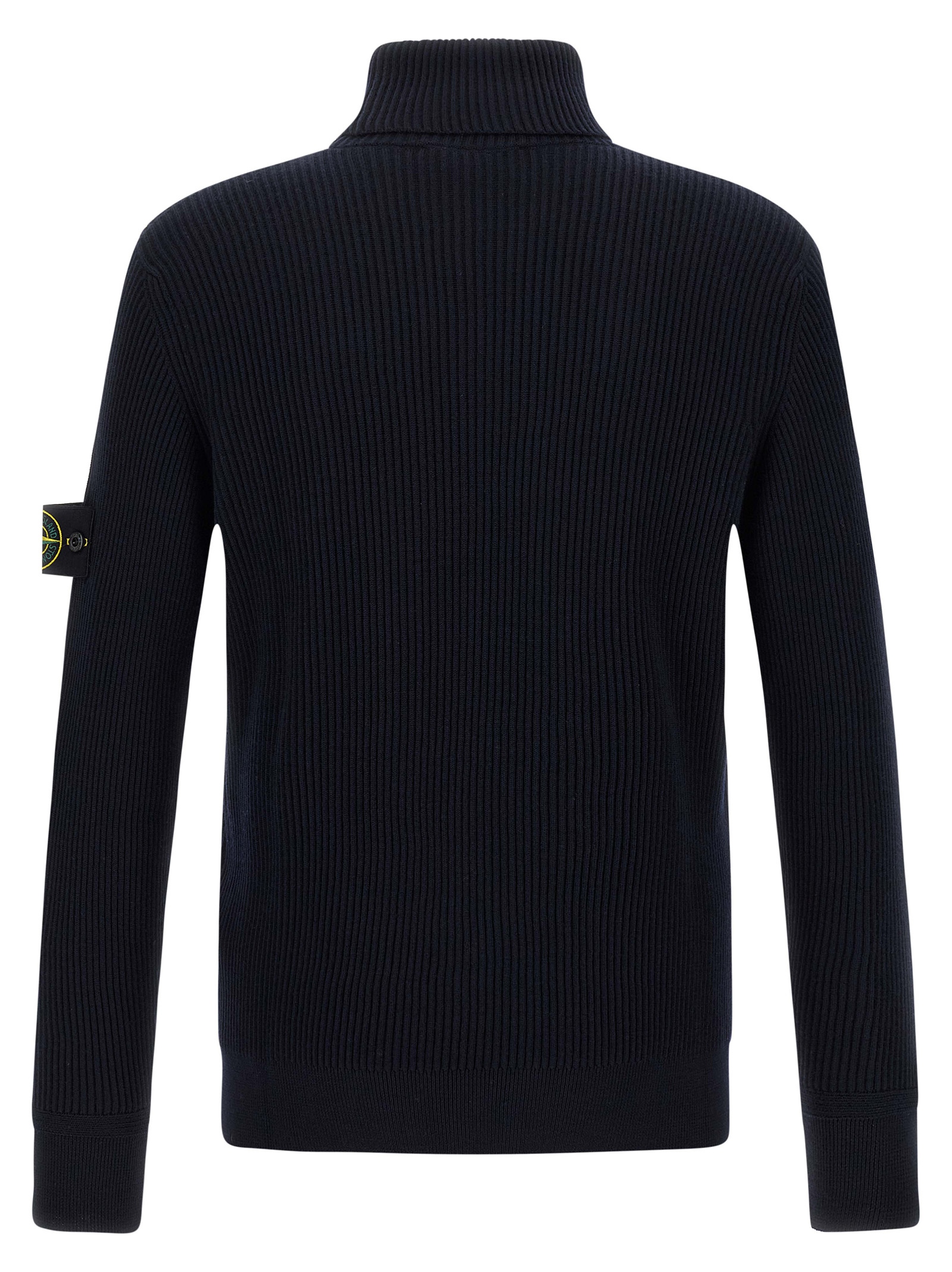 Ribbed virgin wool sweater with turned-up high neck, long cuffed sleeves, dropped shoulders and logo badge.