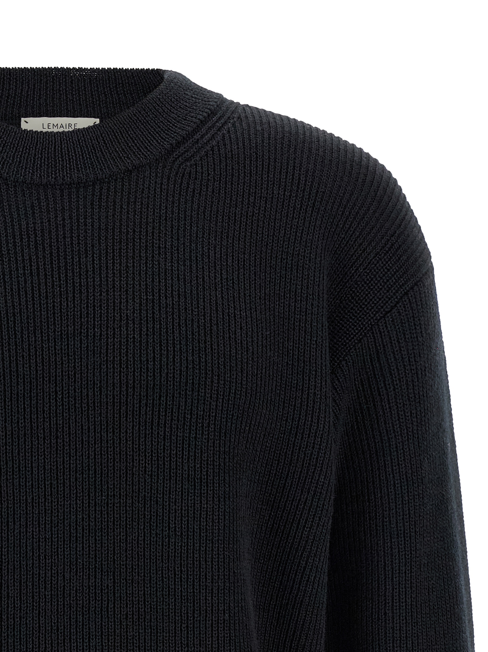 Ribbed virgin wool crewneck sweater with long sleeves with cuffs and dropped shoulders.
