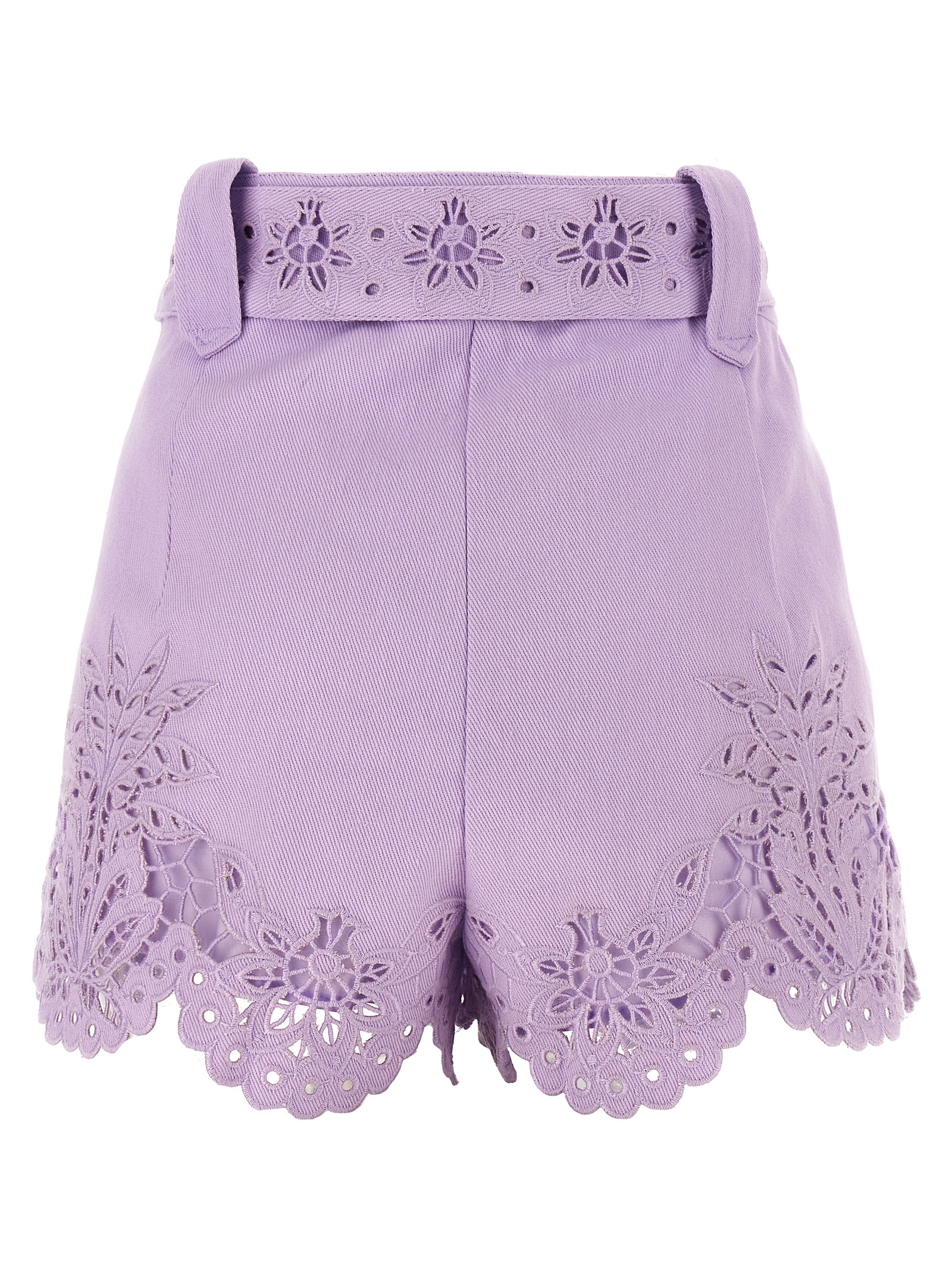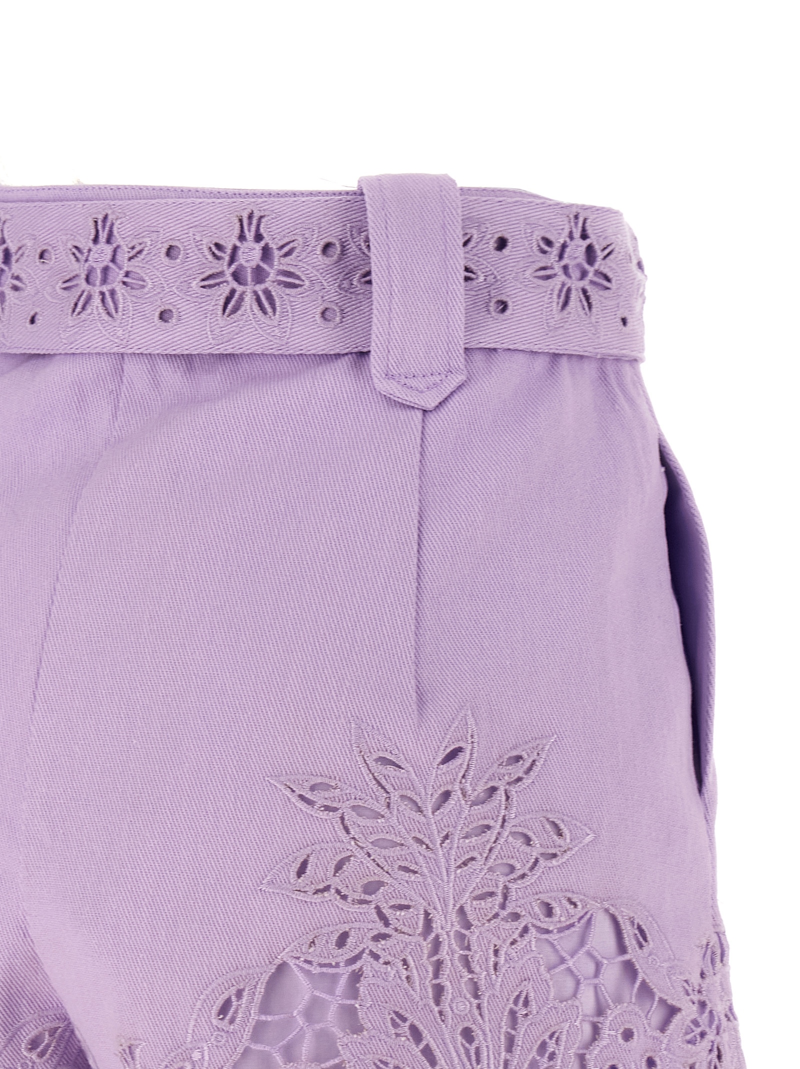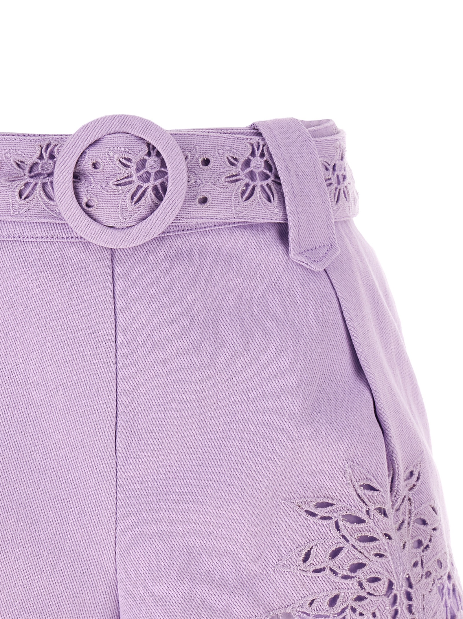 Twill shorts with ‘Richelieu’ cut-out embroidery, front and back pincer, side zip closure, French pockets, lining, removable matching belt.