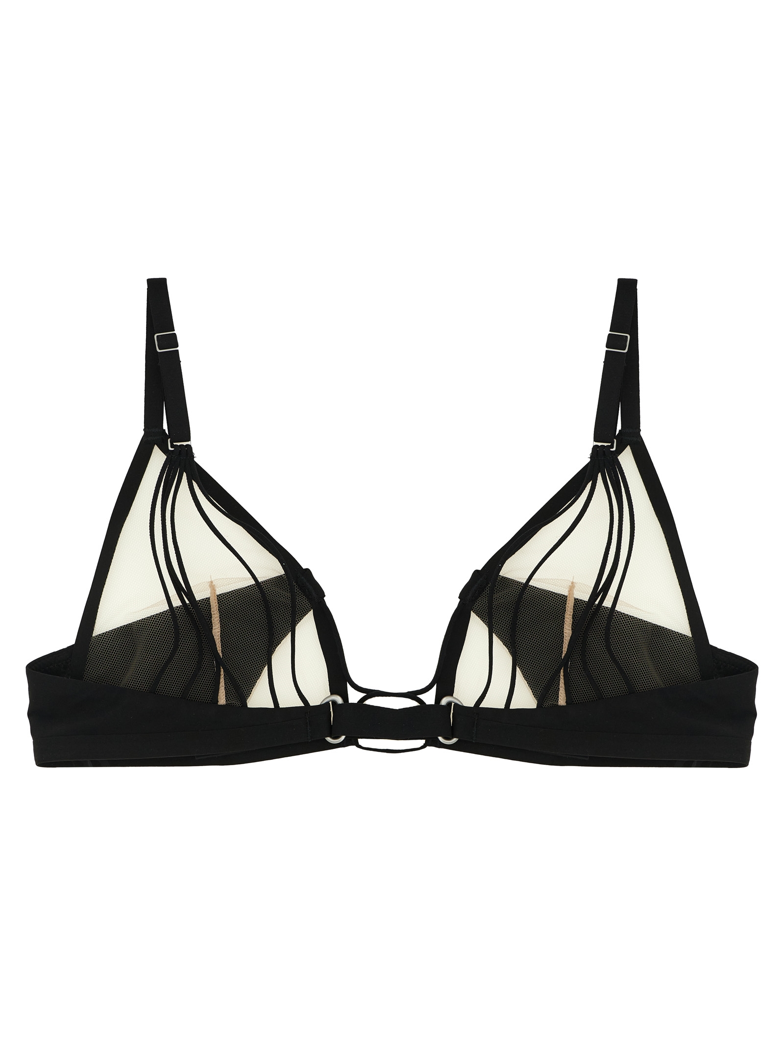 Rick Owens x LIVY ‘Raw District’ triangle fabric bra with tulle inserts, adjustable shoulder straps, metal carabiner closure with bolts to be unscrewed at the back.