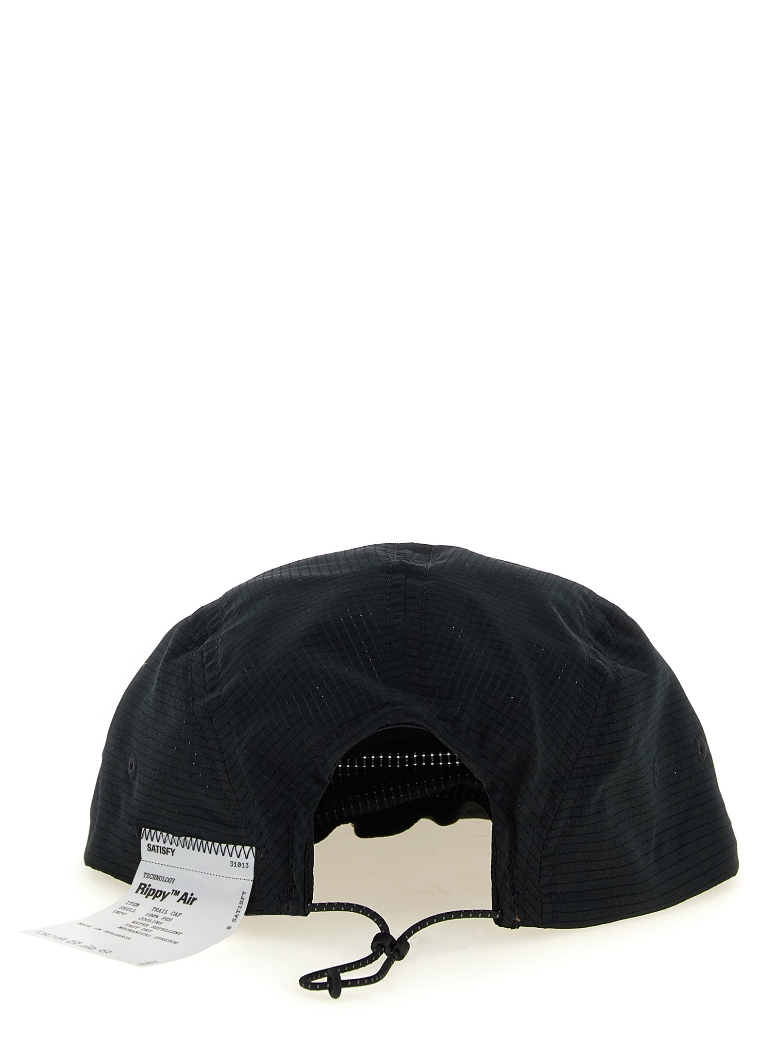 Ultralight, water-repellent, quick-drying, odor-resistant Rippy™ Air openwork ripstop fabric cap Rippy™ Air Trail with grid weave construction, short visor, reflective ‘©SATISFY’ logo print on the front, back drawstring, and completely detachable washing instruction label on the outside.
