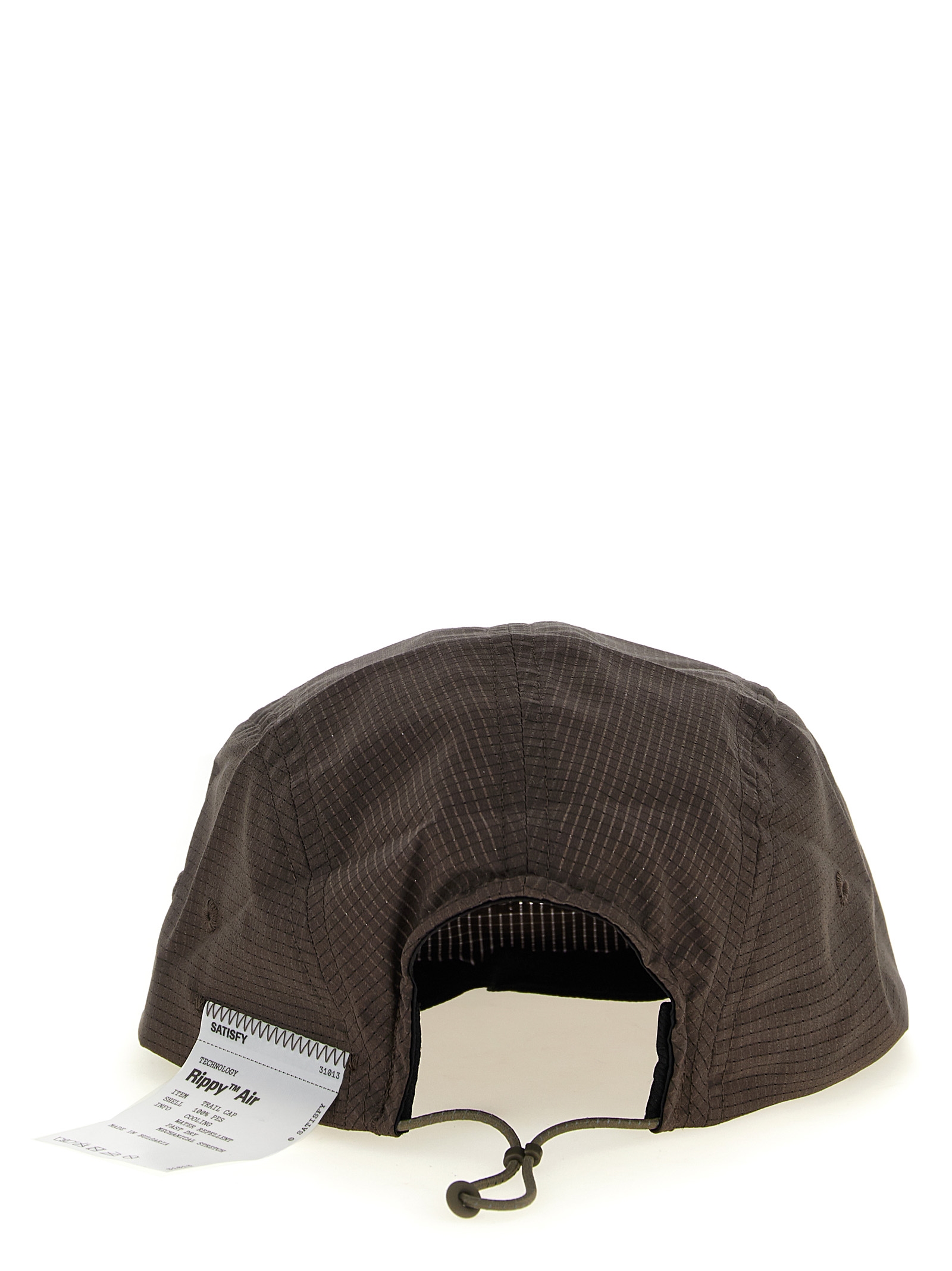Ultralight, water-repellent, quick-drying, odor-resistant Rippy™ Air openwork ripstop fabric cap Rippy™ Air Trail with grid weave construction, short visor, reflective ‘©SATISFY’ logo print on the front, back drawstring, and completely detachable washing instruction label on the outside.