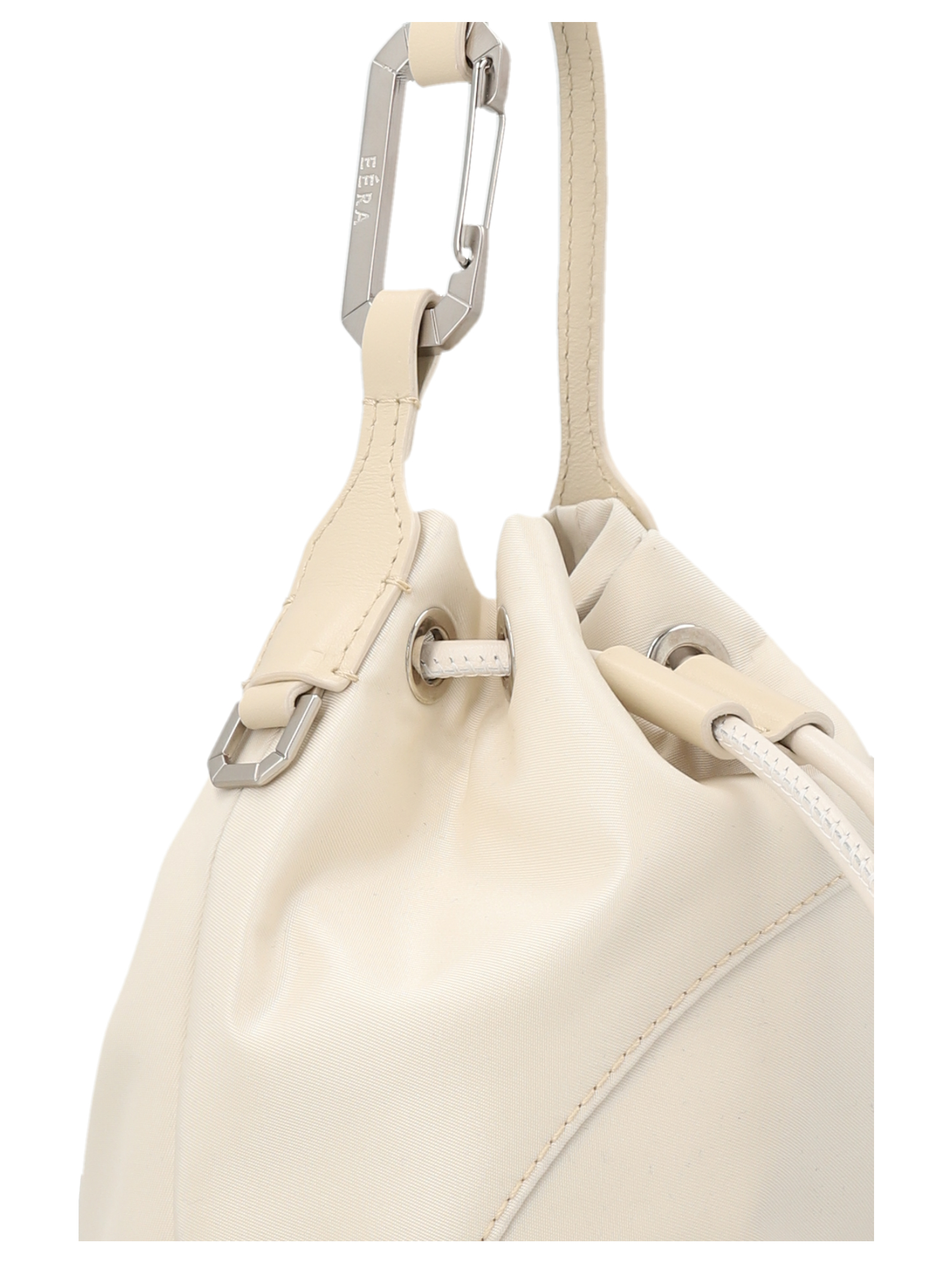 ‘Rocket Small’ nylon handbag with drawstring closure, leather details, iconic metal buckle, adjustable and removable leather shoulder strap.er strap.