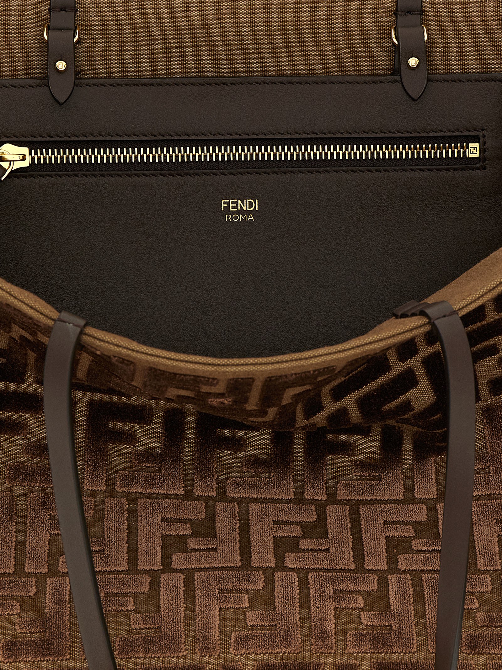 Roll Large’ reversible shopping bag in all-over embossed FF jacquard velvet and solid canvas, double fixed leather handle, removable inner leather pocket.