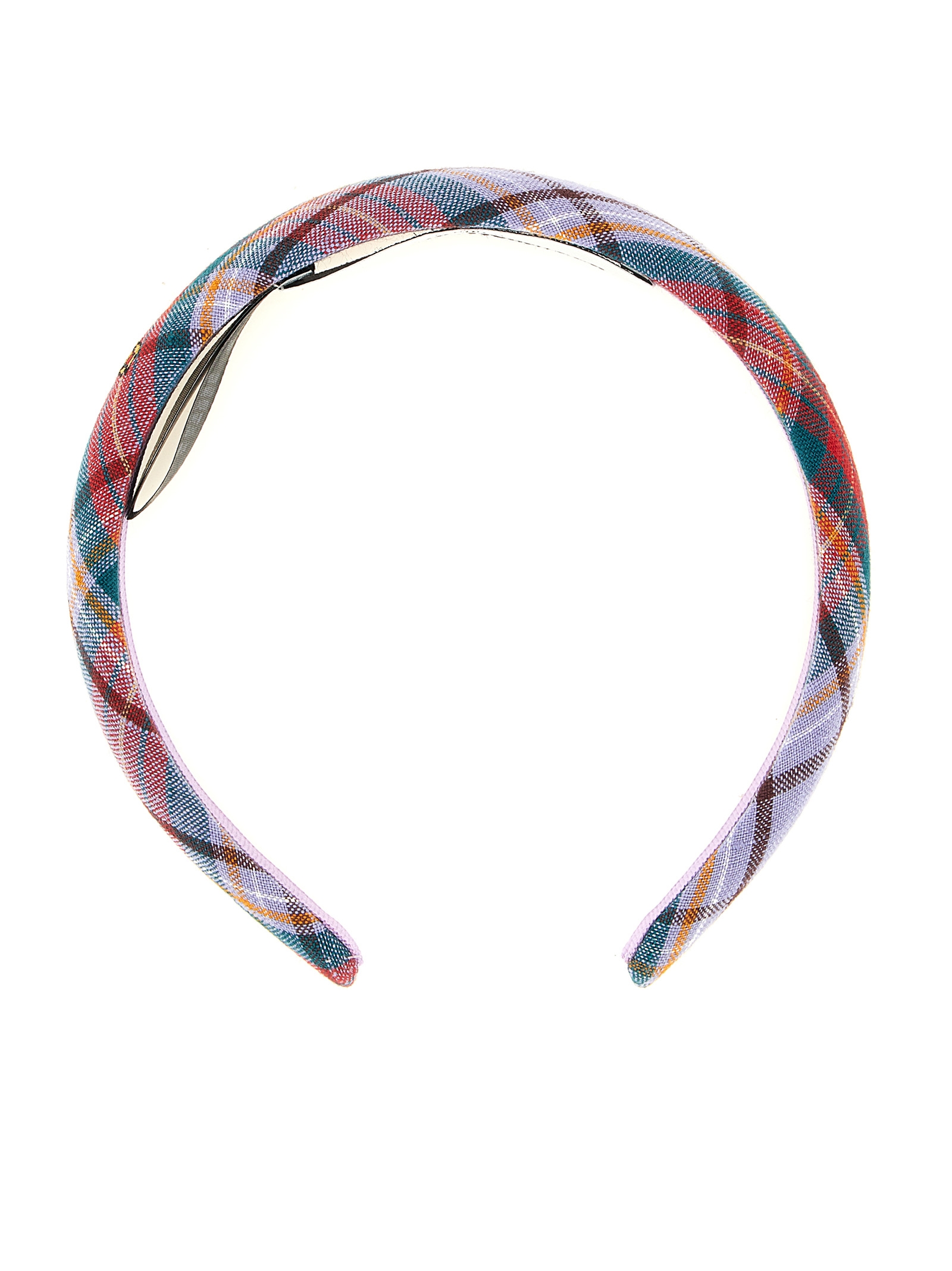‘RTW Tartan Slim’ headband in padded linen with ‘Louth Tartan’ pattern, ‘Orb’ embroidery.