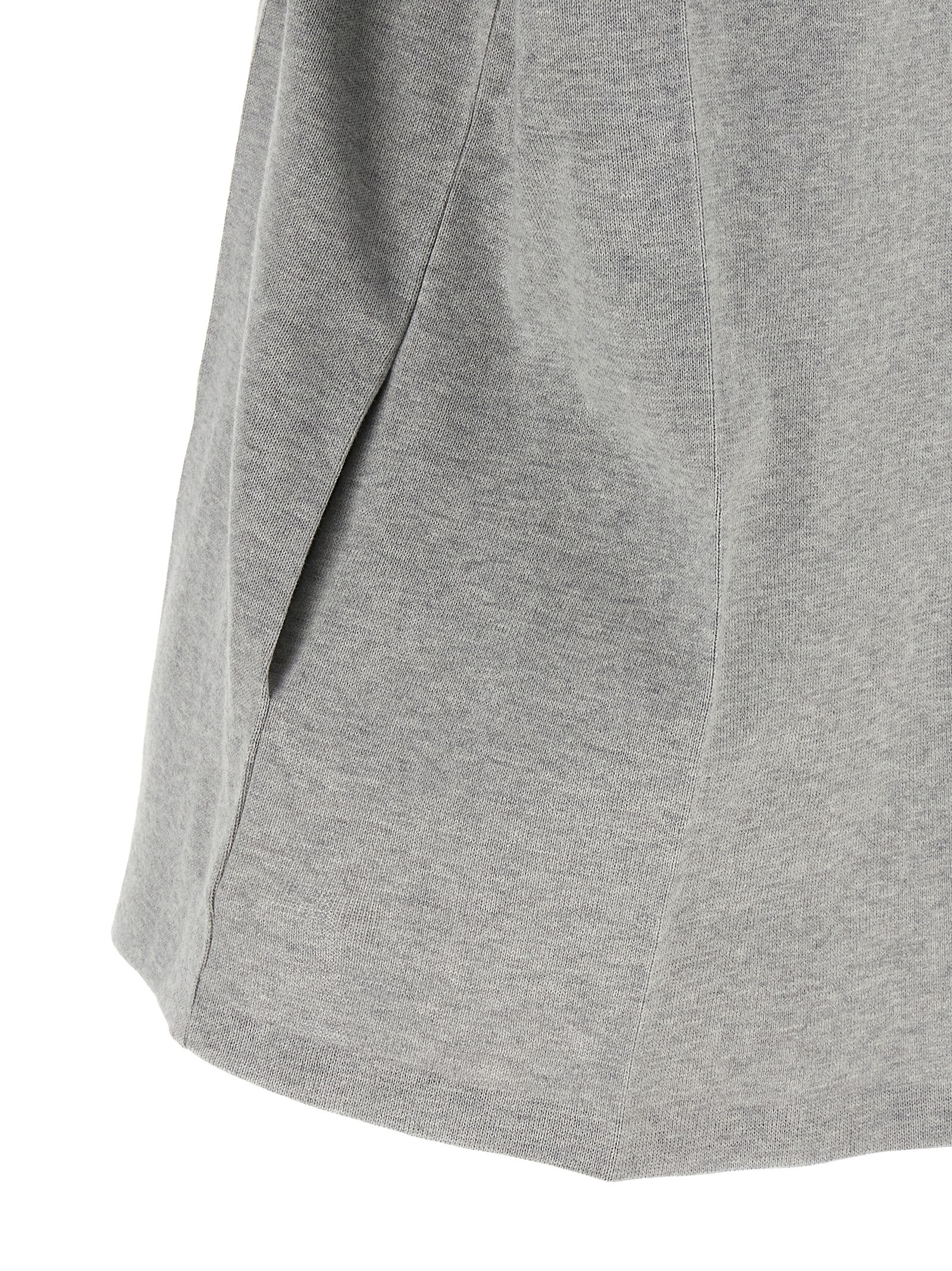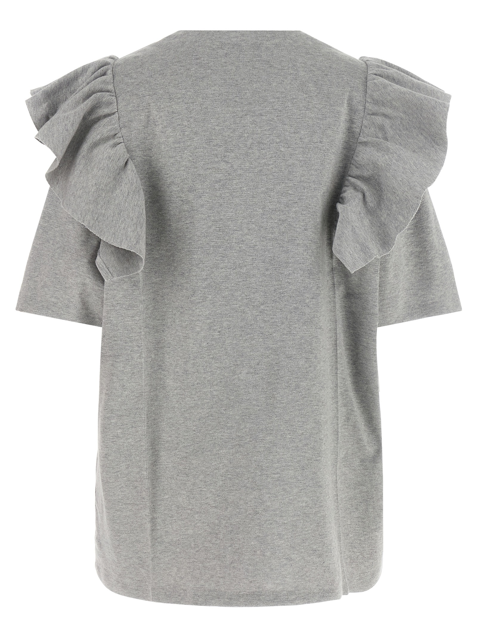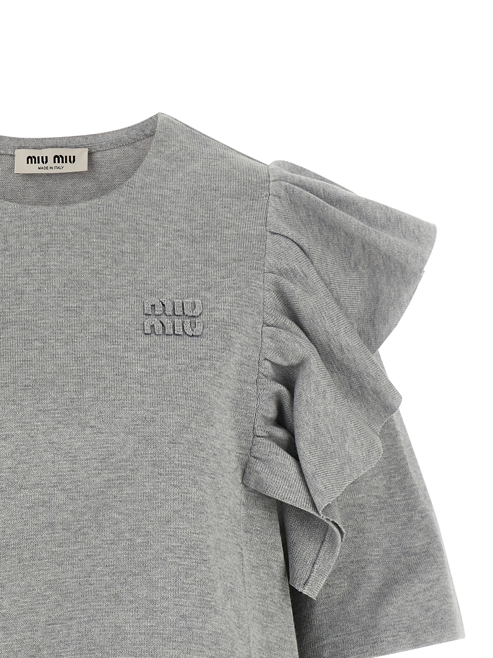 Mini dress in starched cotton 12 mélange fineness, ruffles and tone-on-tone lettering logo patch, slightly flared silhouette, crew neck, short sleeves.