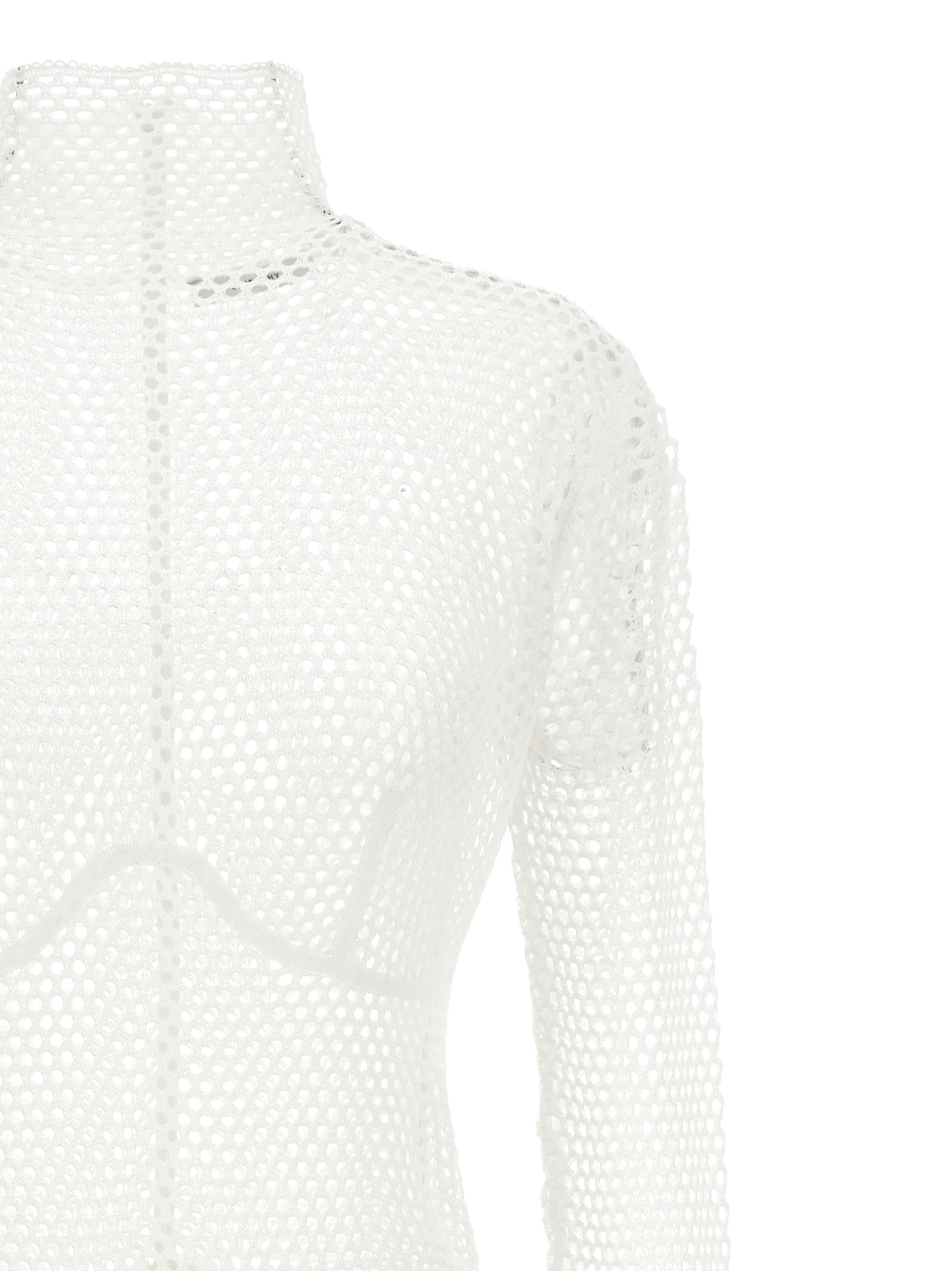 Semi-transparent mesh dress with tone-on-tone grosgrain details, high neck, long sleeves, back zip closure, voluminous ruffle hem and organza inside.