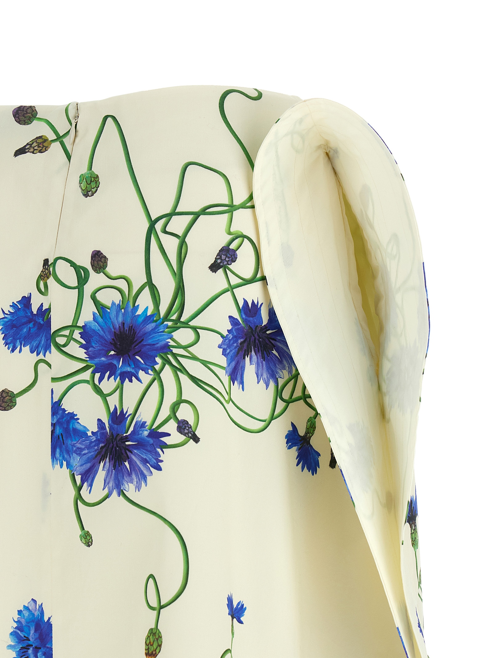 Long skirt in all-over floral print cotton, high waist, tone-on-tone double layer ruffles, back zip closure, side slits, rounded hem.