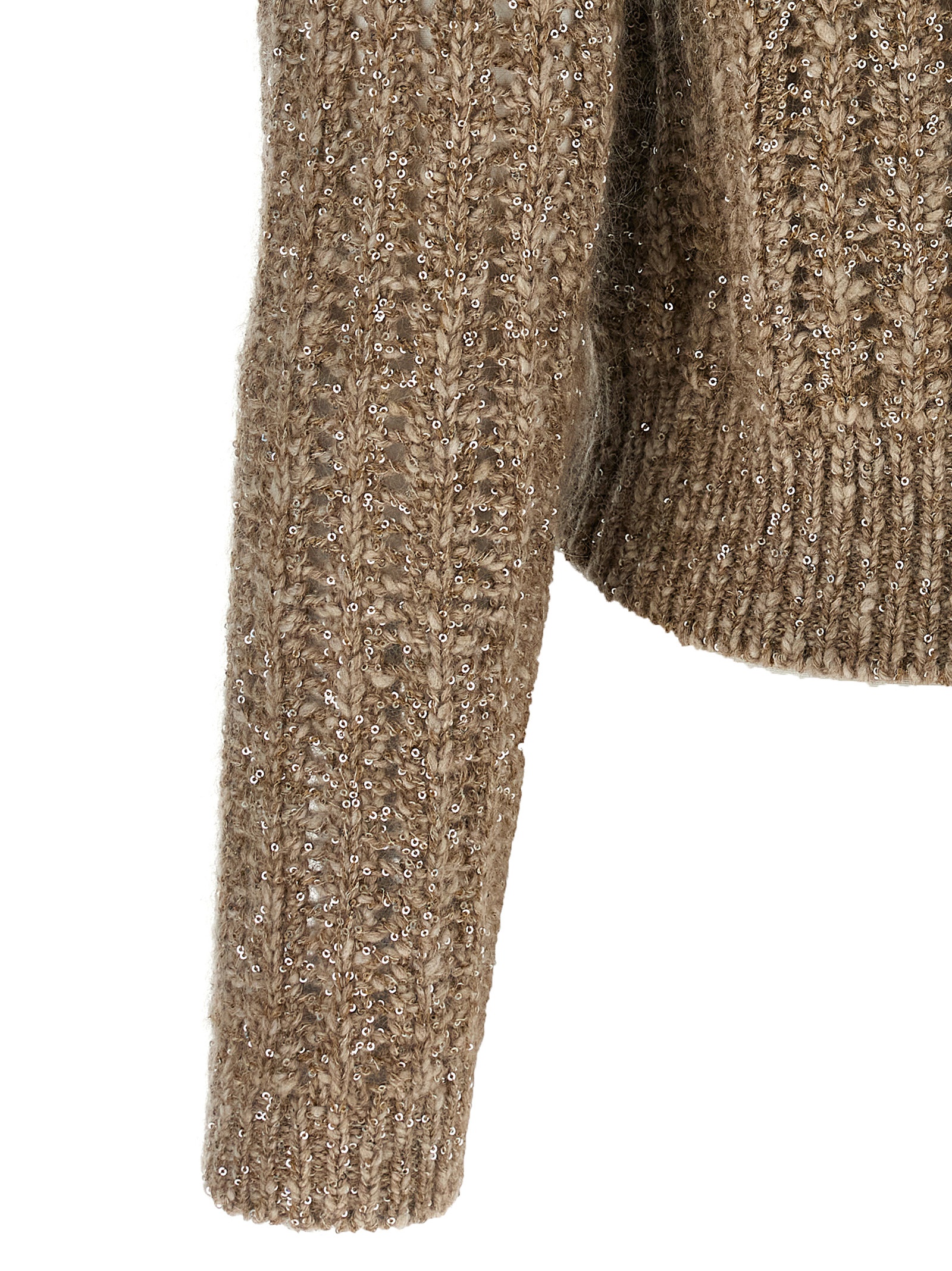 Rustic Dazzling Net’ wool blend sweater with perforated crochet and all-over sequin appliqué, crew neck, long cuffed sleeves.