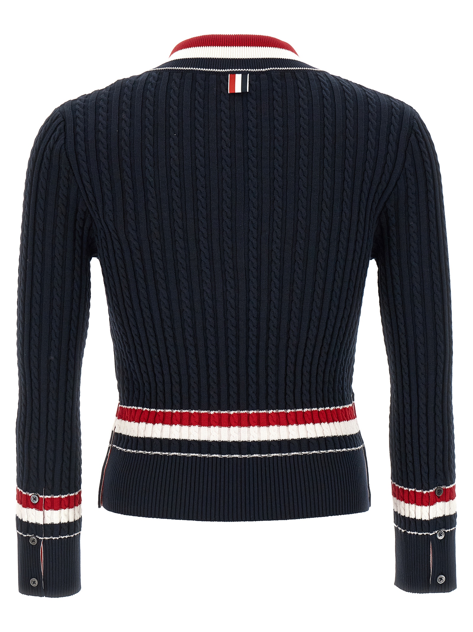 Braid cotton sweater with RWB tape inlays, V-neck, long sleeves with button cuffs and RWB grosgrain tape inside, side slits with buttons and inner grosgrain RWB tape.