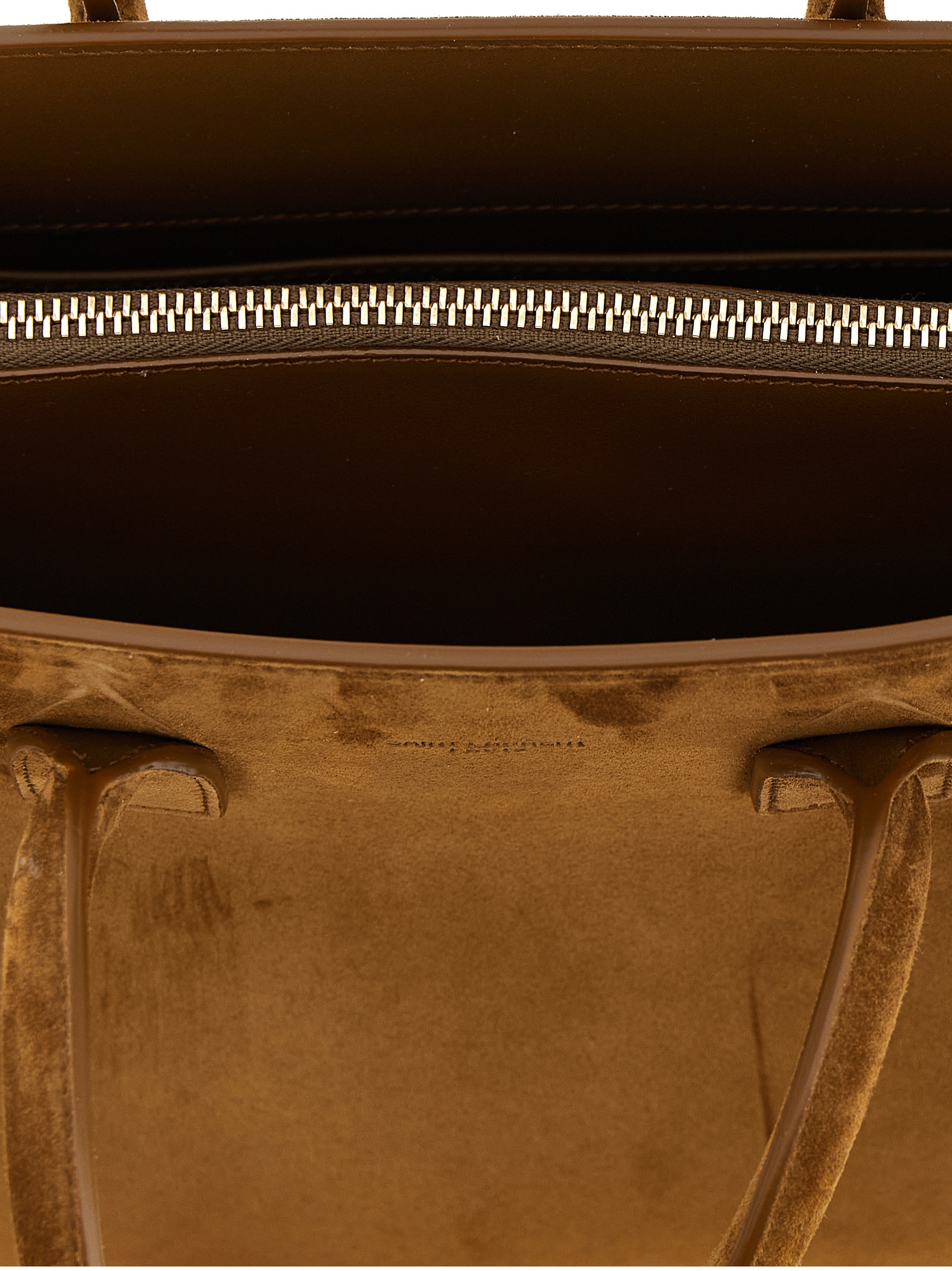 Baby suede ‘Sac De Jour’ handbag with front embossed logo, side gussets with straps, double fixed tubular handle, rigid base with metal feet, removable metal padlock detail, adjustable and removable shoulder strap.