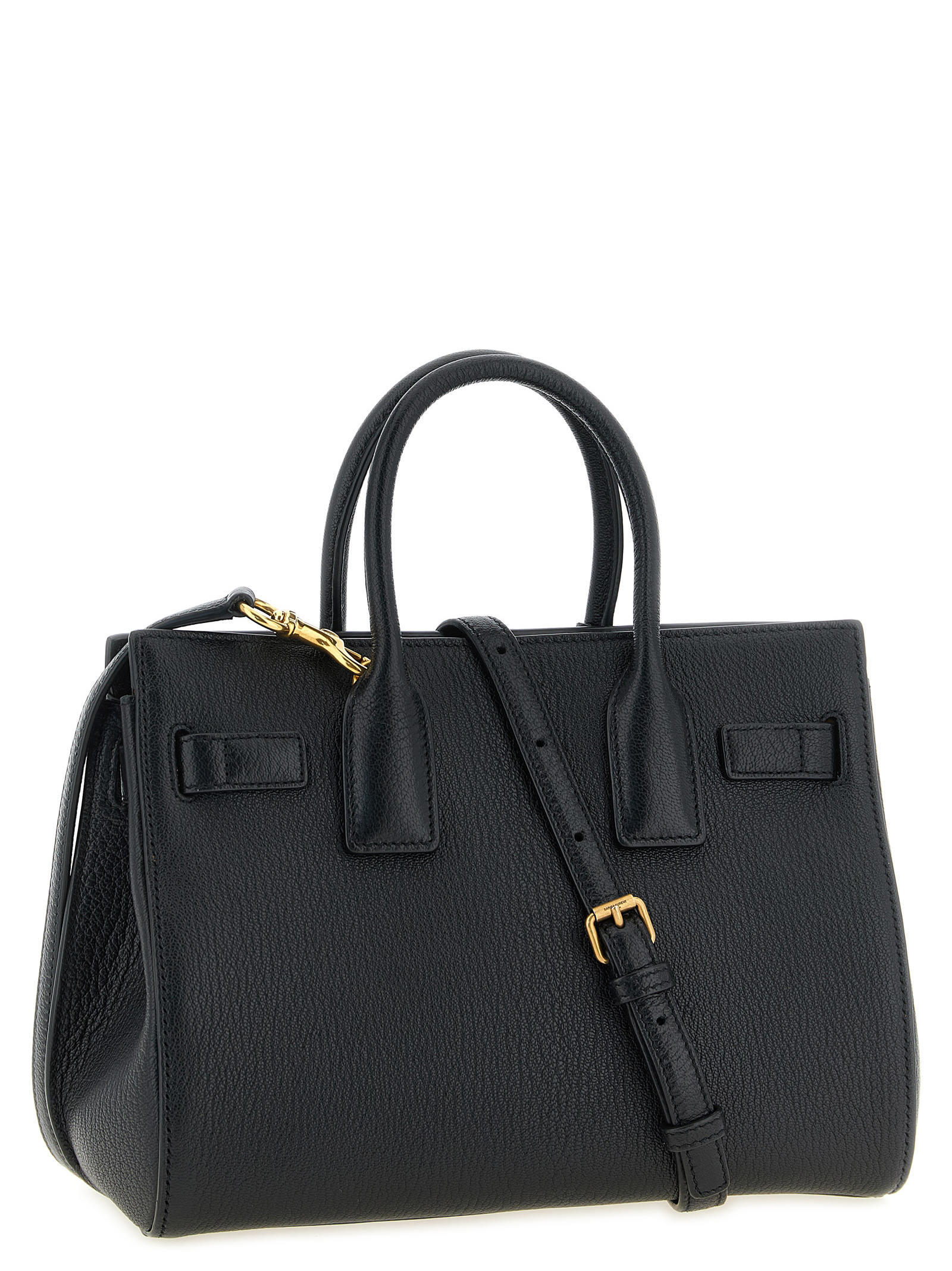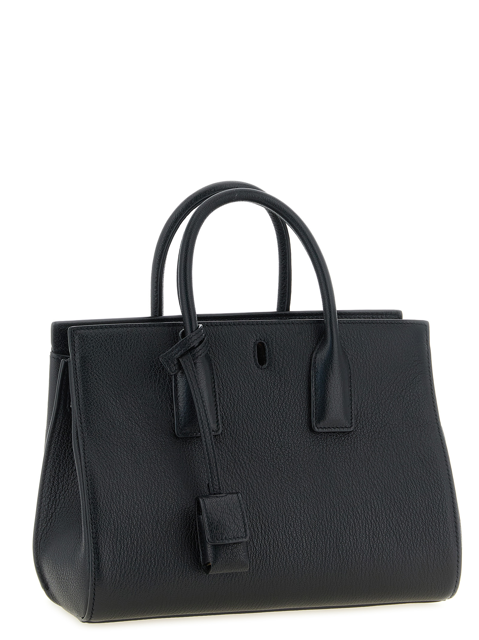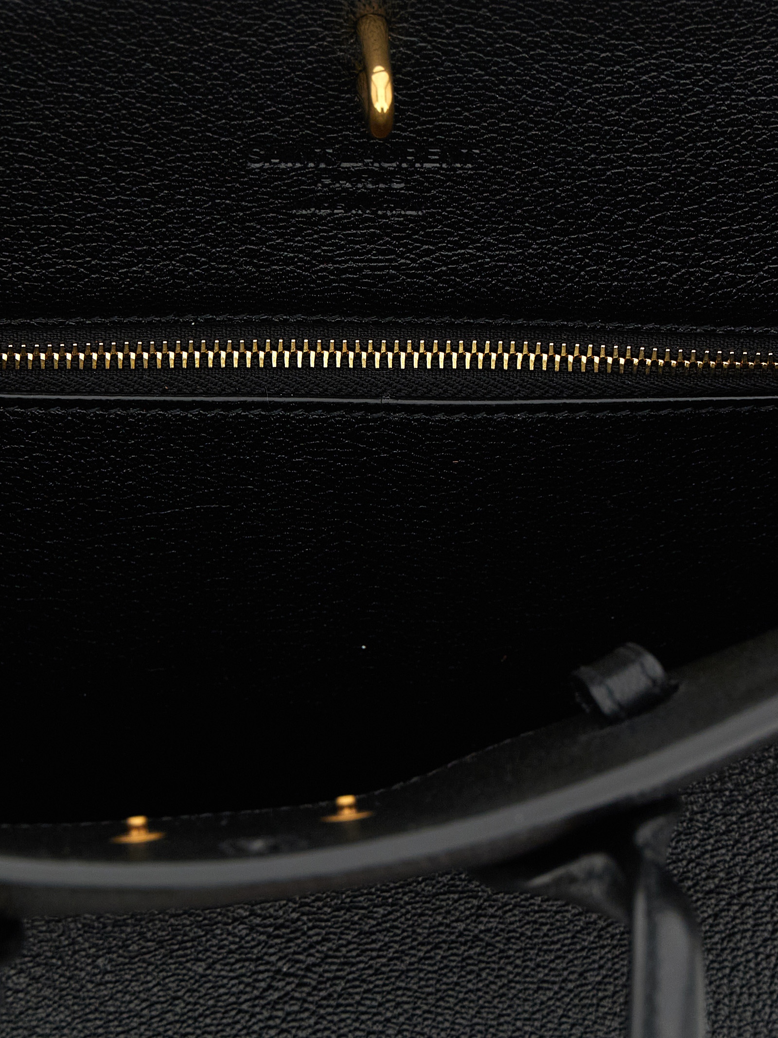Small hammered leather ‘Sac De Jour’ handbag with East-West design, extendable side gussets with internal adjustable straps, double fixed tubular handle, rigid base with metal feet, removable metal ‘Cassandre’ padlock detail, adjustable and removable leather shoulder strap, adjustable and removable tape shoulder strap.