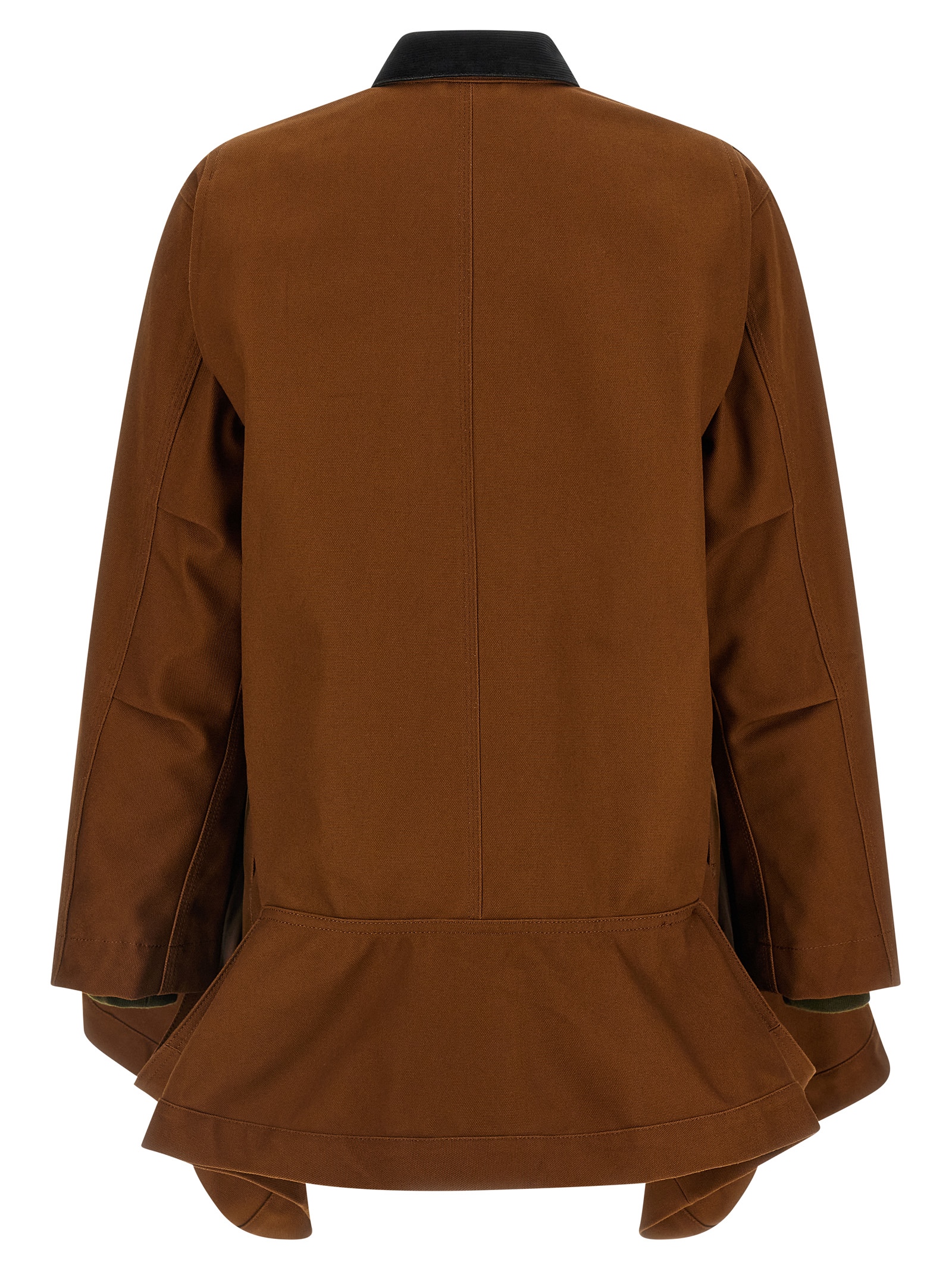 Sacai x Carhartt Wip capsule jacket in heavy cotton canvas with corduroy shirt collar, logo patch and front zip and snap button closure, pockets, long sleeves with contrasting knitted cuffs, peplum on the hem.