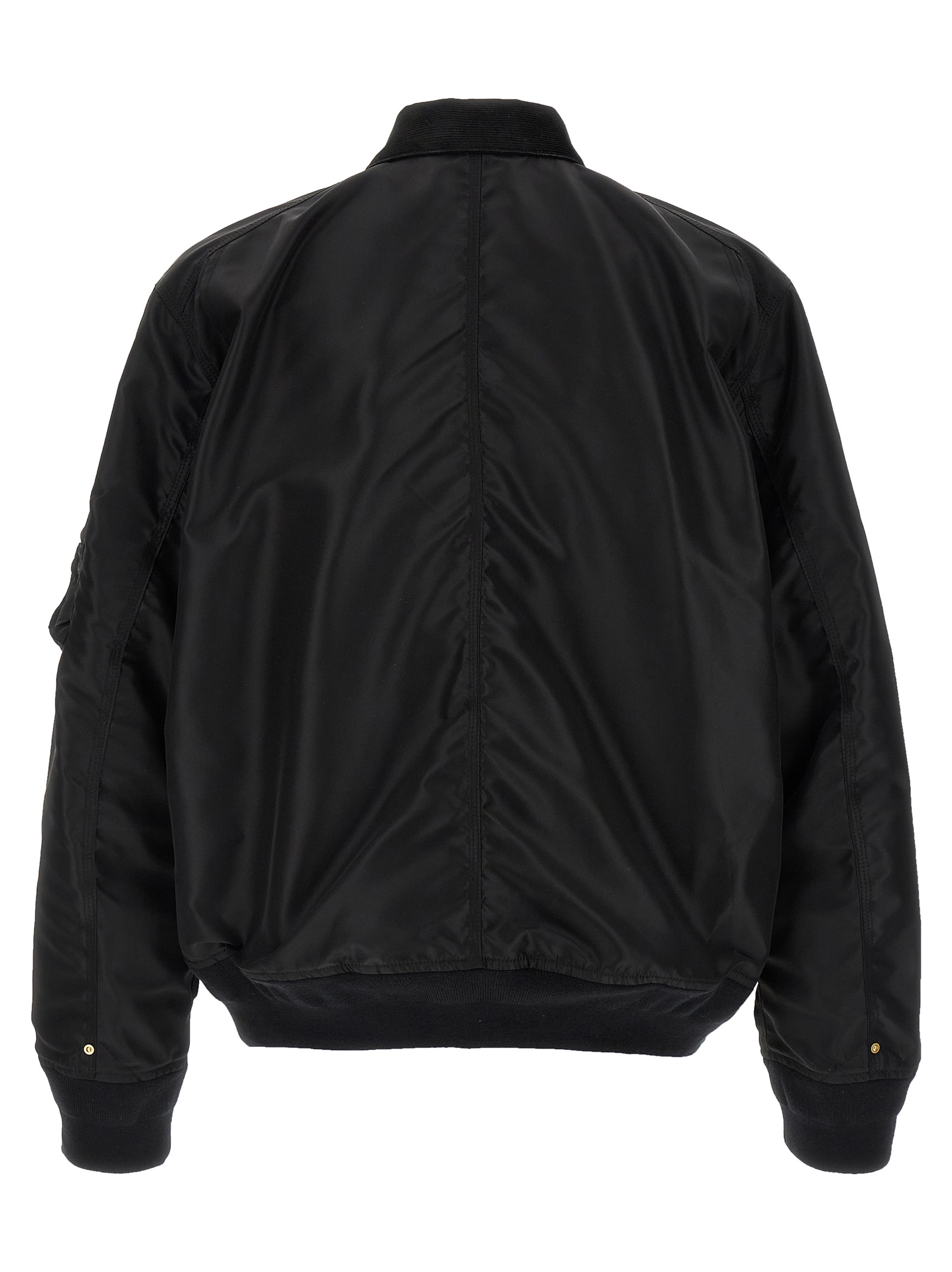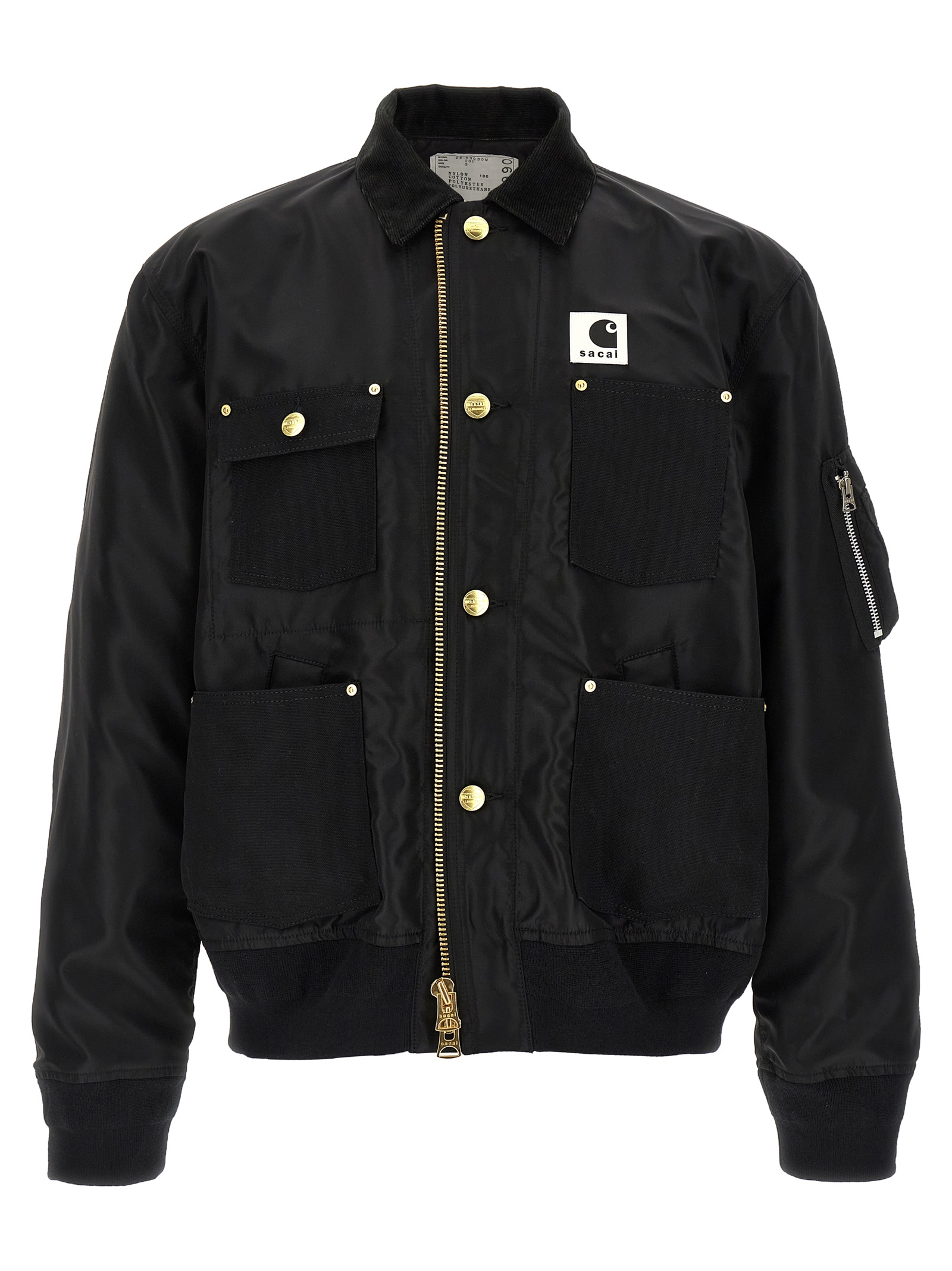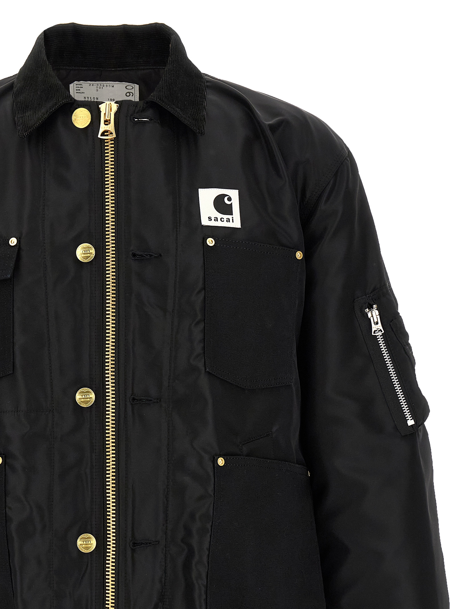 Sacai x Carhartt WIP ‘Duck’ jacket in 12oz Dearborn cotton canvas and tone-on-tone nylon twill with contrast corduroy collar, logo patch and front zip and button closure, pockets, long sleeves with stretch ribbed knit cuffs and dropped shoulder, stretch ribbed knit band on the hem. Lining.