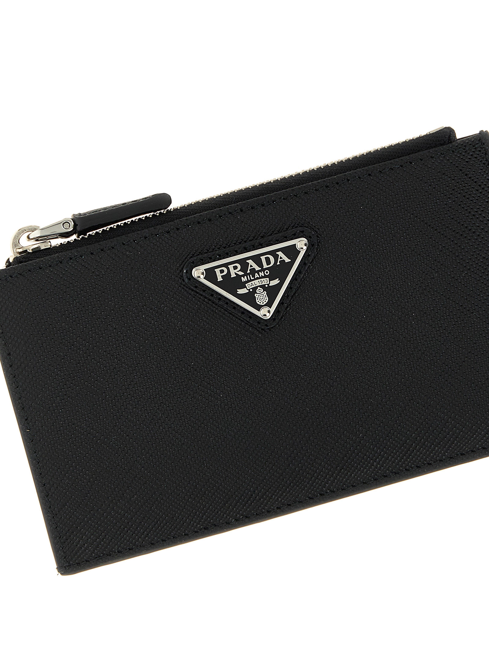 Saffiano leather card holder, zip pocket and triangle logo in enameled metal on the front.