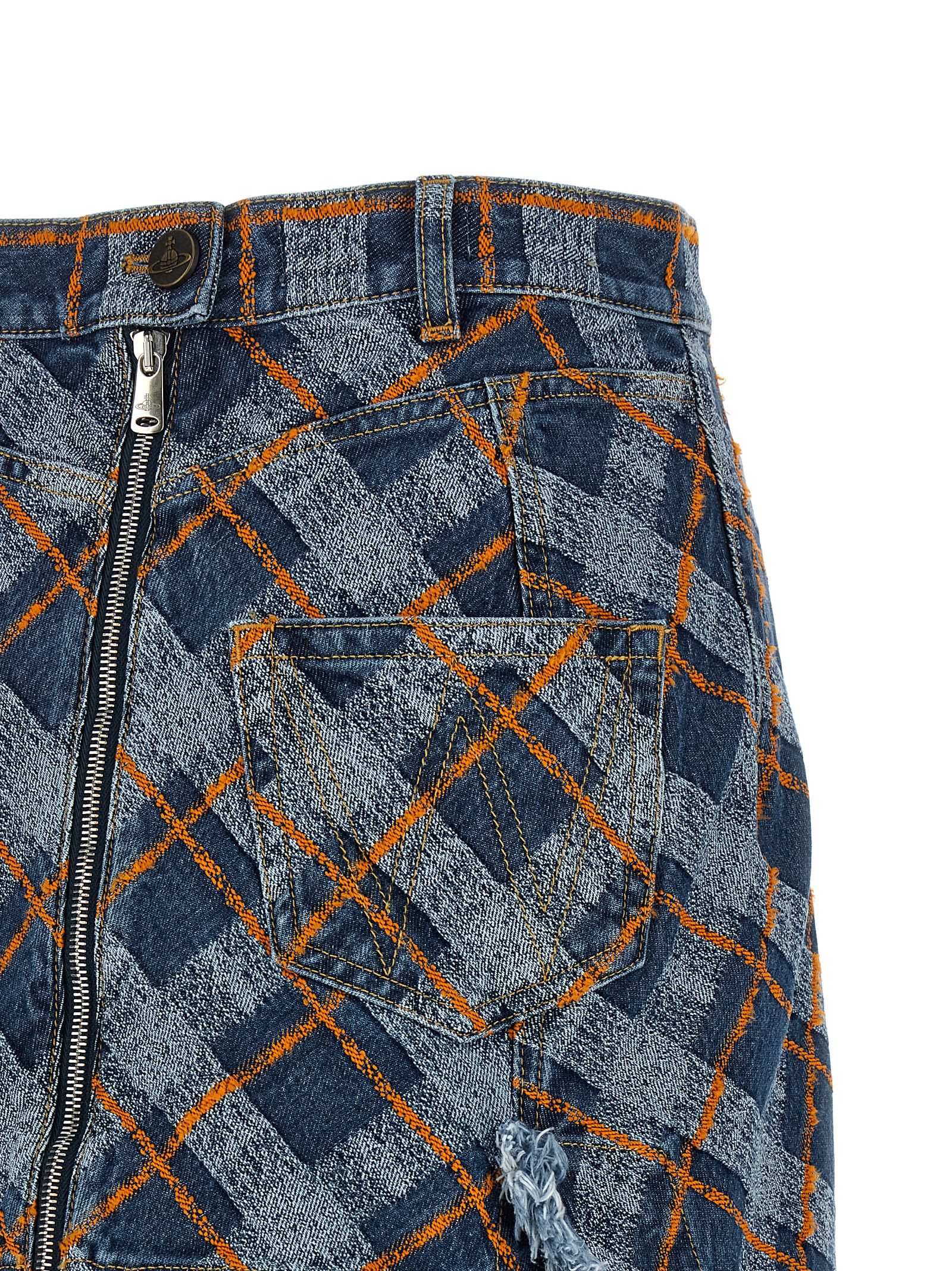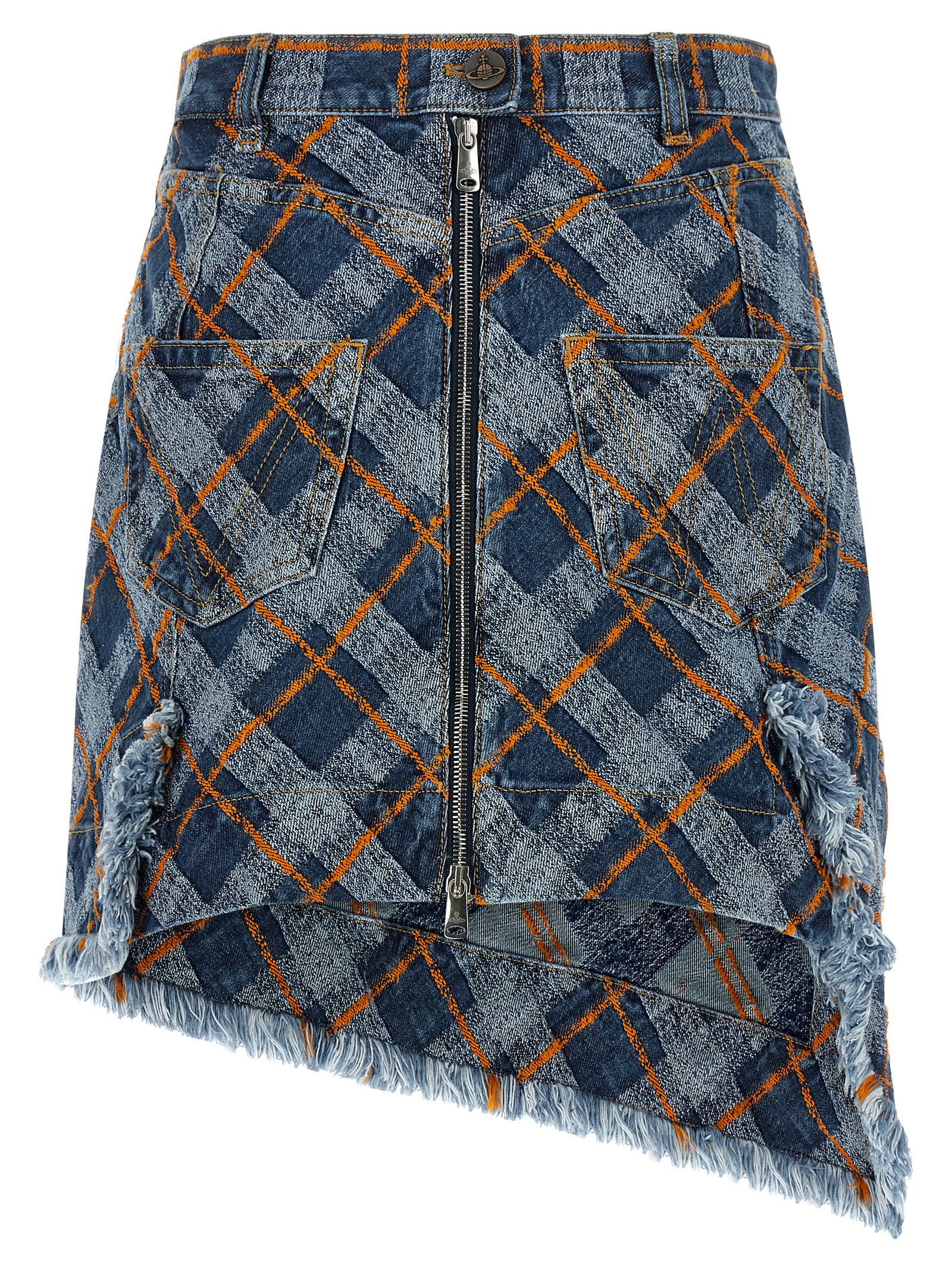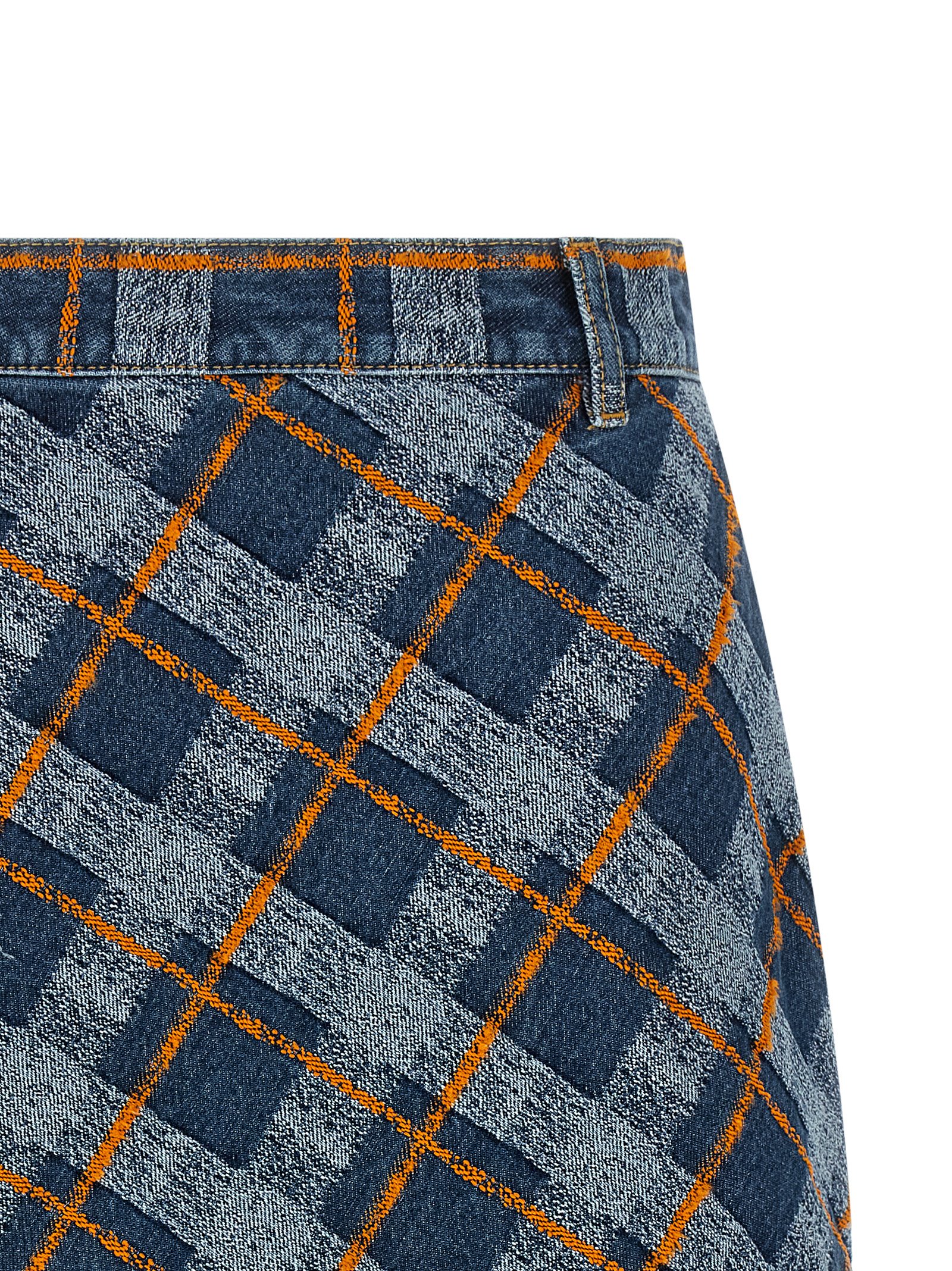 ‘Sailor’ mini skirt in jacquard tartan denim cotton denim with contrast stitching, panel construction, frayed hems, flared silhouette, front zip and button closure, pockets, asymmetrical hem.